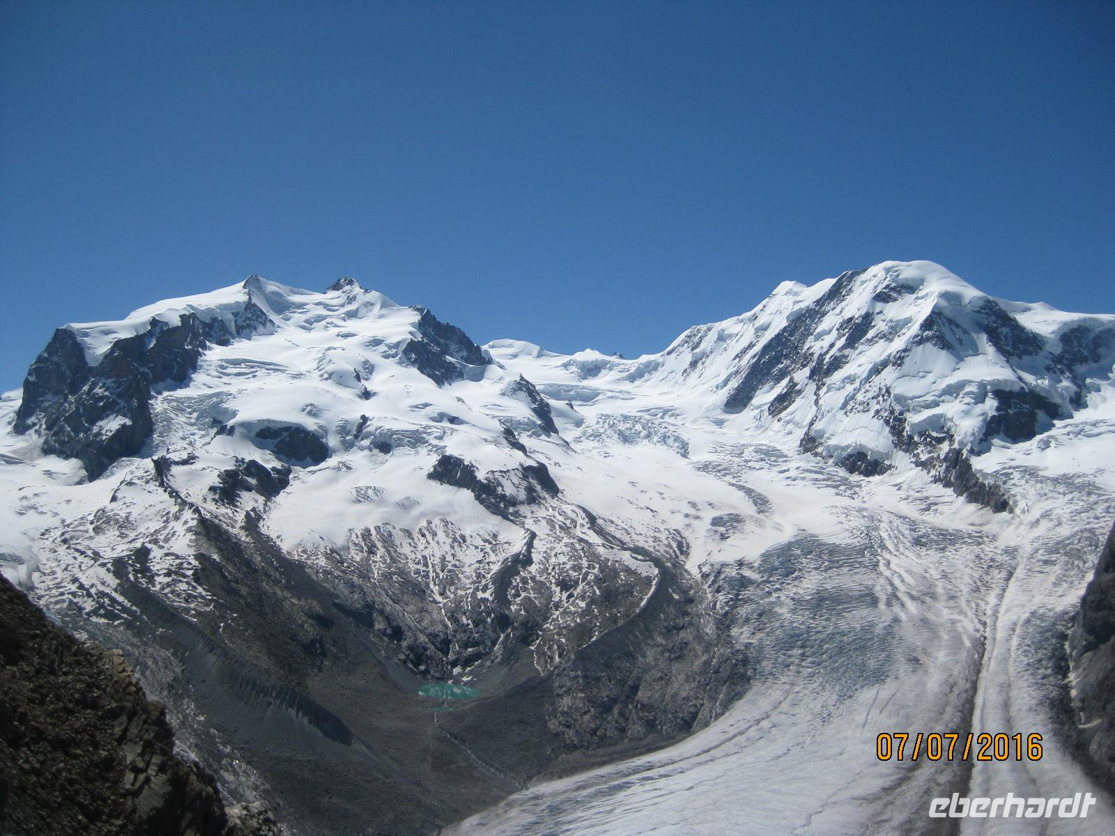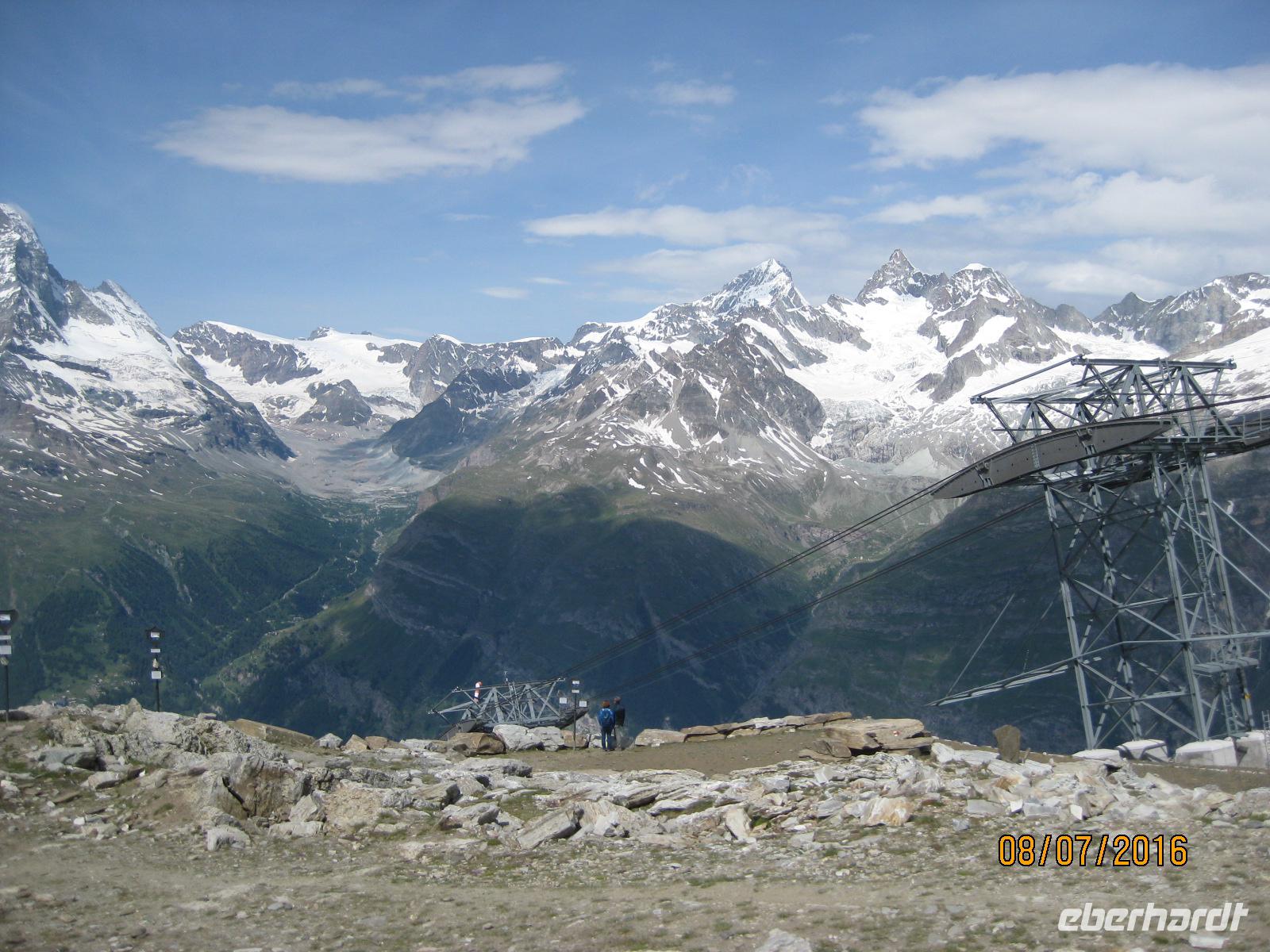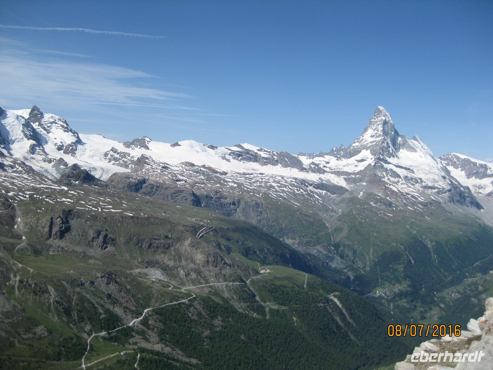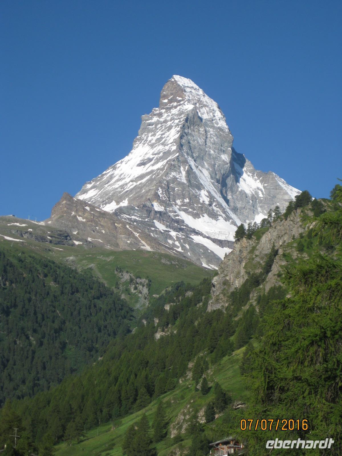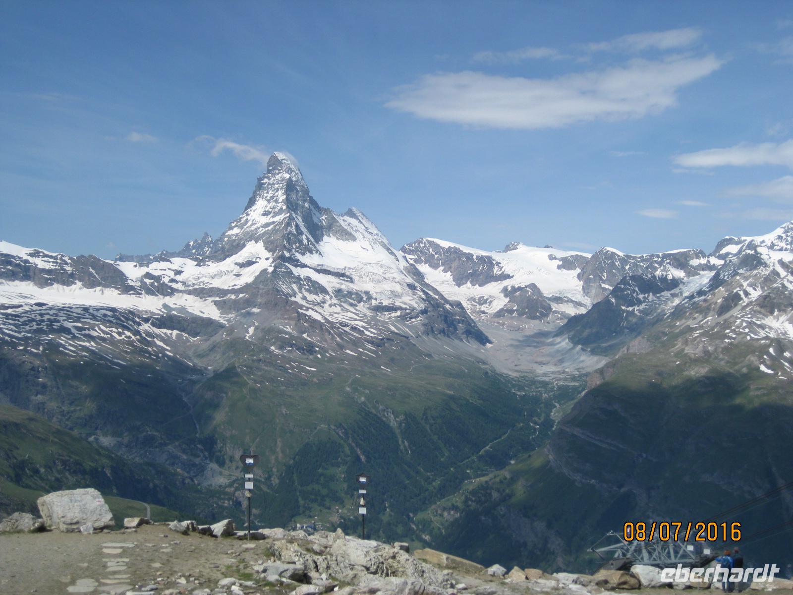 Zermatt ist ein wahrer Knotenpunkt sämtlicher Bergbahnen, welche auf die umliegenden Berggipfel führen. Mit der Gornergratbahn fahren wir heute gemeinsam auf 3.089 Meter Höhe. Die Strecke der Bahn ist neun Kilometer lang. Mit Zahnantrieb werden bis zu 20% Steigung überwunden. Bis nach ca. 45 Minuten Fahrtzeit der höchste Punkt der Strecke erreicht wird. Der Blick ist sagenhaft. Strahlend blauer Himmel und in der Mitte das Matterhorn, welches mit seiner geraden Spitze in die Luft ragt. Dieser markante Gipfel zieht jeden Blick auf sich. Bei angenehmen Temperaturen genießen wir einen herrlichen Rundumblick auf die Gipfel- und Gletscherwelt. Eine Station unterhalb lohnt sich der Gang zum Riffelsee. Im See spiegelt sich die Spitze des Matterhorn und lädt zum Verweilen ein. Der restliche Nachmittag steht Jdem von uns für einen Bummel durch den Ort zur freien Verfügung.