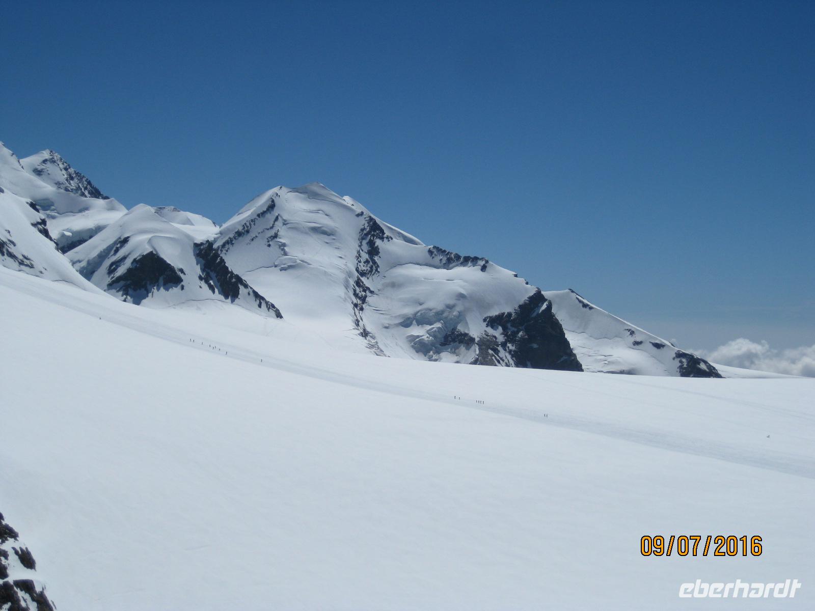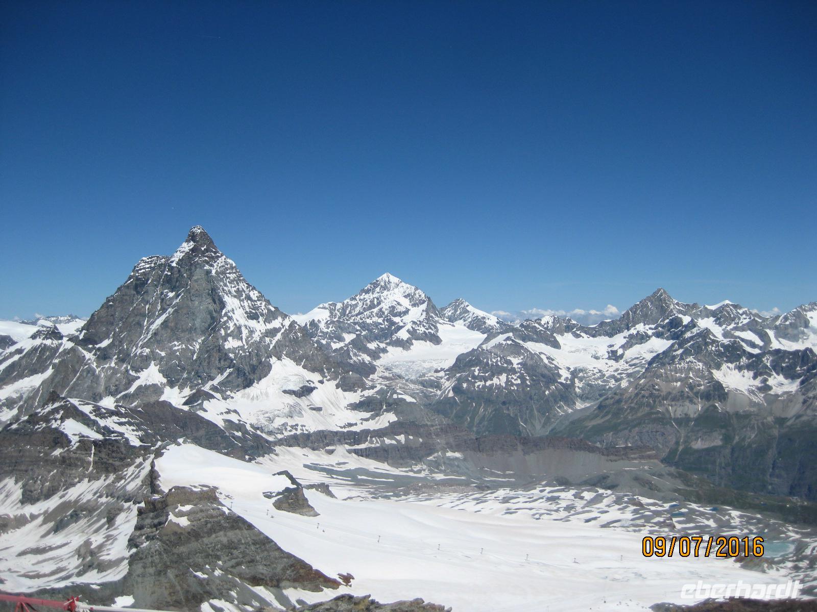 Auch der heutige Tag steht noch einmal zur freien Verfügung. Den strahlenden Sonnenschein nutzen Einige von uns für eine Fahrt auf das Kleine Matterhorn oder für einen Spaziergang durch Zermatt oder eine kleine Wanderung in der Region. Mehrere Seilbahnen bringen uns auf das Kleine Matterhorn mit 3.883 Meter Höhe. Bereits auf den Zwischenstationen Schwarzsee und Trockener Steg genießen wir erste Blicke über die Gipfel und Landschaft. Nun möchten wir die letzte Etappe meistern und fahren mit der Gondelbahn bis auf das Kleine Matterhorn. Von hier genießen wir nicht nur einen fanatastischen Blick zum Matterhorn sondern können ebenfalls die Bergsteiger beim Aufstieg zum Breithorn beobachten. Ebenfalls lohnt ein Besuch der Eisgrotte, aus Eis geschnitzte Figuren beeindrucken uns. Am Nachmittag hat noch einmal jeder ganz für sich die Zeit, um Souvenirs für die Lieben daheim zu besorgen, bevor wir bereits am nächsten Tag in Richtung Säntis aufbrechen.