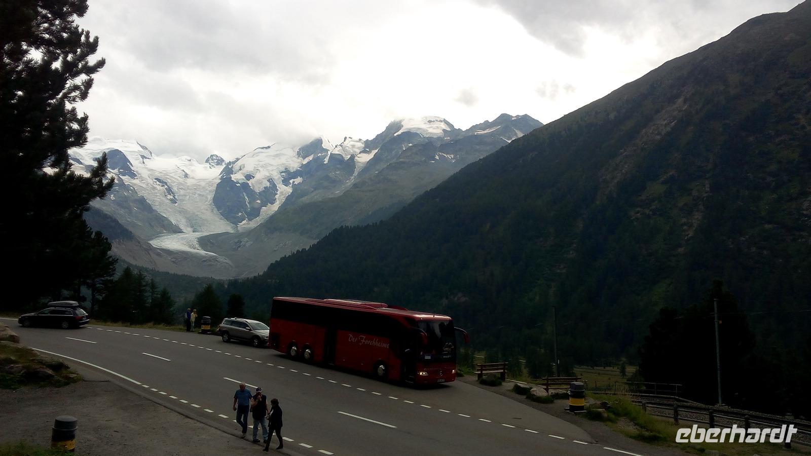 Nach dem Frühstück fahren wir nach Pontresina. Auf der Strecke passieren wir unseren ersten Pass, den Flüela mit 2383 m. Unser Fahrer Frank bewältigt die Kehren sicher und perfekt. Somit können wir uns voll und ganz auf die Bergwelt konzentrieren. Die Berge, die Bergwiesen und die Fahrt am Inn entlang ist schon ein Erlebnis. Wir wollen aber nach Pontresina, um mit dem Bernina Express, der höchsten Bahnverbindung, die offen - ohne Scheiteltunnel - über die Alpen führt, nach Tirano. Begeisterung bei allen Gästen, vor allem natürlich bei den Fotografen. Die Berge und Gletscher, die Schönheit der Natur lässt uns darüber hinwegsehen, dass nicht alle Berggipfel zu sehen sind.