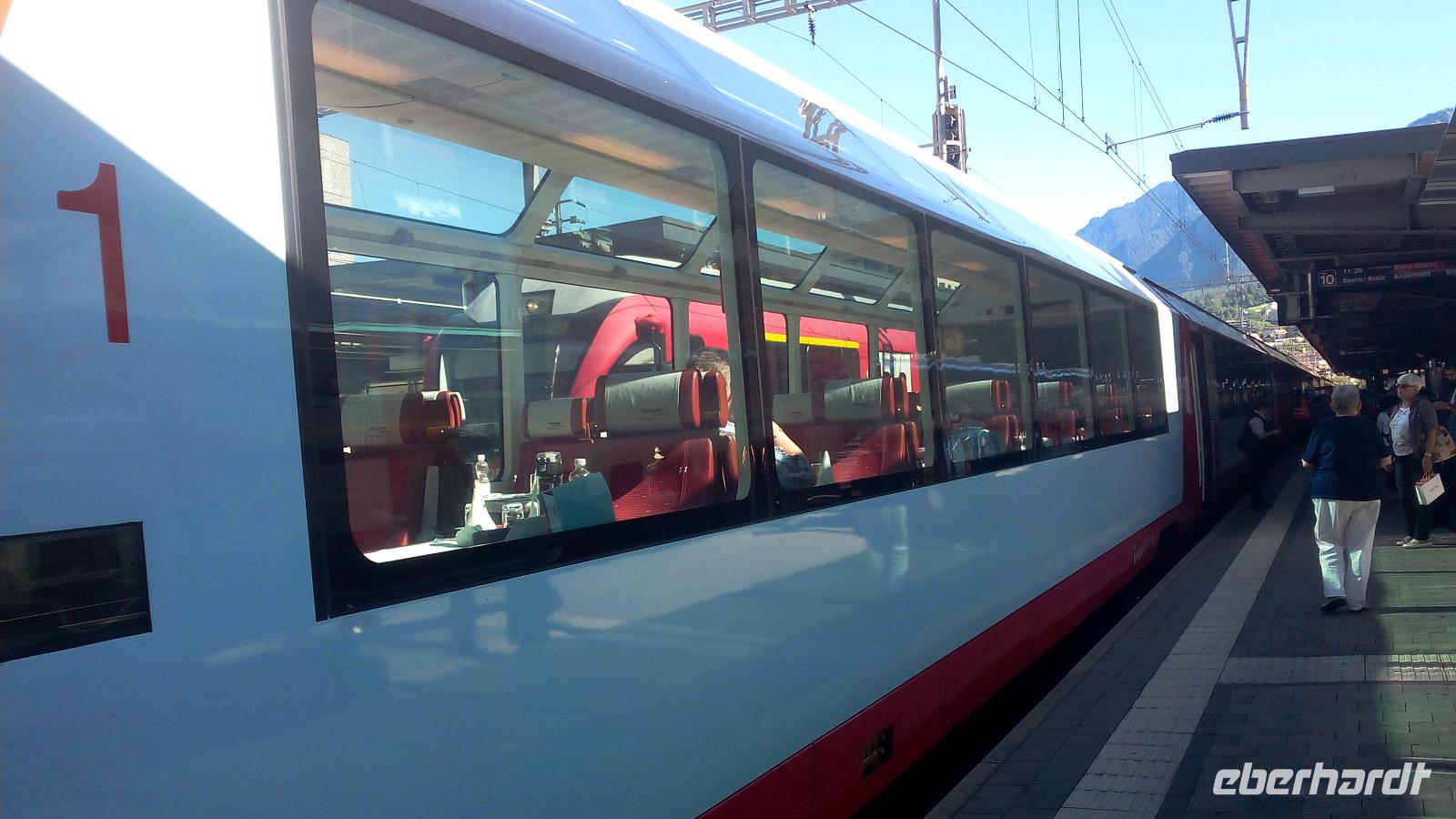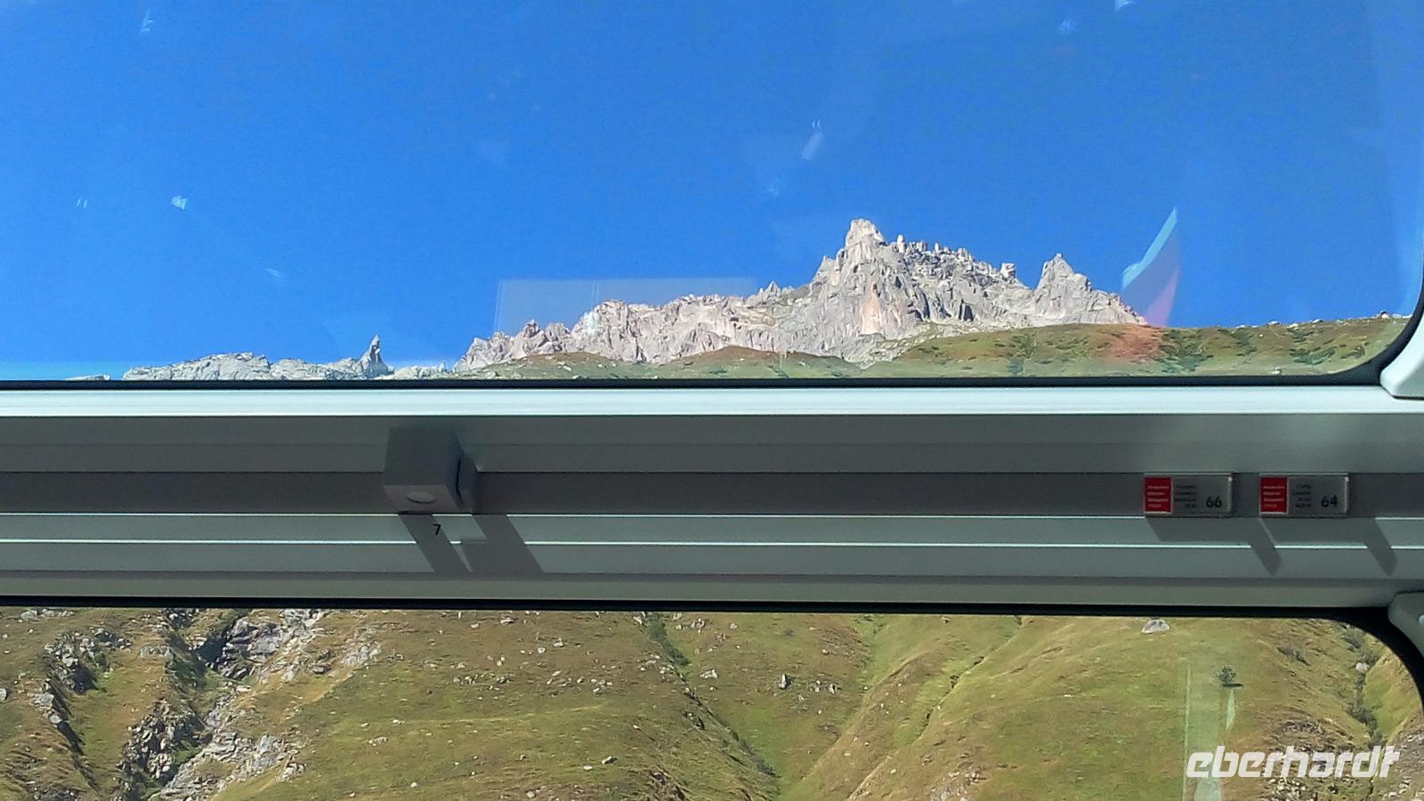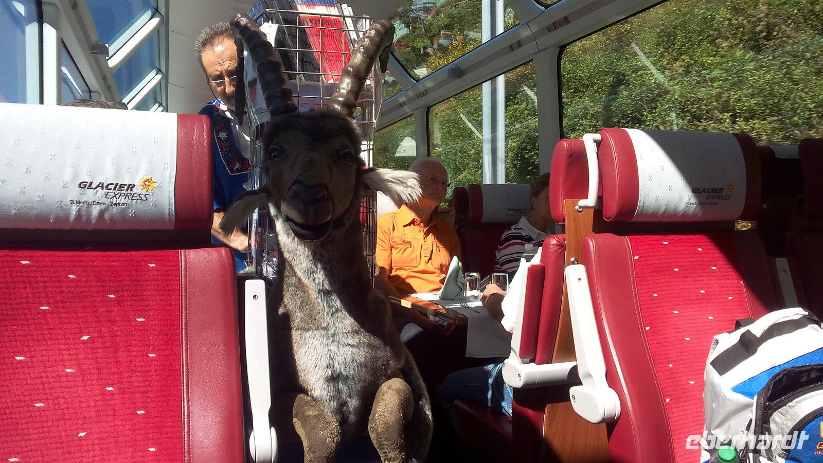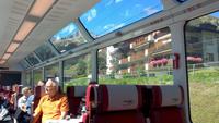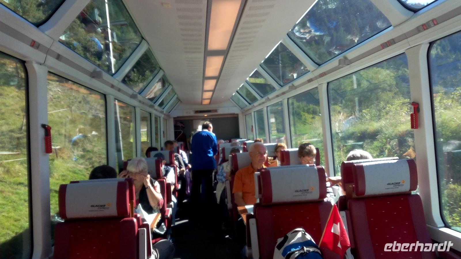 09.31 Uhr fahren wir mit dem regionalen Zug bis Filisur. Hier warten wir noch einige Minuten auf den „langsamsten Schnellzug der Welt" . Eine Reservierung für Eberhardt Gäste zeigt uns unseren Waggon. Wir sitzen in der ersten Klasse und freuen uns über diese Überraschung. Die Fotografen wollen natürlich ans Fenster. Aber die Panoramawagen des Glacier Express bieten allen Gästen eine allerbeste Aussicht auf die Umgebung. Unsere Panoramafahrt kann beginnen.