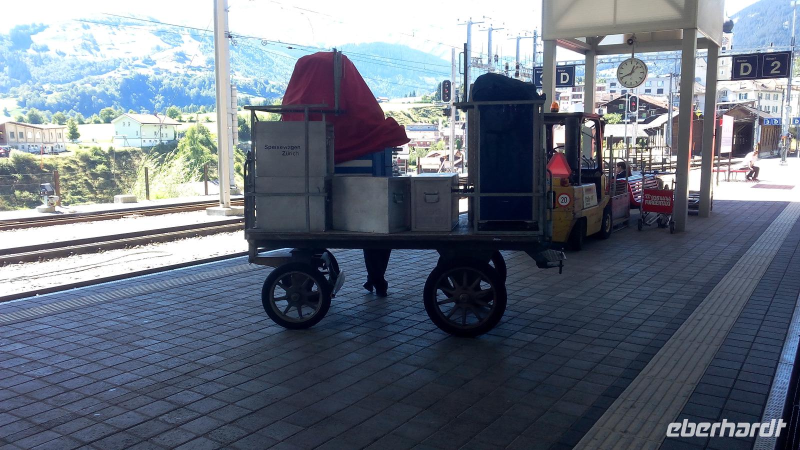 Unsere Rückfahrt beginnt mit Kofferladen vor dem Hotel. Mit einem Elektroauto werden die Koffer dann zum Bahnhof gebracht. Frank wird bereits vor uns nach Täsch fahren. Wir laufen nach dem Frühstück langsam durch Zermatt zum Bahnhof. Unsere Bahnfahrt endet in Täsch. Frank wartet auf uns und die Koffer.
