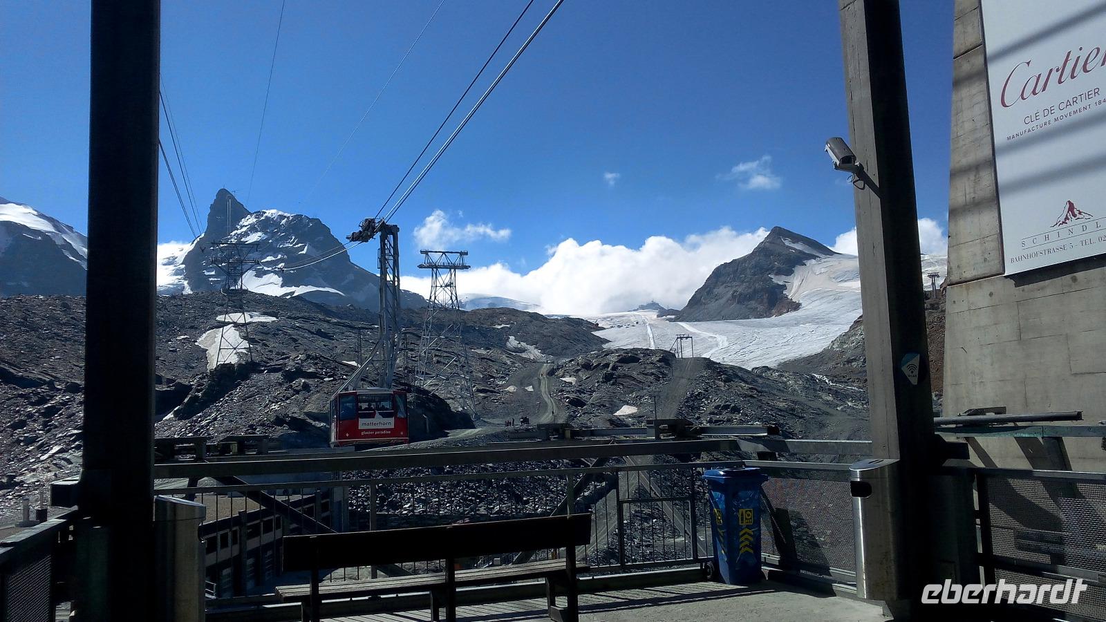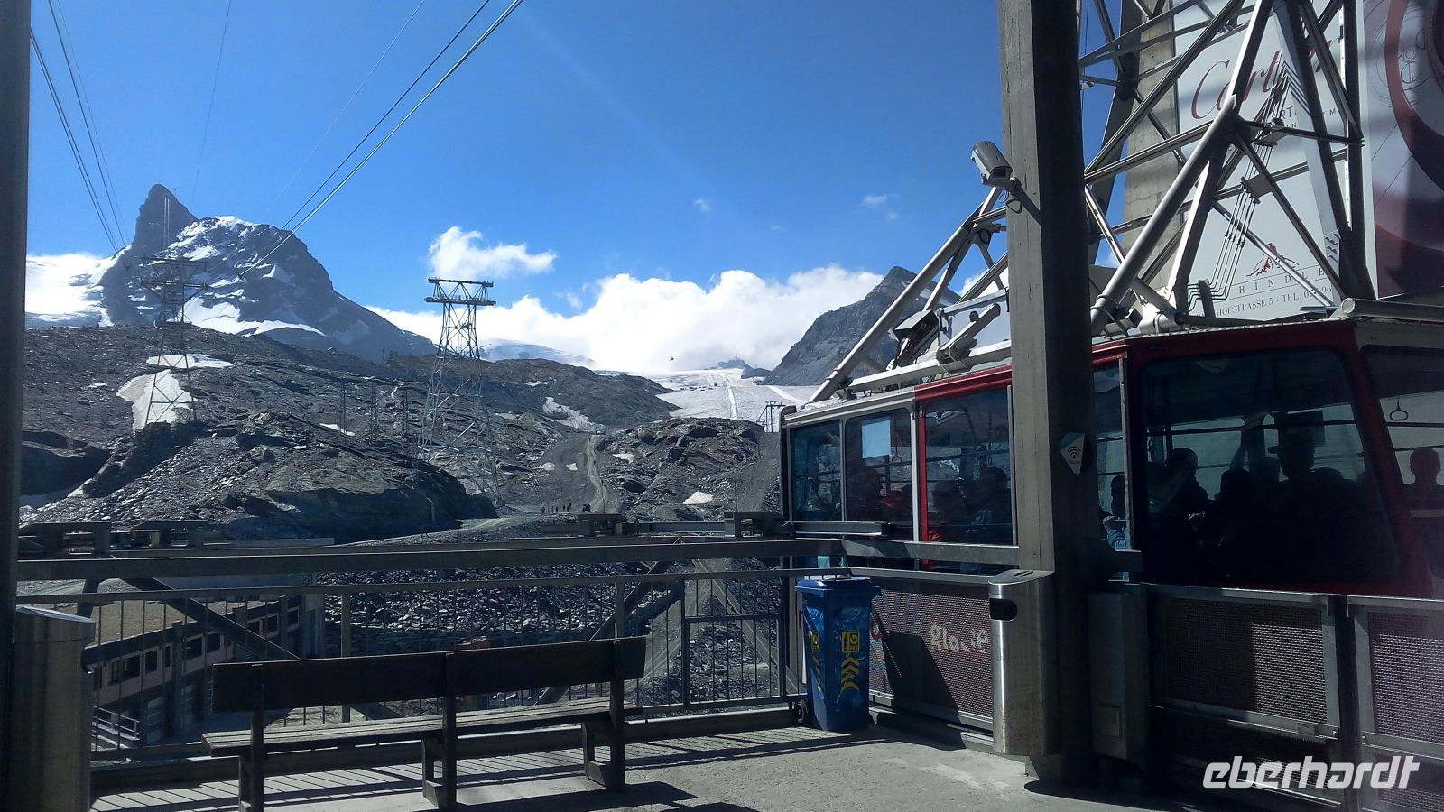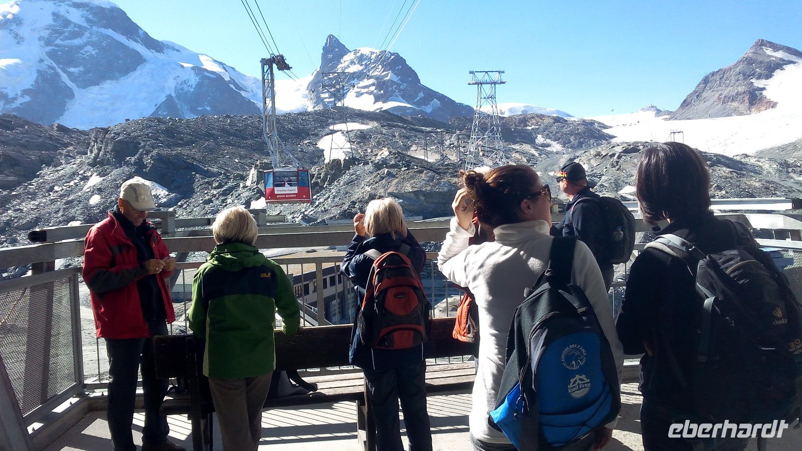 Sonne pur und die Temperaturen wurden mit bis zu 28 Grad angesagt. Ein Teil der Gruppe fährt mit der höchsten Luftseilbahn Europas zum kleinen Matterhorn(3883 m).