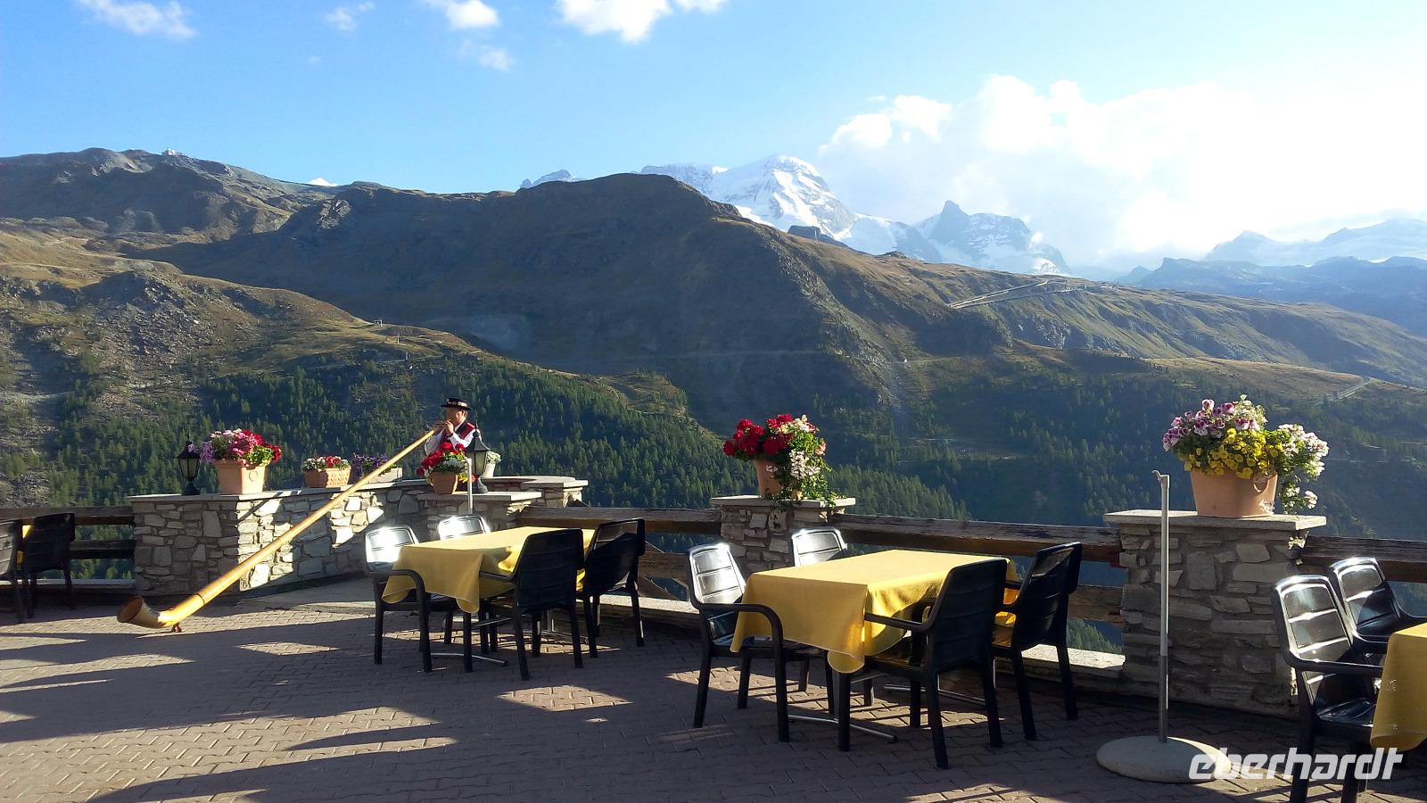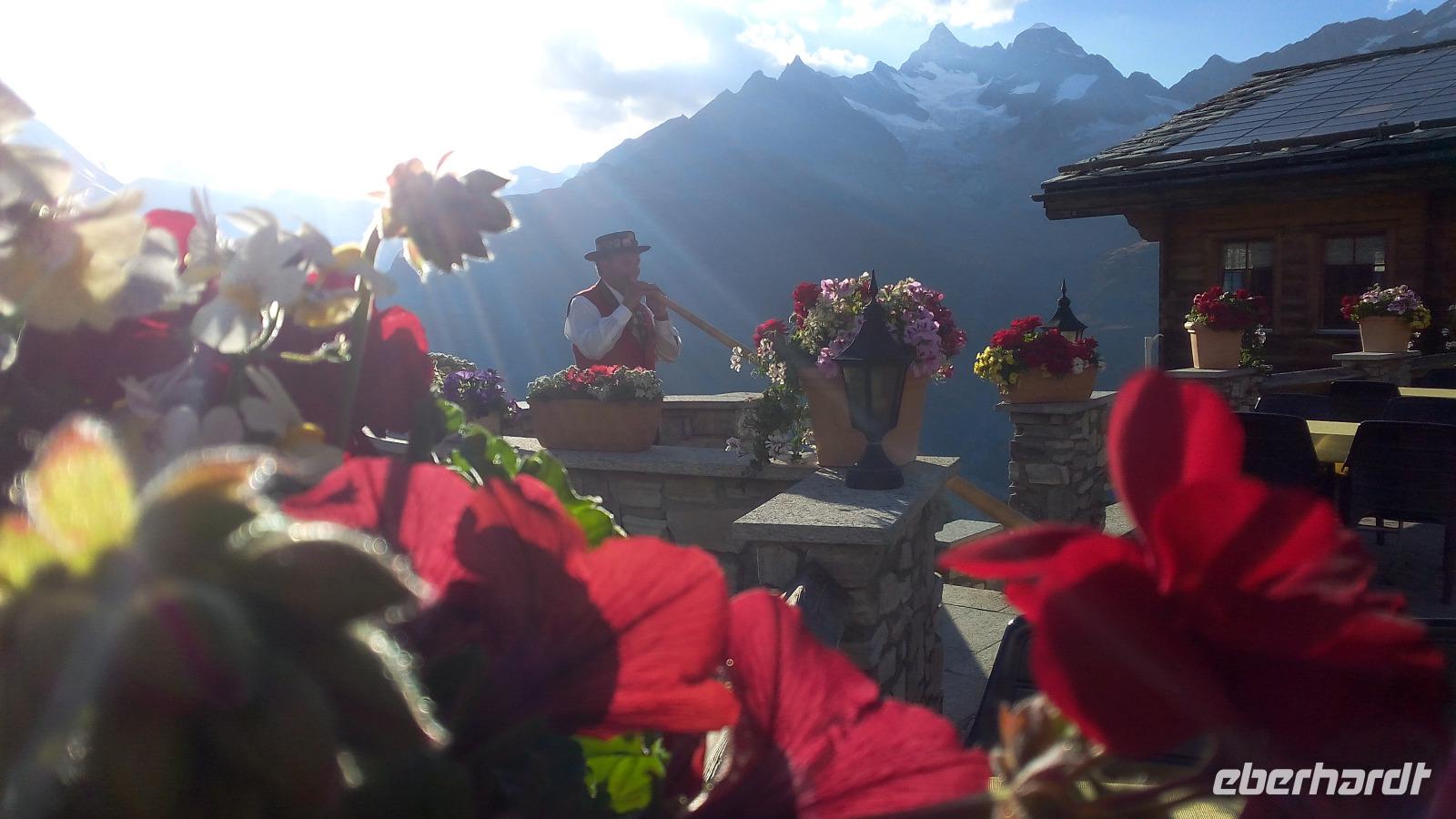 Heute haben wir noch einen ausgesprochen schönen Programmpunkt. Gegen 17.30 Uhr fahren mit dem Sunnegga Express eine Tunnel-Standseilbahn zur Sunnegaterrasse (2288m).Begrüßt werden wir von einem Alphornbläser.