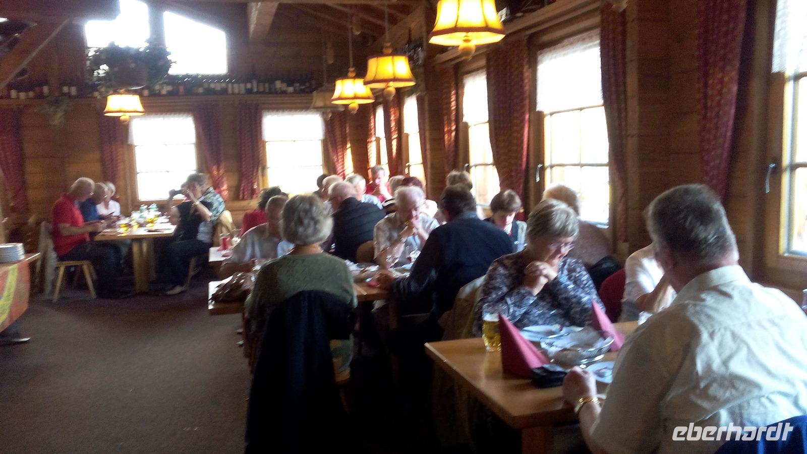 und die Sicht auf die schneebedeckten Berge zu haben. Mit dem Genuss eines Aperitifs sollte dieser Teil des Abends nicht so schnell zu Ende gehen. Zum Abendessen wechseln wir in das Restaurant. Als Vorspeise gibt es Salat und Graubündner Spezialitäten. Danach das Käse-Raclette. Eine typische Schweizer Spezialität. Der Raclett-Käse wird erhitzt und vom Käselaib runtergezogen. Dazu gibt es Pellkartoffeln, Gewürzgurken und Zwiebeln. Ein Essen, das man nicht vergisst. Unsere Folkloregruppe unterhält uns mit typischer Alpenmusik. Nach einem schönen Abend fahren wir 20.30 Uhr wieder nach Zermatt zurück