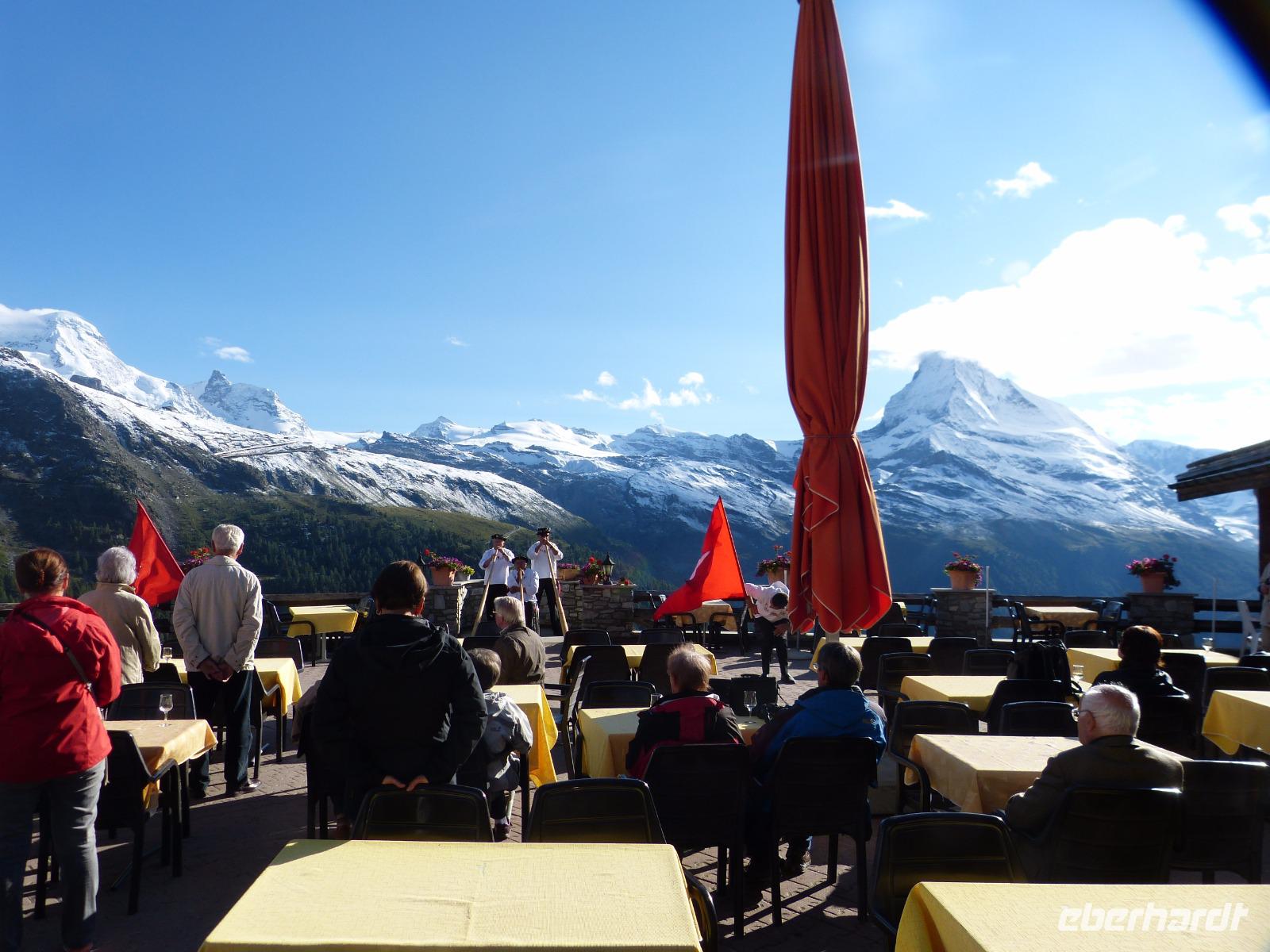 Das Abendessen wurde an diesem Abend nicht im Hotel gereicht, sondern wir fuhren mit der Zahnradbahn auf den Sunegga. In 2288 m Höhe wurden wir von den Wirtsleuten mit einem Aperitif begrüßt. Dazu spielten Alphornbläser auf der Terrasse, mit dem Matterhorn im Hintergrund, für alle Gäste ein unvergessliches Erlebnis.