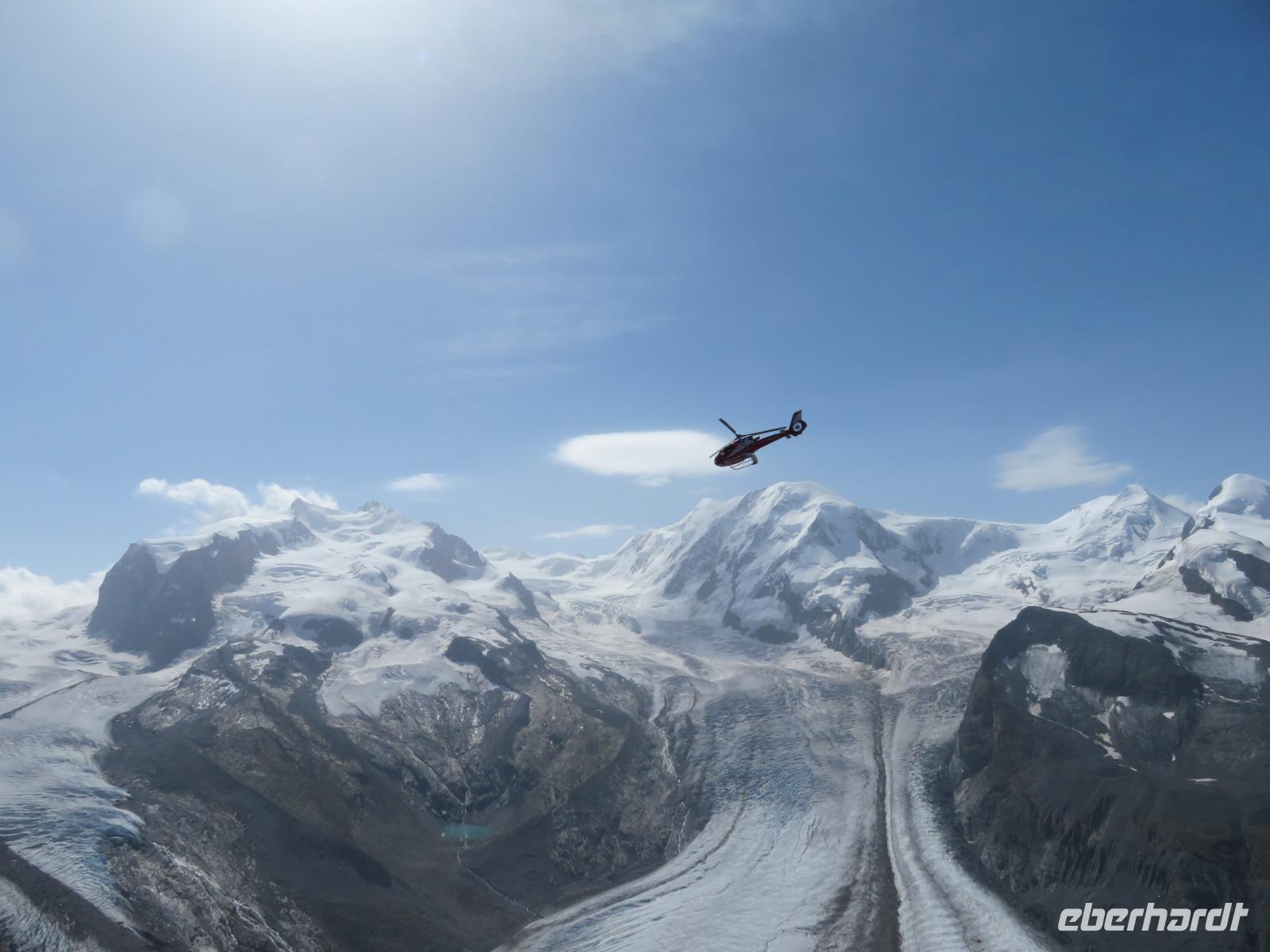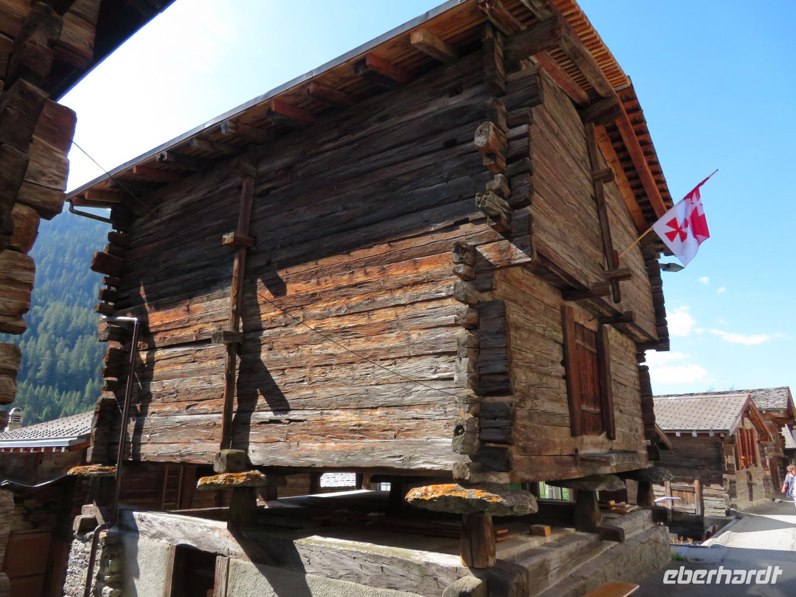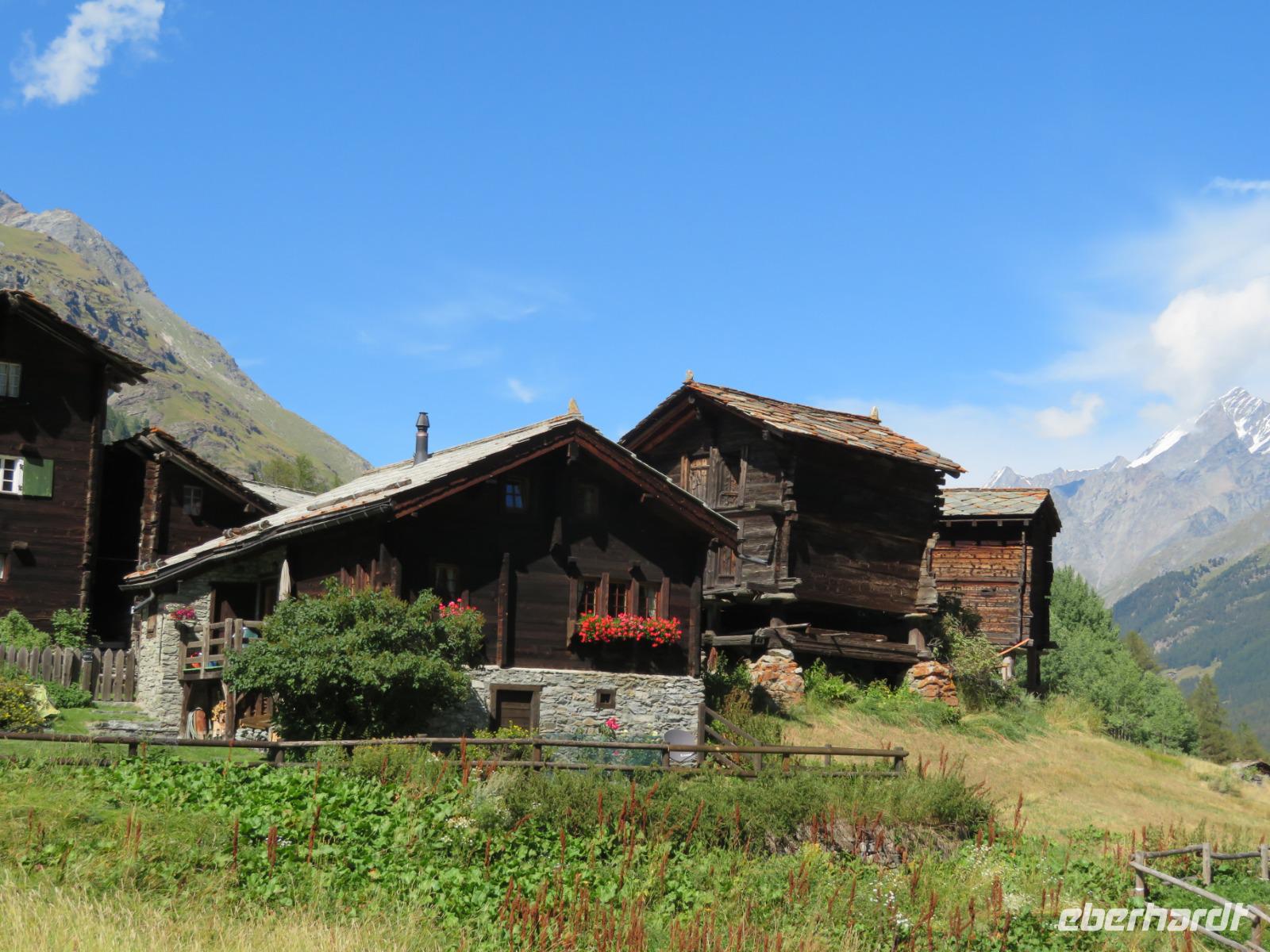 Wir starten zu unserem fakultativen Ausflug auf das Kleine Matterhorn. Wir gehen entlang der Vispa zur Talstation der Gondelbahn. Sie bringt uns über Furi nach Schwarzsee. Wir hier dem Matterhorn ganz nah. Wir entdecken die Hörnlihütte am Fuße des Matterhorns. Sie ist der Ausgangspunkt für jeden Bergsteiger, der den Berg der Berge besteigen möchte. Wir sehen von der Station Schwarzsee bereits unser Ziel - das Kleine Matterhorn. Unsere Fahrt mit der Gondelbahn führt uns weiter bis zur Station „Trockener Steg". In 2.953 Metern Höhe machen wir ebenfalls eine Pause. Wir besuchen zunächst die Informationsausstellung zur neuen Gondelbahn, die gerade gebaut wird. Sie zeichnet sich durch neuartige Gondeln aus. In diesen finden 28 Personen Platz und vor allem die Skifahrer können komfortabler in das Skigebiet auf dem Kleinen Matterhorn fahren. Nachdem wir auf der Terrasse die Aussicht genossen haben, geht es mit der Kabinenbahn auf das Kleine Matterhorn in 3.883 Metern Höhe. Jeder gestaltet seinen Besuch auf dem höchsten Aussichtspunkt nach seinen Wünschen. Wir besuchen die Aussichtsplattform. Im gleißenden Sonnenlicht sind wir den majestätischen Viertausendern ganz nah. Ob das Breithorn mit seiner dicken Schneekappe, der Dom, der höchste Berg der komplett auf Schweizer Boden steht oder die Monte Rosa Gruppe - wir sind einfach nur begeistert von der Schönheit der Berge! Selbst den Mont Blanc sehen wir fast zum Greifen nah. Im Gletscherpalast tauchen wir in die Welt des ewigen Eises ein. Wir können wunderschöne Eisplastiken bestaunen. Beim Bummel über den Gletscher begegnen uns die Skifahrer, die hier das ganze Jahr ihrem Sport nachgehen können. Nach einem ausgiebigen Aufenthalt treten wir individuell die Talfahrt mit den Bahnen an. Doch auch dabei fasziniert uns diese einmalige, überwältigende Natur. Bei Traumwetter wandern wir mit einigen Gästen das letzte Stück nach Zermatt zurück. In Furi verlassen wir die Gondelbahn. Nun führt uns ein herrlicher Wanderweg durch Wiesen und die alten Weiler Zum See und Blatten. Wunderschöne alte Holzhäuser und Spycher geben den beiden Weilern ihr typisches Bild. Diese typischen, aus Lärchenholz gebauten Häuser sind teilweise mehrere hundert Jahre alt und vermitteln einen kleinen Einblick, wie Zermatt früher ausgesehen hat. Gut gelaunt kommen wir Zermatt an und alle gestalten den Nachmittag nach ihren Wünschen. Wir schauen noch den Folkloregruppen zu, die auf dem Kirchplatz und am Bahnhof spielen, denn am Wochenende ist ein Folklorefest in Zermatt.