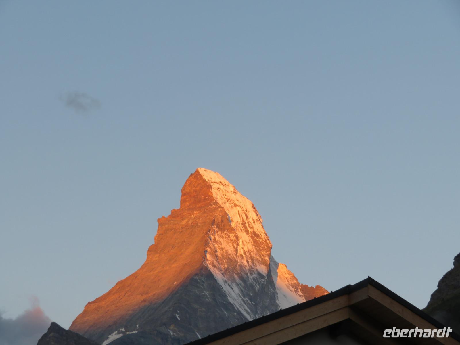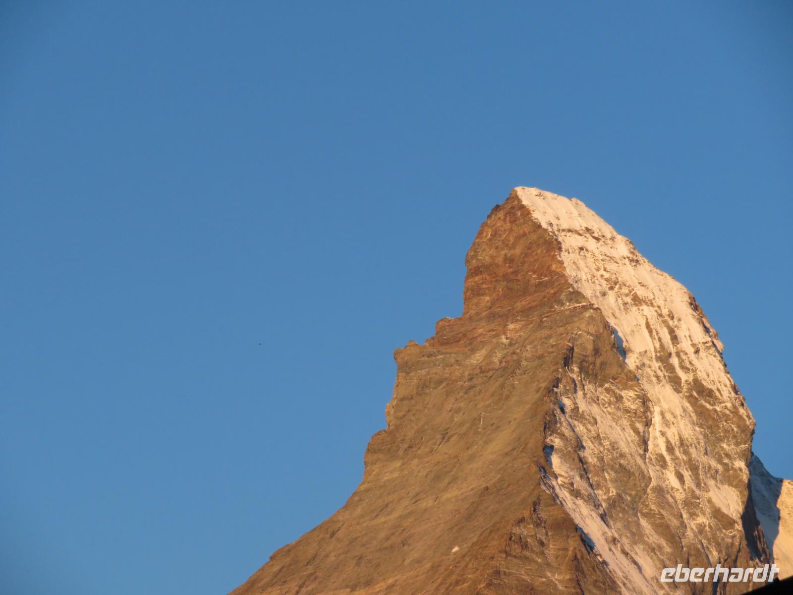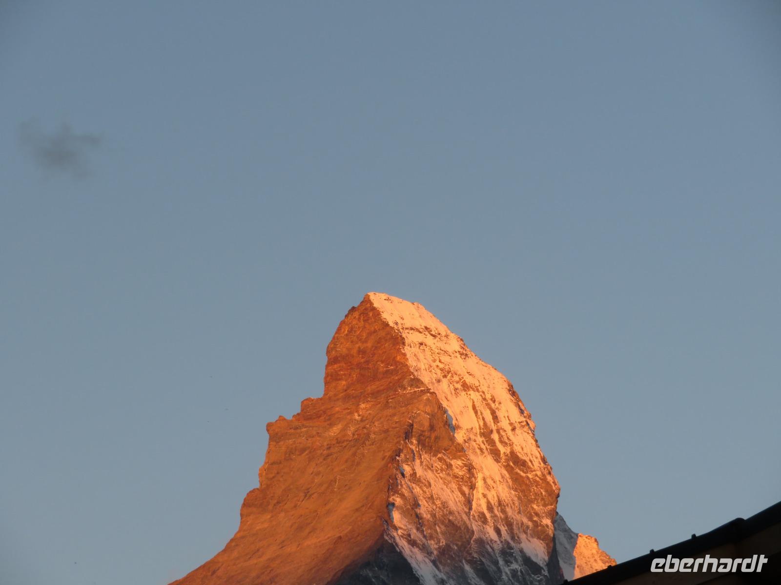 Am Morgen begrüßt uns das Matterhorn mit einem traumhaften Naturschauspiel: Die Sonne zieht dem Berg einen goldenen Mantel an - einmalig schön!