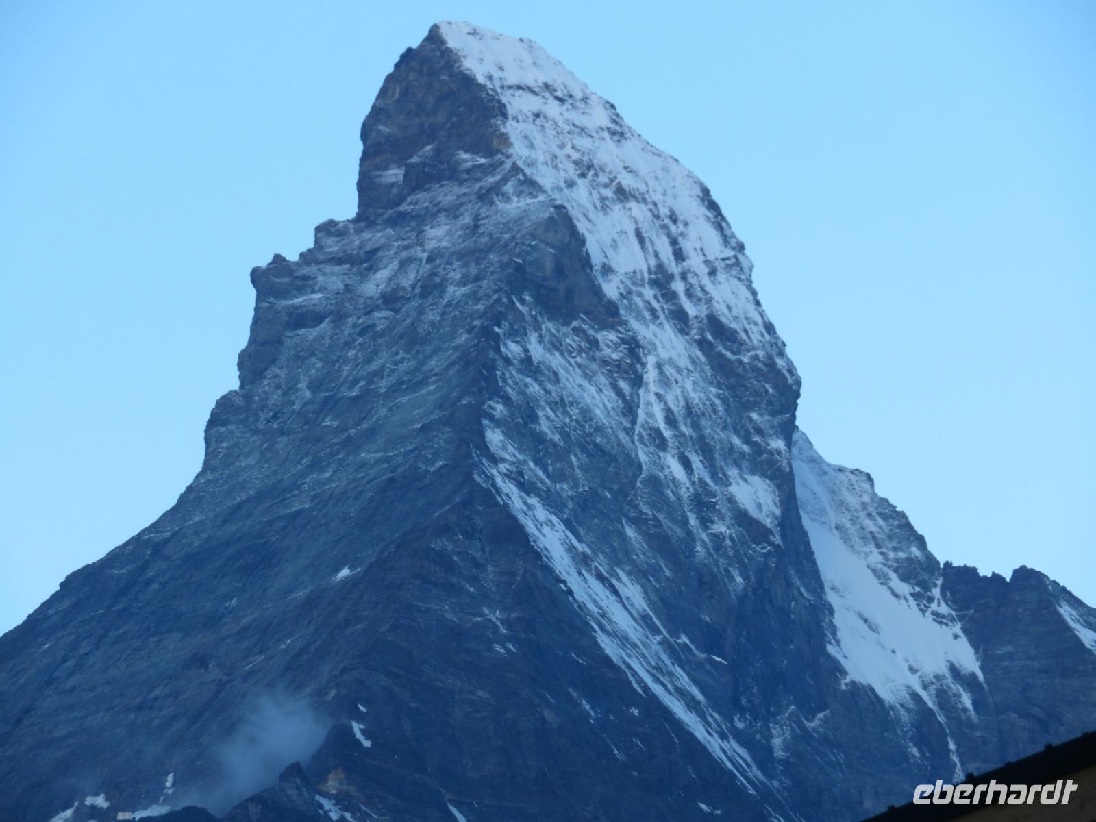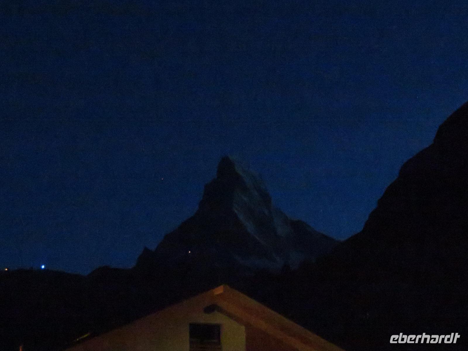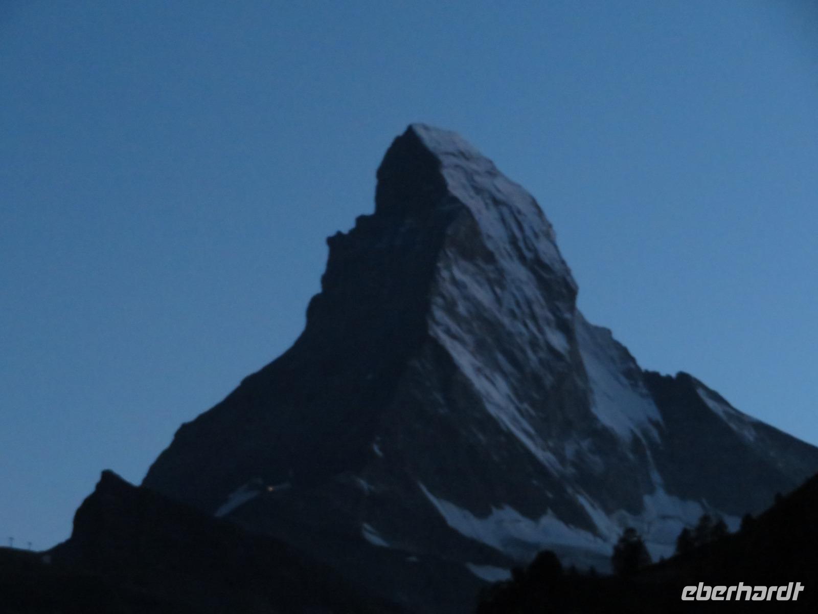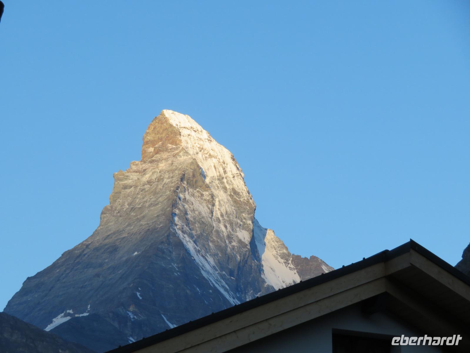 Am Morgen begrüßt uns das Matterhorn mit einem traumhaften Naturschauspiel: Die Sonne zieht dem Berg einen goldenen Mantel an - einmalig schön!