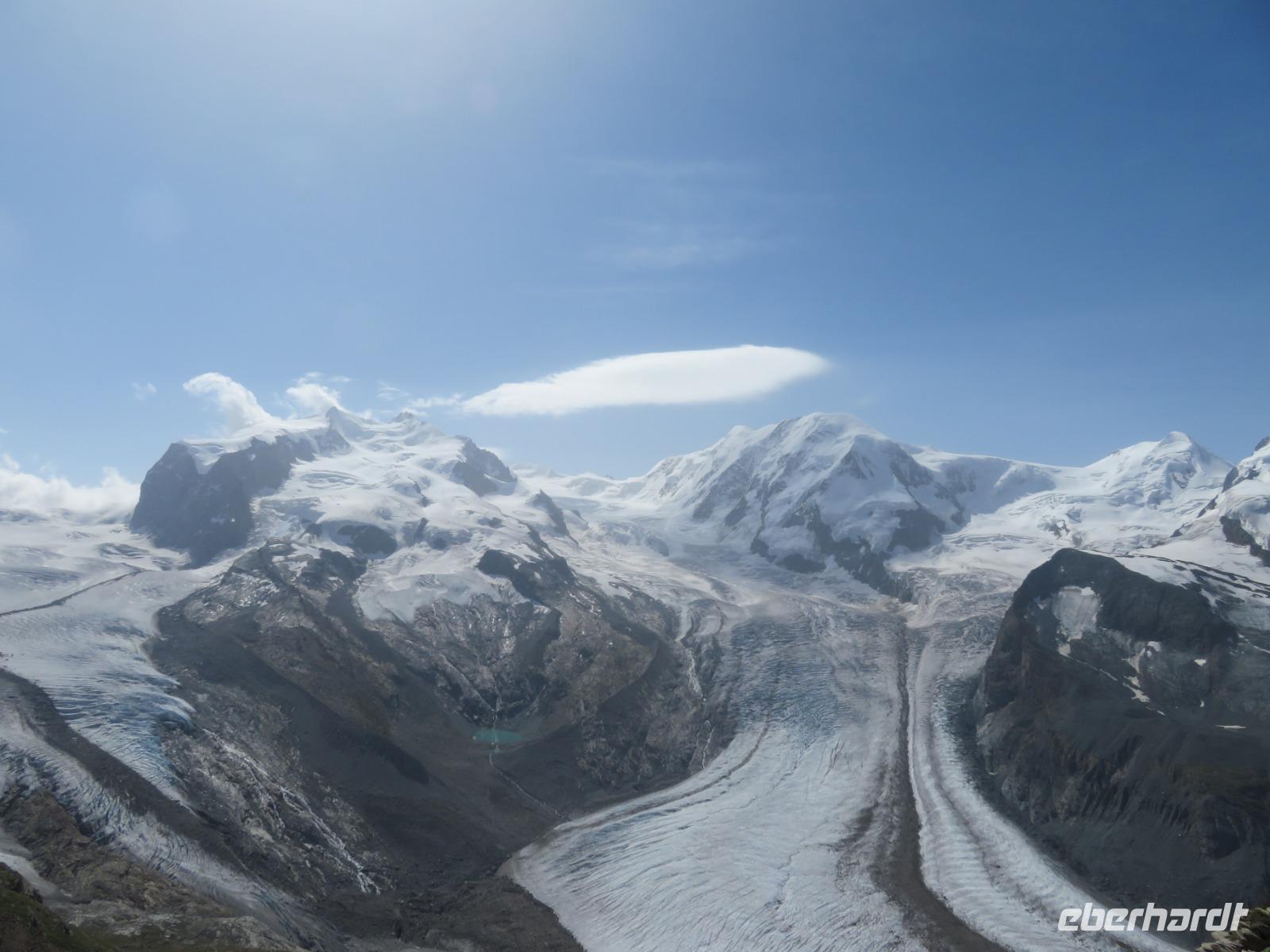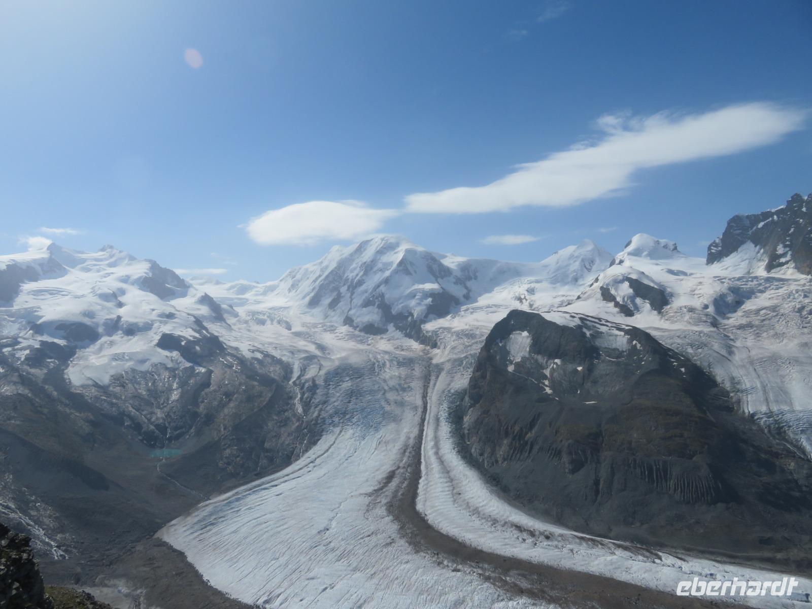 Die Gornergratbahn bringt uns auf den Gornergrat in 3.089 Meter Höhe. Das Matterhorn, der Dom, die Monte Rosa Gruppe und die weiteren Viertausender mit ihren Gletschern erstrahlen für uns mit ihren schneebedeckten Gipfeln im gleißenden Sonnenlicht. Wir können uns im Angesicht dieser Naturschönheiten einfach nicht sattsehen. Nach einem längeren Aufenthalt fahren wir individuell wieder zurück nach Zermatt. Einige Gäste Wandern zum Riffelsee oder zurück nach Zermatt. Leider fängt es aber an zu regnen und so nehmen wir doch die Bahn zurück. Den Nachmittag gestaltet jeder nach seinen Wünschen.