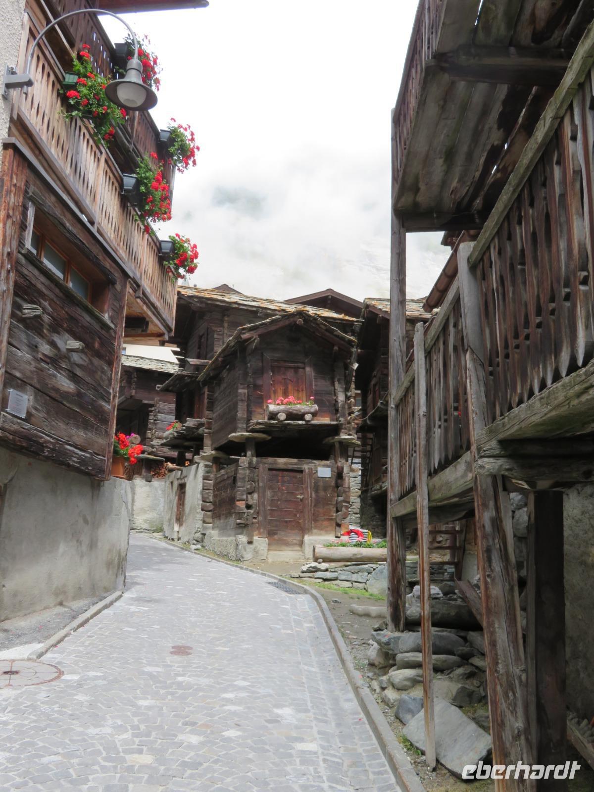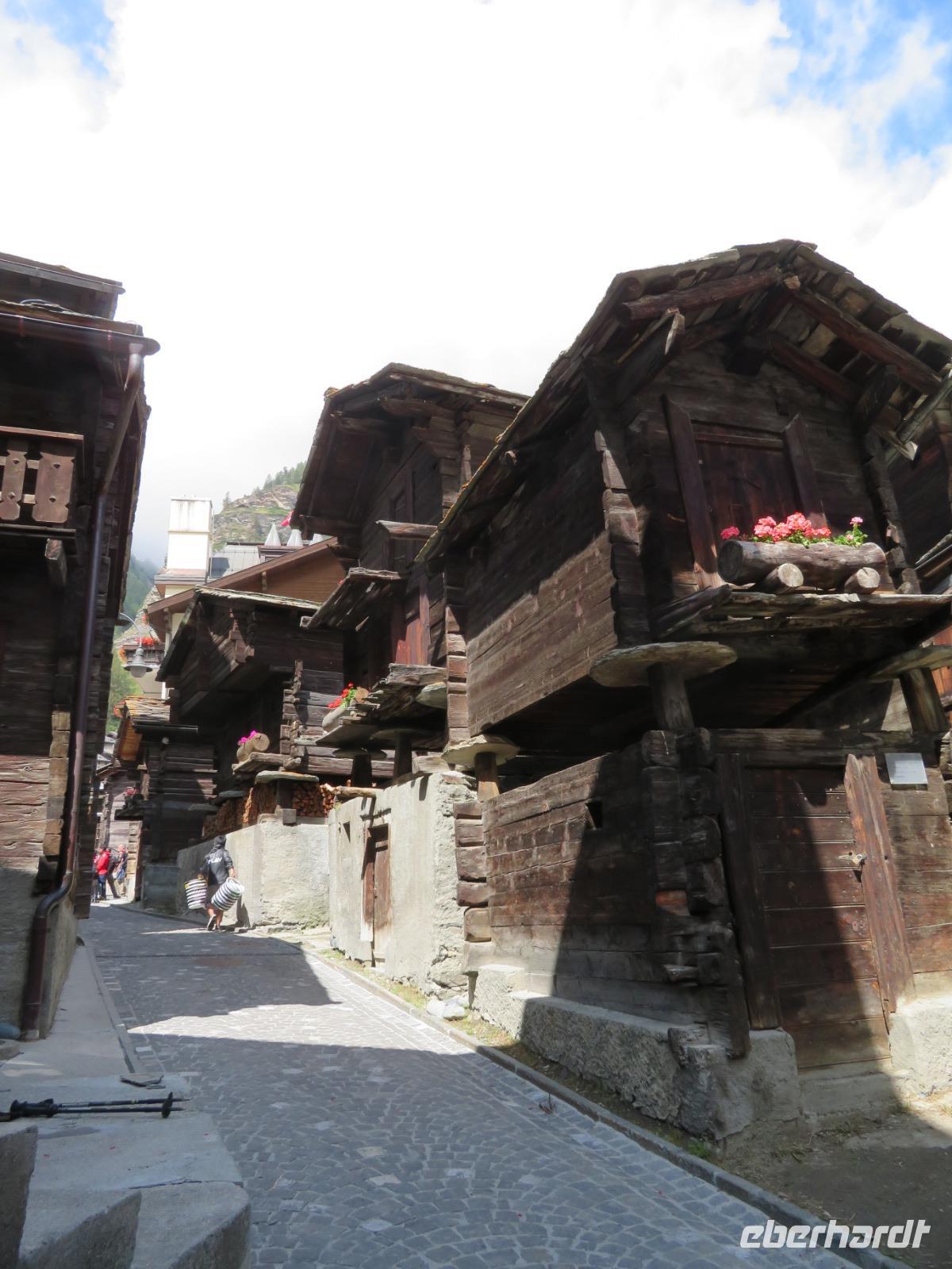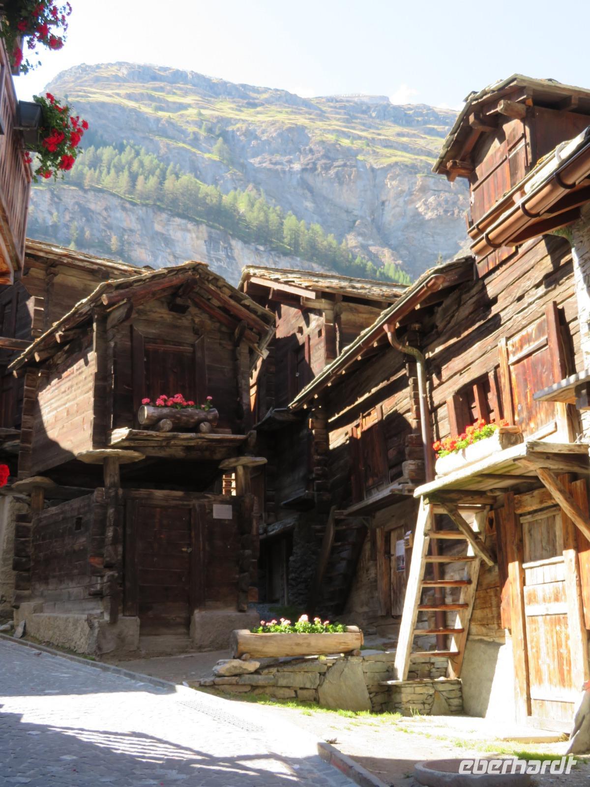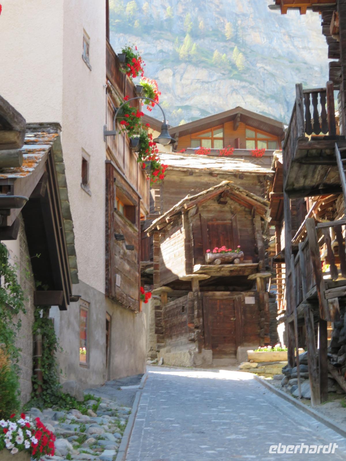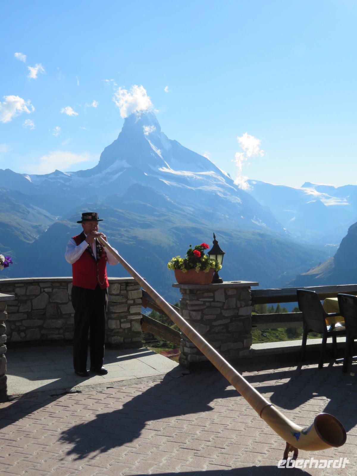 Nach dem Frühstück unternehmen wir einen kleinen Ortsrundgang durch Zermatt. Wir gehen zur Englischen Kirche. Ich zeige, einen meiner Lieblingsplätze - das alte Zermatt mit den dunklen wettergegerbten Holzhäusern und Spychern, welche teilweise über 500 Jahre alt sind.Der Brunnen, der zu Ehren von Ullrich Inderbinen errichtet wurde, gehört natürlich auch zu unserem Spaziergang. Ulrich Inderbinen war der älteste Bergführer der Welt. Ca. 370 Mal bestieg er das Matterhorn und letztmalig 90jährig im Jahr 1990. Bis zu seinem 95. Geburtstag war er noch als Bergführer unterwegs. Er verstarb 2004 im Alter von 104 Jahren. Wir gehen vorbei am Bergsteigerfriedhof auf den Kirchplatz. Ich fordere die Gäste auf, die Murmeltiere am Murmeltierbrunnen zu streicheln. Die Legende besagt, dass man immer wieder nach Zermatt zurückkehrt, wenn man die Murmeltiere streichelt. Ich denke, dass es bei mir funktioniert, denn ich darf immer wieder Zermatt besuchen. Untrennbar sind die Geschichte Zermatts und das Matterhorn mit seiner Erstbesteigung im Jahre 1865 verknüpft. Immer wieder treffen wir Spuren dieser Bergbesteigung, ob in der Englischen Kirche, auf dem Friedhof oder am heutigen Hotel Monte Rosa. Nach unserem kleinen Rundgang besuchen wir das Matterhornmuseum. Hier tauchen wir noch etwas intensiver in die Geschichte des berühmten Bergsteigerortes ein. Sehr anschaulich ist das schwere Leben der Bauern und Einwohner Zermatts in vergangener Zeit dargestellt. Wir erfahren unter welch schwierigen Bedingungen und mit welch einfacher Ausrüstung die Berge rund um Zermatt im 19. Jahrhundert meist durch Engländer erstbestiegen worden. Anschließend gestalten wir den Nachmittag ganz nach unseren Wünschen. Am Abend fahren wir mit der Standseilbahn hinauf auf Sunnegga in 2.288 Meter Höhe. Uns erwartet ein stimmungsvoller Abend im Angesicht des Matterhorns. Wir werden vom Alphornspieler auf der Terrasse bei herrlichstem Sonnenschein begrüßt. Die Berge zeigen sich in ihrer ganzen Pracht im Abendlicht. Bei einem Glas Wein begeistern uns die Klänge des Alphorns. Anschließend werden wir vom netten Restaurantpersonal mit Trockenfleisch und Salat verwöhnt. Ein typisches Schweizer Gericht, das Raclette, ist unser Hauptgericht. Der schmackhafte Käse wird unter einer Heizspirale geschmolzen und mit Pellkartoffeln und saurem Gemüse serviert. Es schmeckt vorzüglich. Zum Abschluss wird uns noch ein leckerer Obstsalat gereicht. Das Essen begleitet eine Familie mit Schwyzerörgeli mit schwungvoller Folkloremusik. Das Matterhorn zeigt sich uns am ganzen Abend in seiner einzigartigen Pracht. Wir genießen das Panorama und entdecken das Rothorn, Castor und Pollux, das Breithorn und das Kleine Matterhorn. Schwarznasenschafe tummeln sich auf der Wiese vor dem Restaurant. Wir sind uns einig: Wir dürfen einen einmaligen Abend mit wunderbaren Emotionen und Gefühlen in dieser herrlichen Bergwelt erleben.