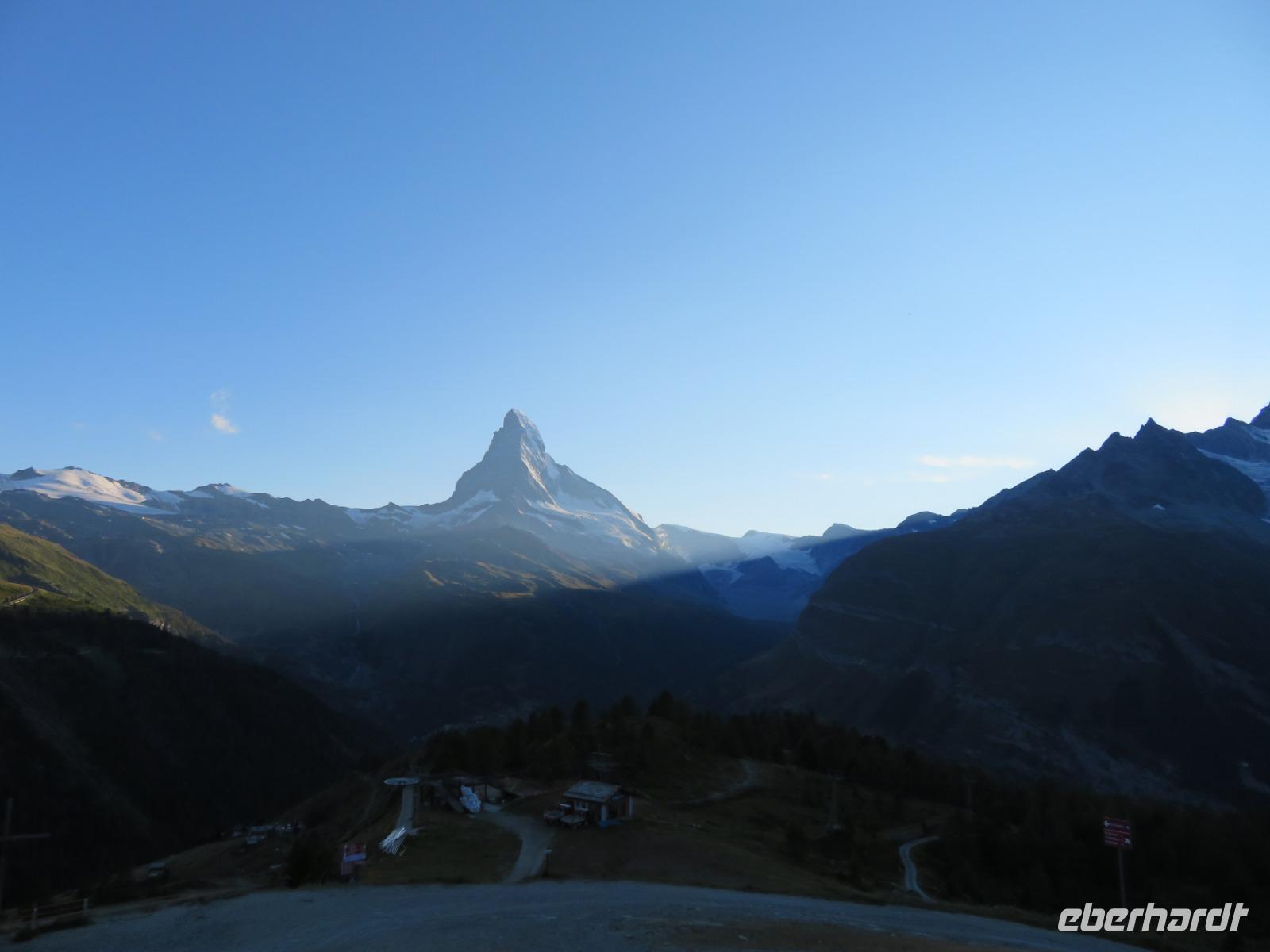 Heute sind wir zum Teil früh aufgestanden: Wir können einen fantastischen Sonnenaufgang am Matterhorn erleben. Im ersten Sonnenlicht glänzt der Berg der Berge golden - ein einmaliges erhabenes Bild. Wir starten unseren Ausflug auf den Gornergart.