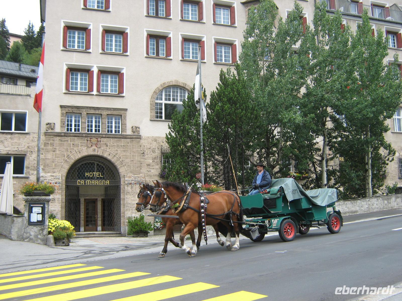 Während einige Gäste sich den Tag selbst gestalteten und die Region und die Bergwelt um Davos auf eigene Faust erkunden wollten, fuhr die Mehrzahl der Gäste mit uns nach St. Moritz, der Stadt mit den meisten Sonnentagen im Jahr. Das Wetter war etwas durchwachsen aber dennoch schön und so nutzten wir den Aufenthalt hier zu einem kleinen Bummel durch die Stadt, in der es im Gegensatz zu den Wintermonaten erstaunlich ruhig war. Danch war eine Mittagspause auf dem Julierpaß vorgesehen und alle genossen in luftiger Höhe den köstlichen Kaffee und die obligatorischen Würstchen aus der Bordküche. Gut gelaunt und gestärkt ging es wieder am Silvaplaner See vorbei nach Thusis zur wildromantischen Via Mala Schlucht, 550 m tief und 2,5 km lang. Einfach gigantisch, wie gewaltige Tiefen und steile, schroffe Felswände den faszinierenden Wasserlauf flankieren.
