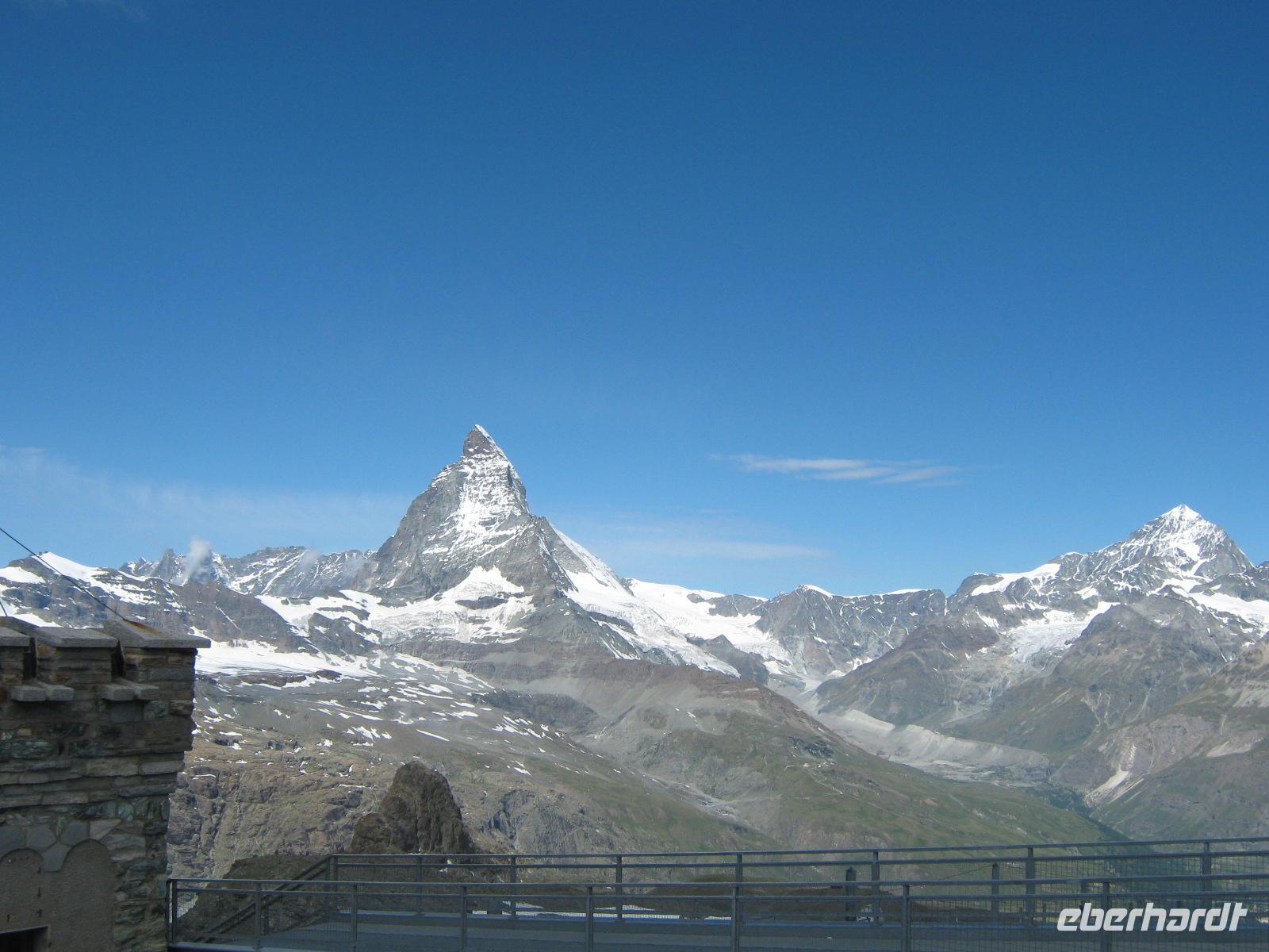 Heute stand nach dem Frühstück eine Fahrt zum Gornergrat mit der Gornergrat-Monte-Rosa-Bahn auf 3.089 m ü.M. auf dem Programm. Wie konnte es anders sein - die Sonne stand am stahlblauen Himmel und alles war einfach bilderbuchreif! Die Fahrt war wieder phantastisch und ständig dieser super Blick auf den Berg der Berge - das Matterhorn! Oben angekommen genossen erst einmal alle den herrlichen Rundblick auf die Gipfelwelt und dann gestaltete jeder seine eigene Bergwanderung zurück nach Zermatt oder fuhr direkt mit der Bahn wieder hinab. Auf jeden Fall gab es abends schon die ersten von der Sonne gezeichneten Gesichter!