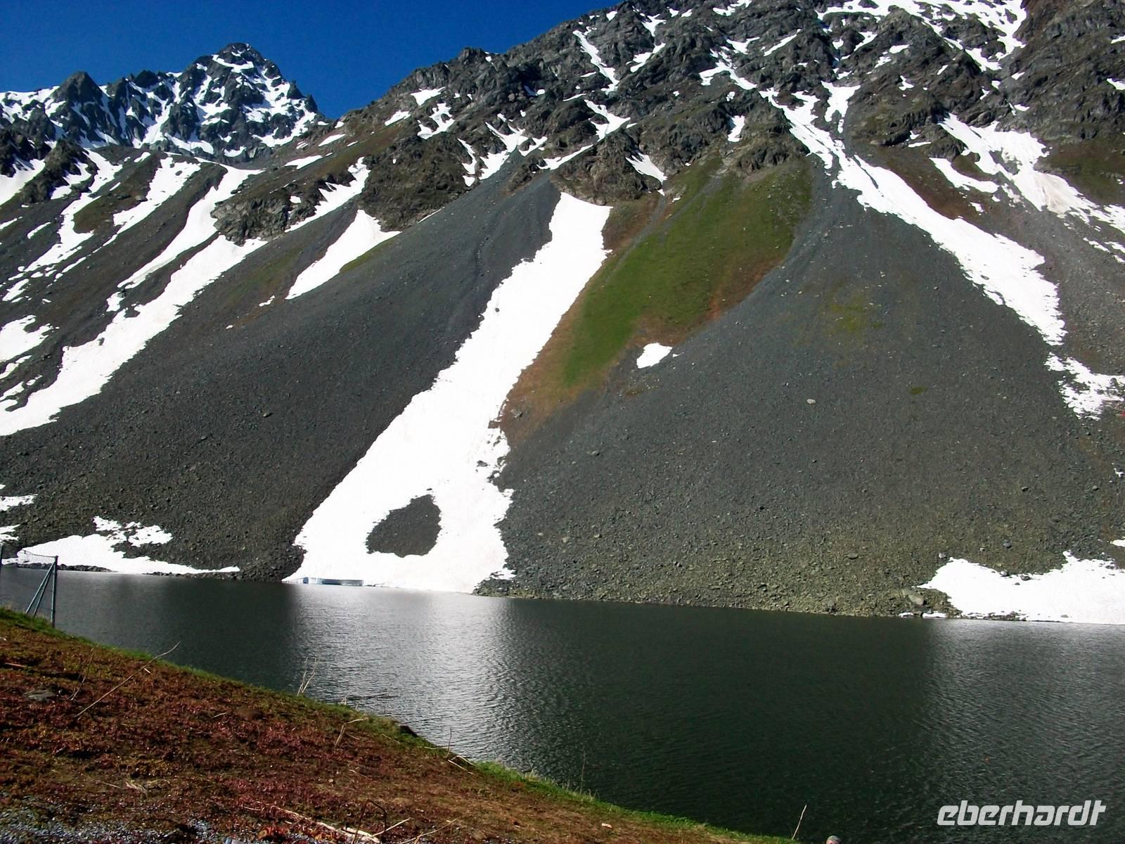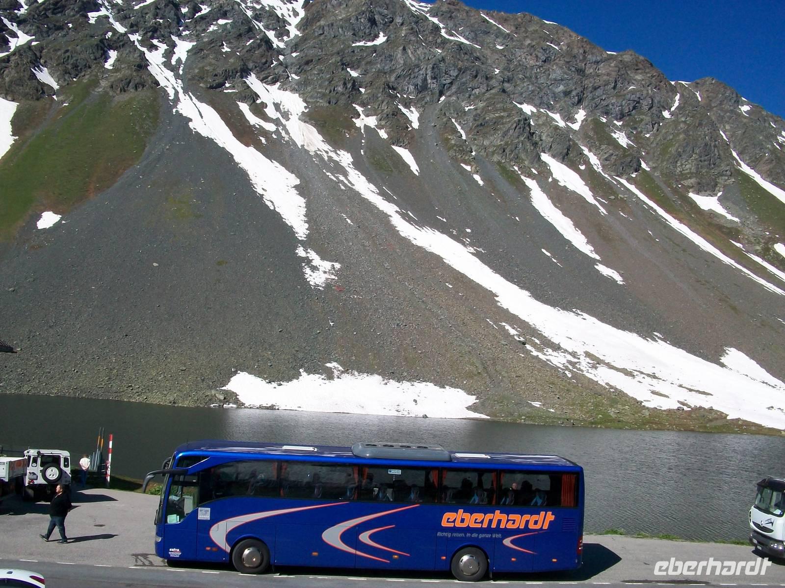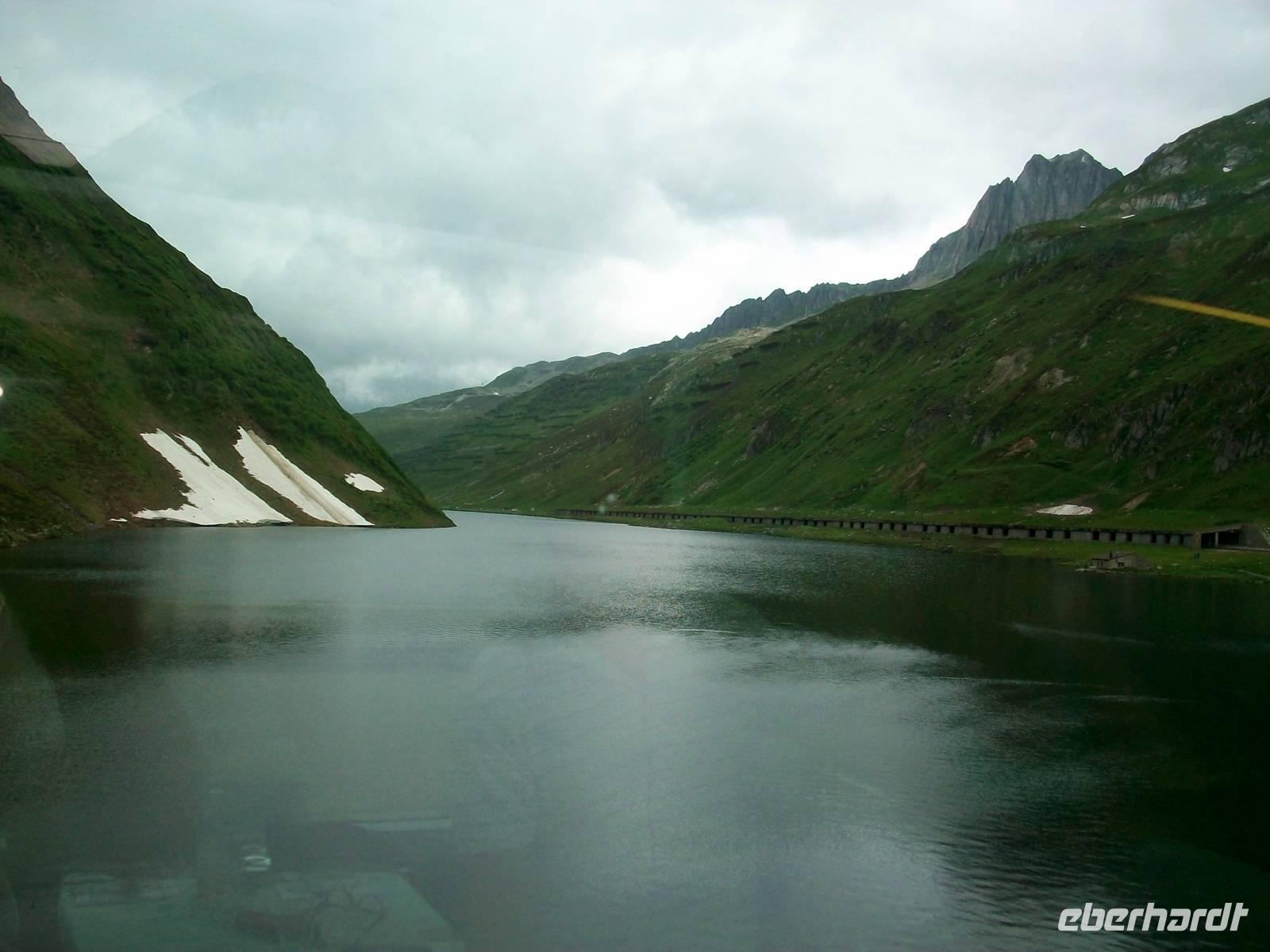 Der Wildfluss kommt uns durch die Wiesen entgegen, bald tritt der Baumbestand zurück und wir sind in der kargen Hochgebirgslandschaft des Flüelapasses unterwegs. Auf der Passhöhe, über 2 000 Meter über dem Meer, gönnen wir uns eine erste Fotopause. Von den Bergen sind noch die Schneezungen zu sehen, im See widerspiegeln sich die Spitzen, das sind erste unvergessliche Eindrücke unserer Reise.
