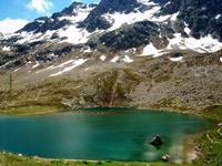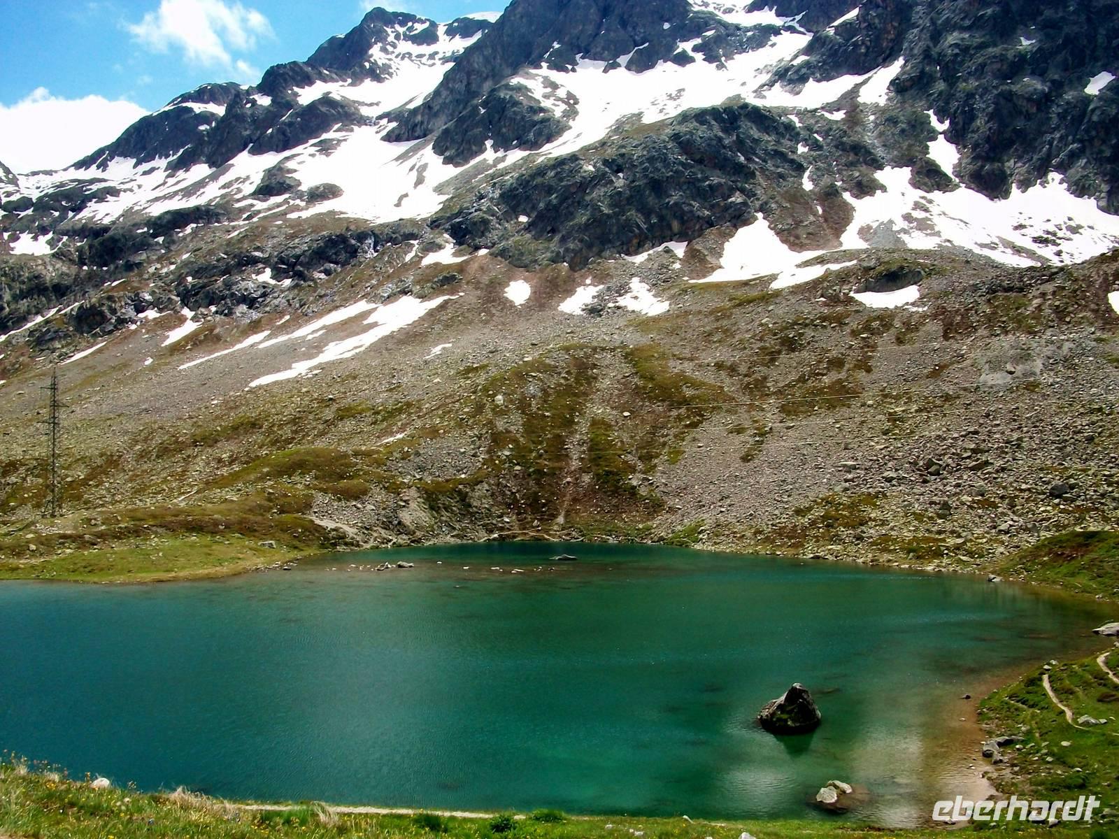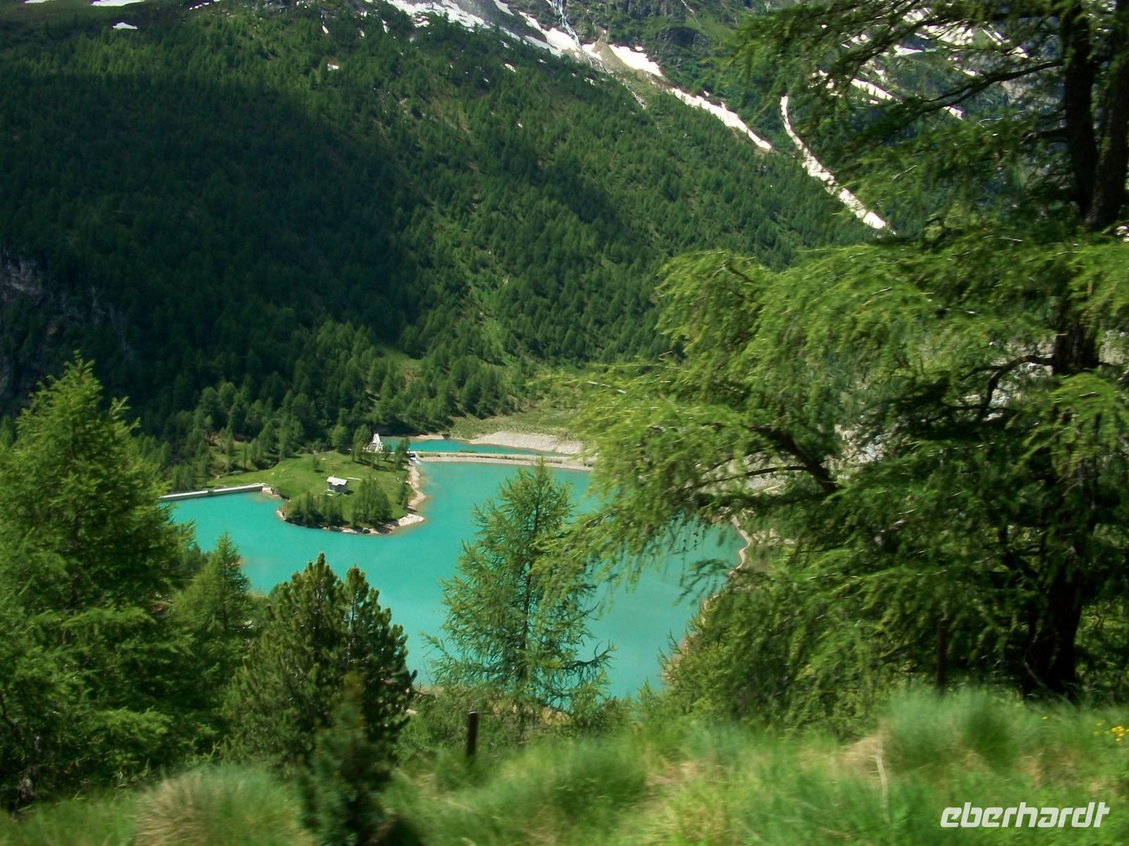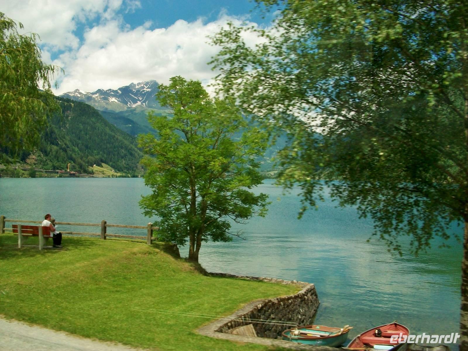 Der Wildfluss kommt uns durch die Wiesen entgegen, bald tritt der Baumbestand zurück und wir sind in der kargen Hochgebirgslandschaft des Flüelapasses unterwegs. Auf der Passhöhe, über 2 000 Meter über dem Meer, gönnen wir uns eine erste Fotopause. Von den Bergen sind noch die Schneezungen zu sehen, im See widerspiegeln sich die Spitzen, das sind erste unvergessliche Eindrücke unserer Reise.