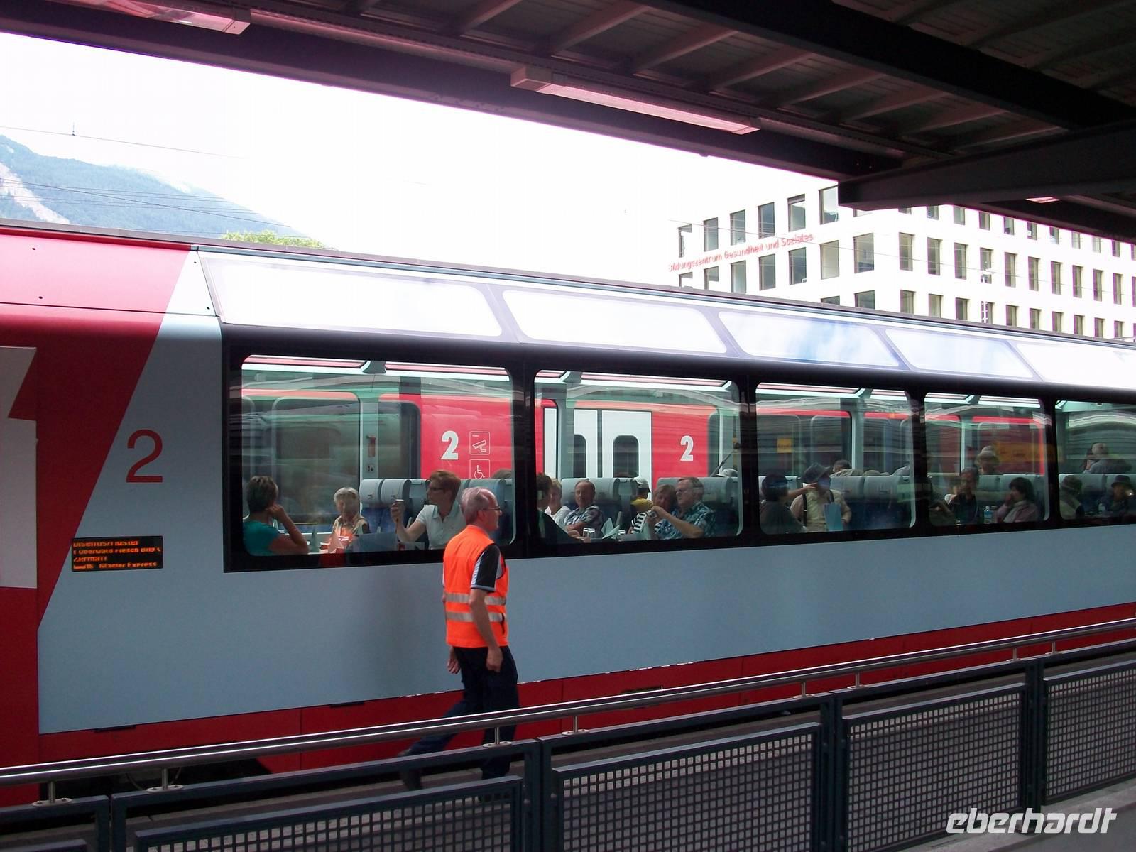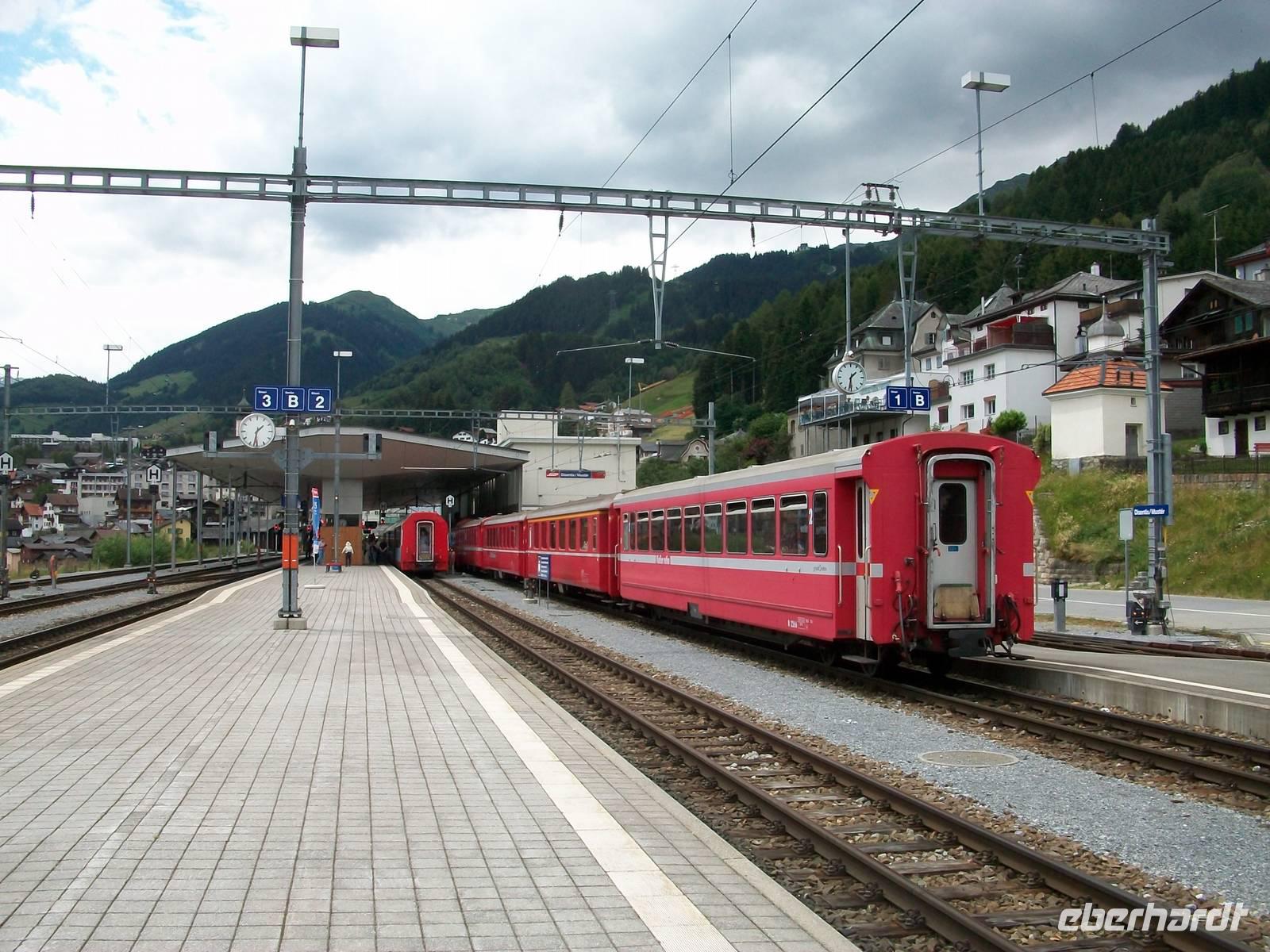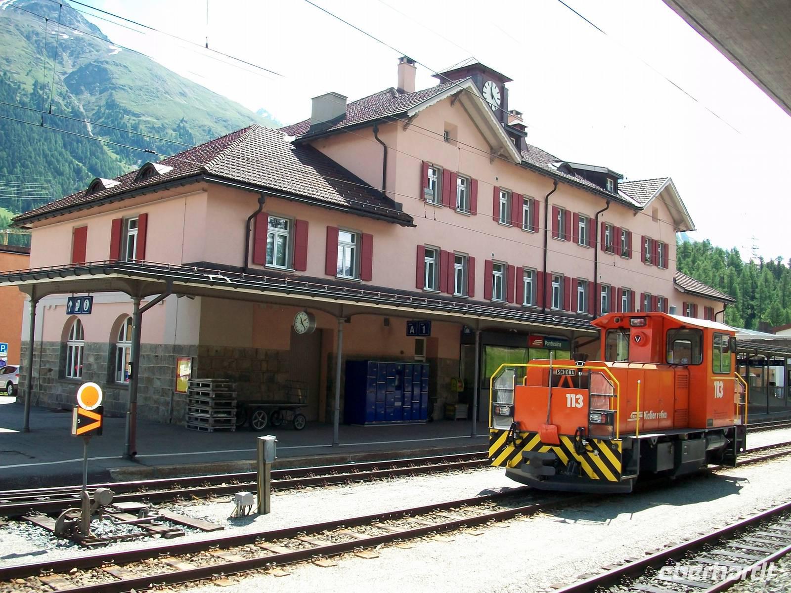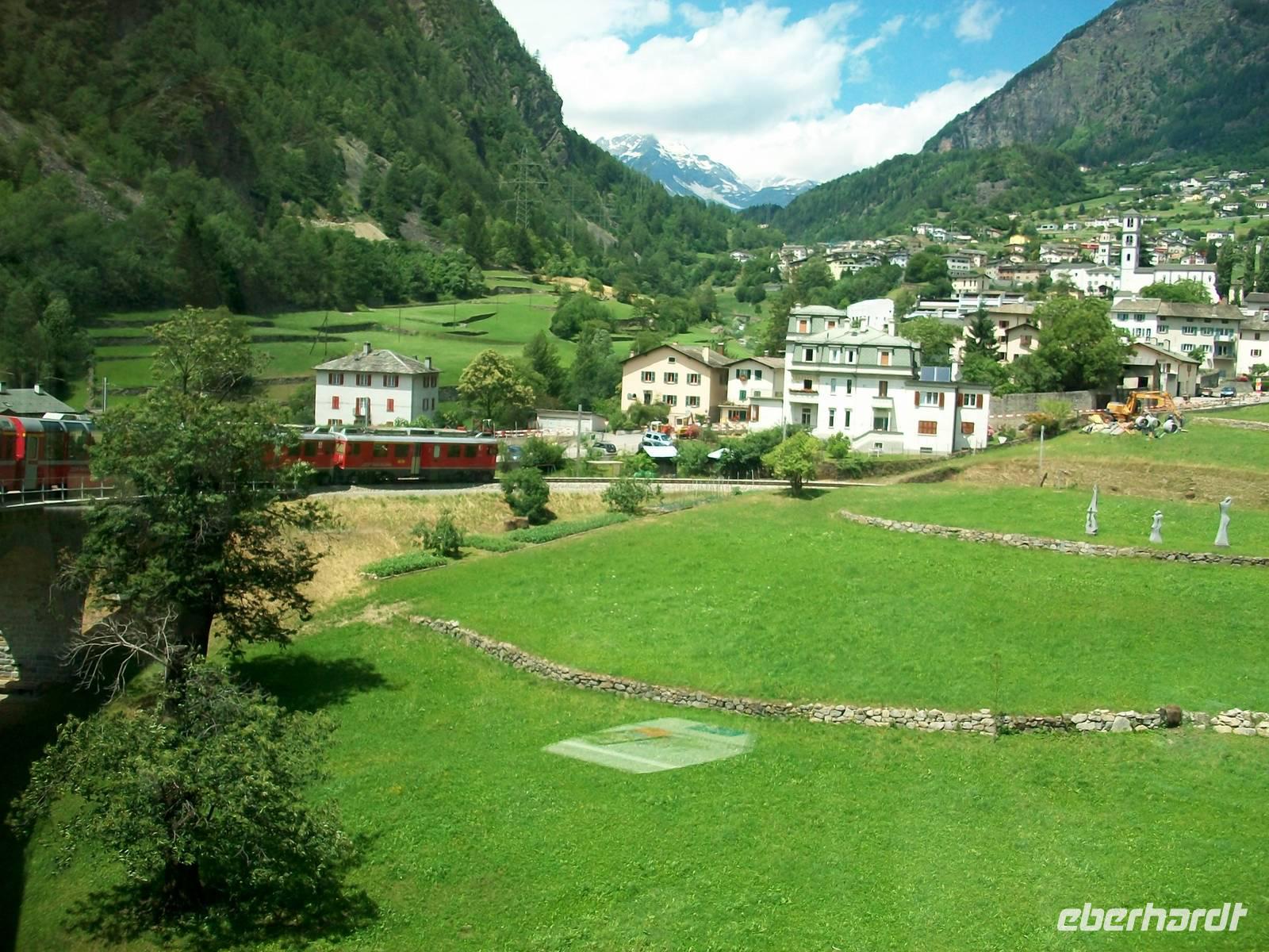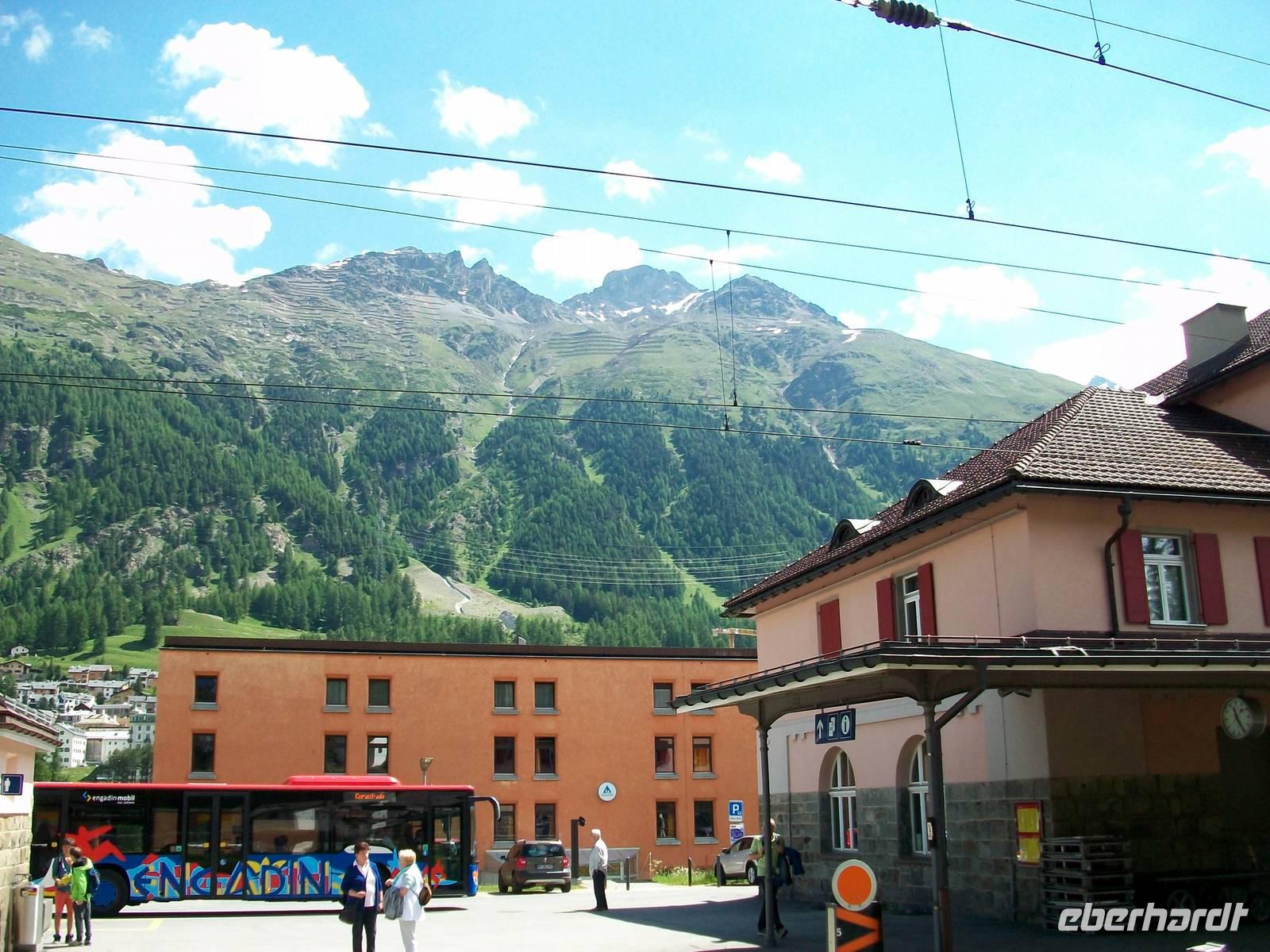 Dann geht es wieder zu Tal, wir folgen dem Inn aufwärts und langen im Ort Pontresina an. Hier beginnt nun eine halbe Stunde später unsere Fahrt mit dem Bernina- Express.