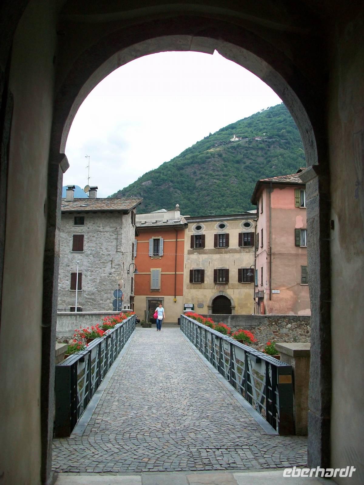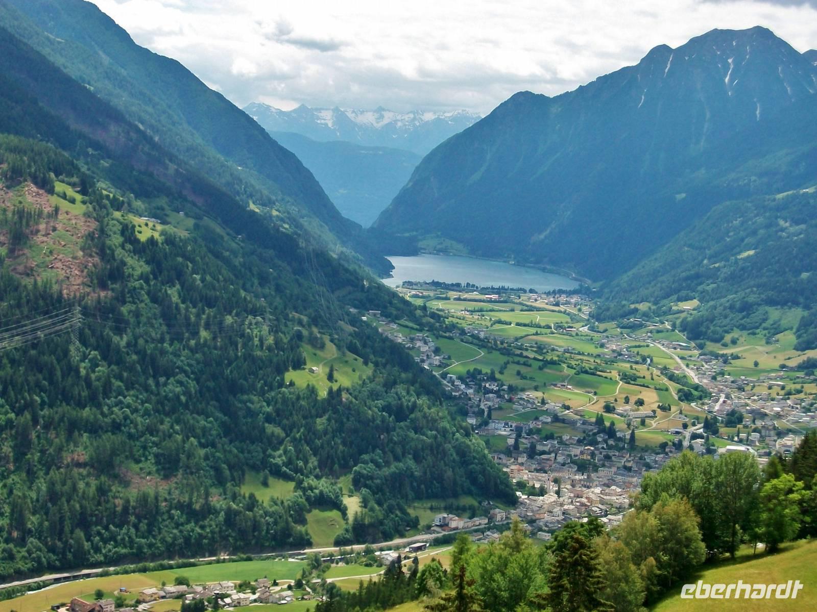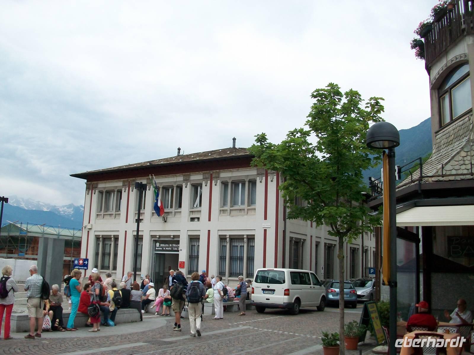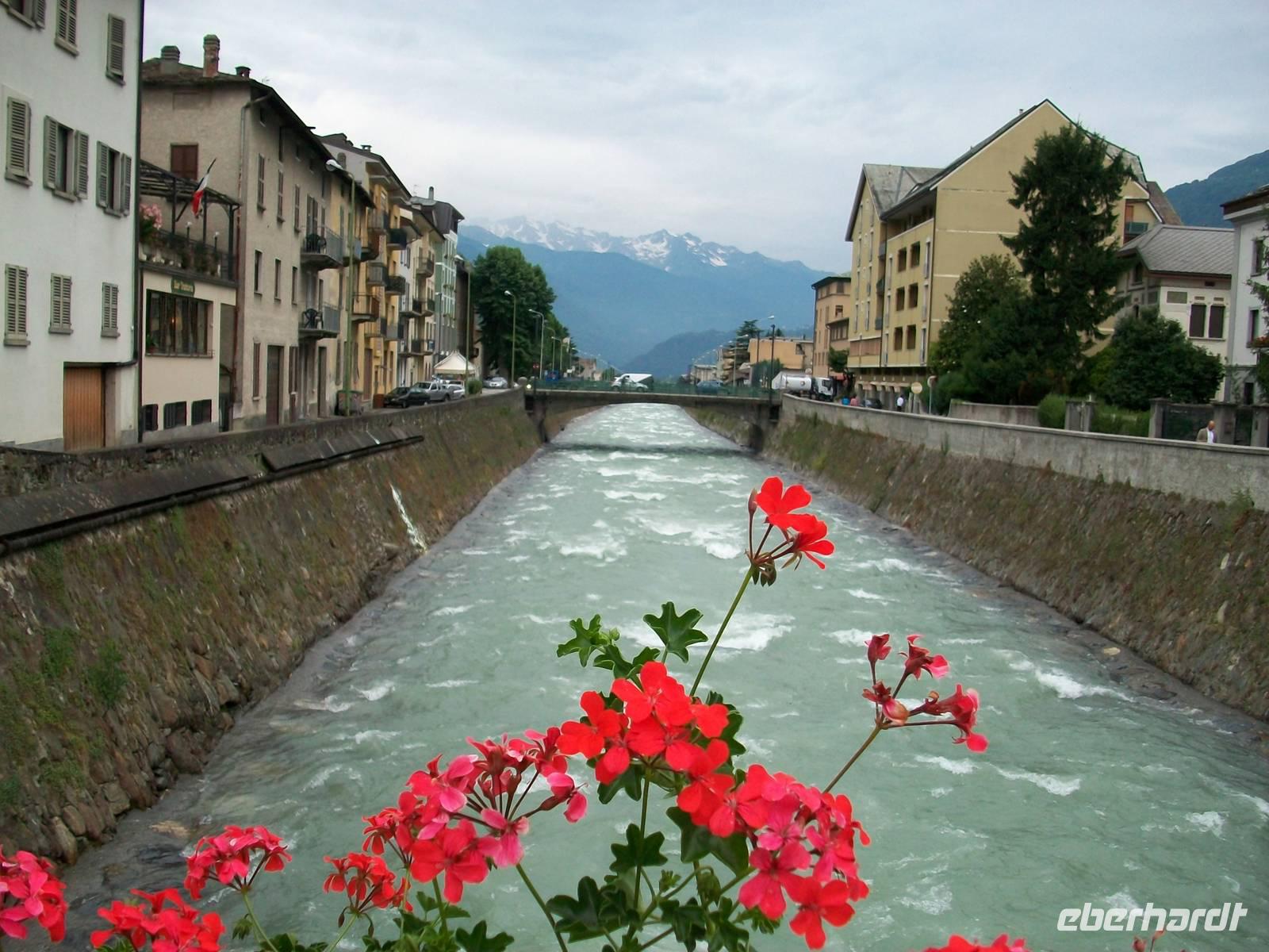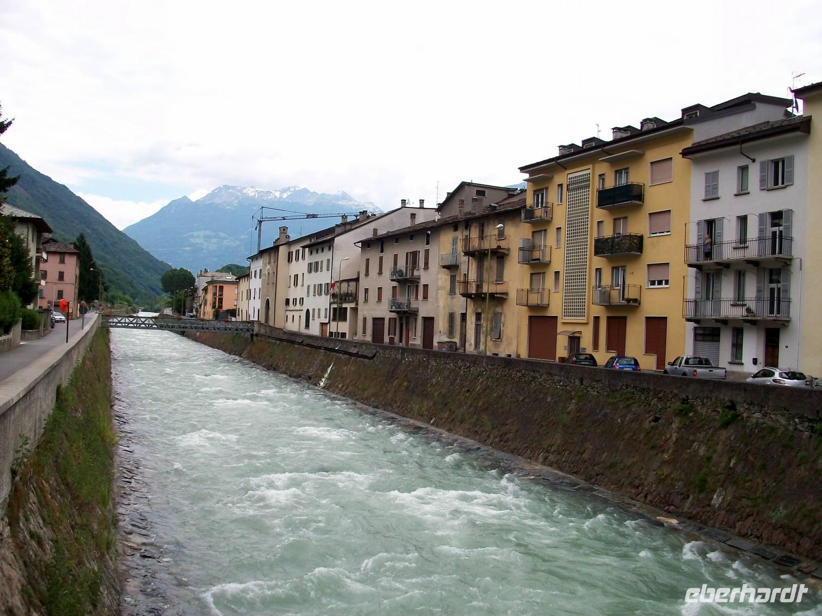 Dann senkt sich die Strecke wieder ab; durch zahlreiche Kehrtunnels gelangen wir nach unten und im Tal ist auch schon der Ort Poschiavo zu sehen, von hier oben ist es ein Blick wie auf ein Spielzeugland. Doch, die Häuser werden größer; wir sehen die schöne Architektur, gelangen am Lago di Poschiavo vorbei, einem sehr romantischer See und haben noch einen Fahrthöhepunkt vor uns: das berühmte Kreisviadukt von Brusio. Einmal im Kreis herum, und wir sind schon in Italien angelangt. Der Ort Tirano ist der Endpunkt unserer Zugreise, er empfängt uns mit warmen Temperaturen und beim Italiener um die Ecke holen wir uns die nötige Stärkung bei einem leckeren Mittagessen. Nun verbleibt noch Zeit für eigene Erkundungen im reizvollen Ort, sehr authentisch ist die Altstadt mit pittoresken Häusern und Gassen, durchflossen vom Fluss Adda. Das Tal in dem Tirano liegt ist umgeben von den schneebedeckten Spitzen der Alpen, dieser Aufenthalt hat sich gelohnt.