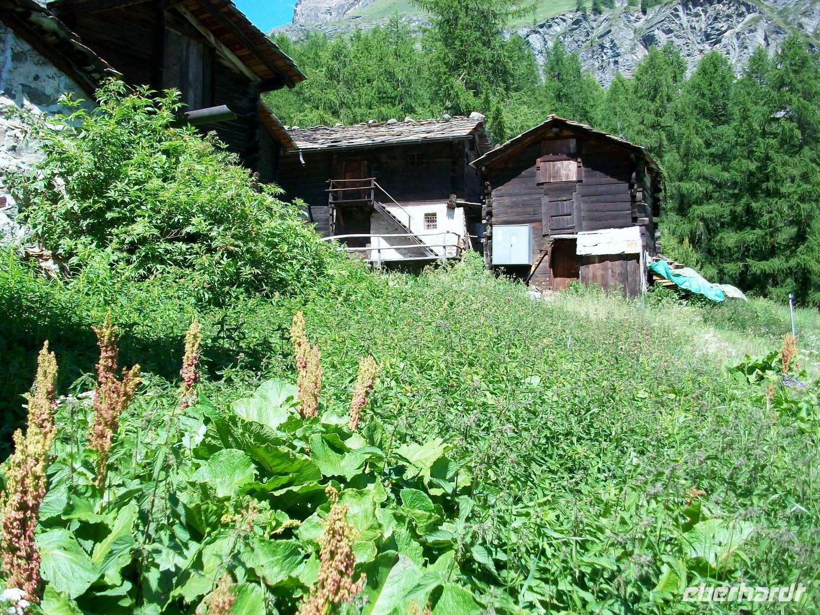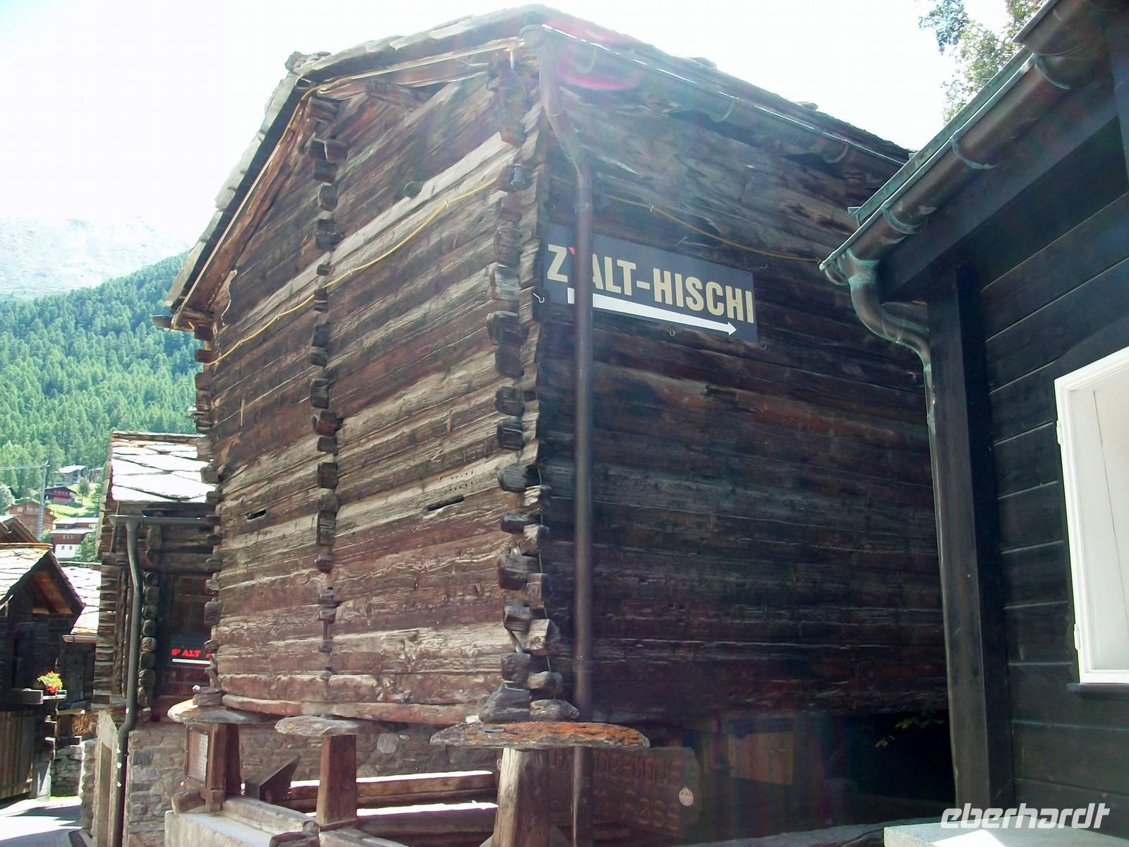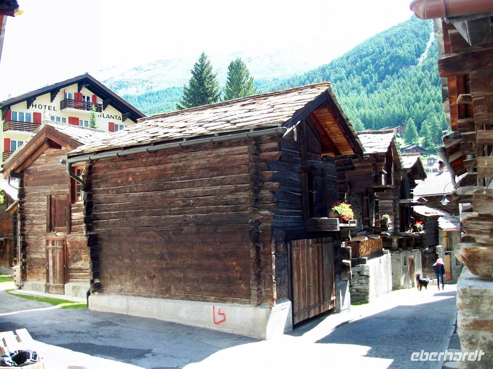 Als wir gegen zwei starten, können die Regenschirme geschlossen bleiben; wir gehen gemeinsam durch den ältesten Teil des Ortes und staunen über die alten Walliser Holzhäuser die uns aus einer längst vergangenen Epoche überliefert wurden.
