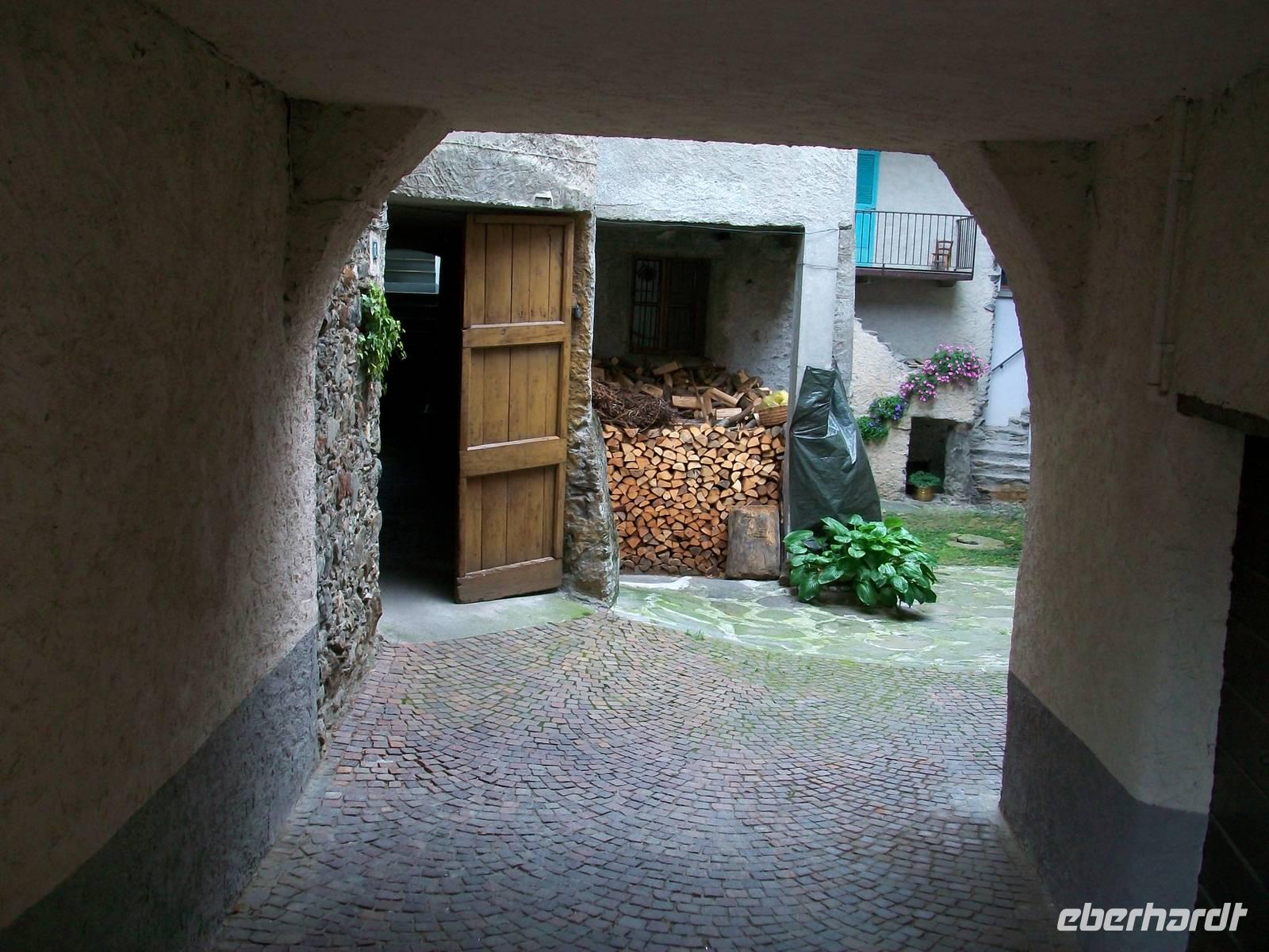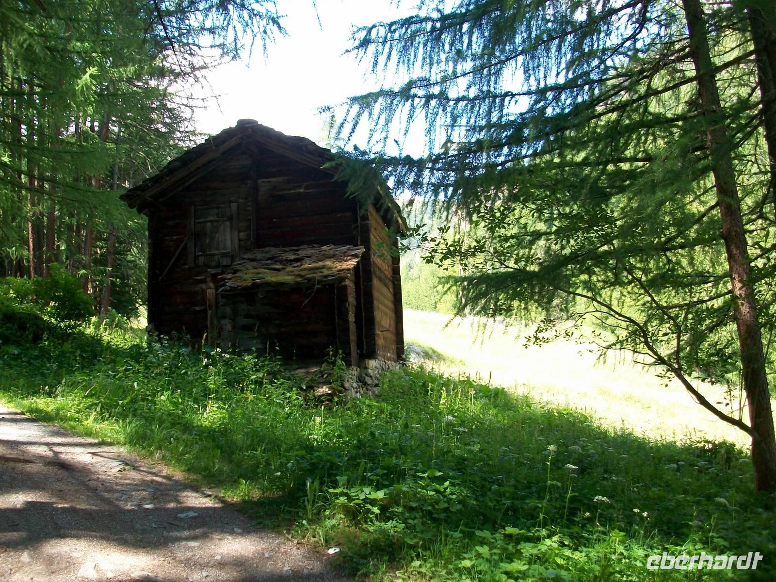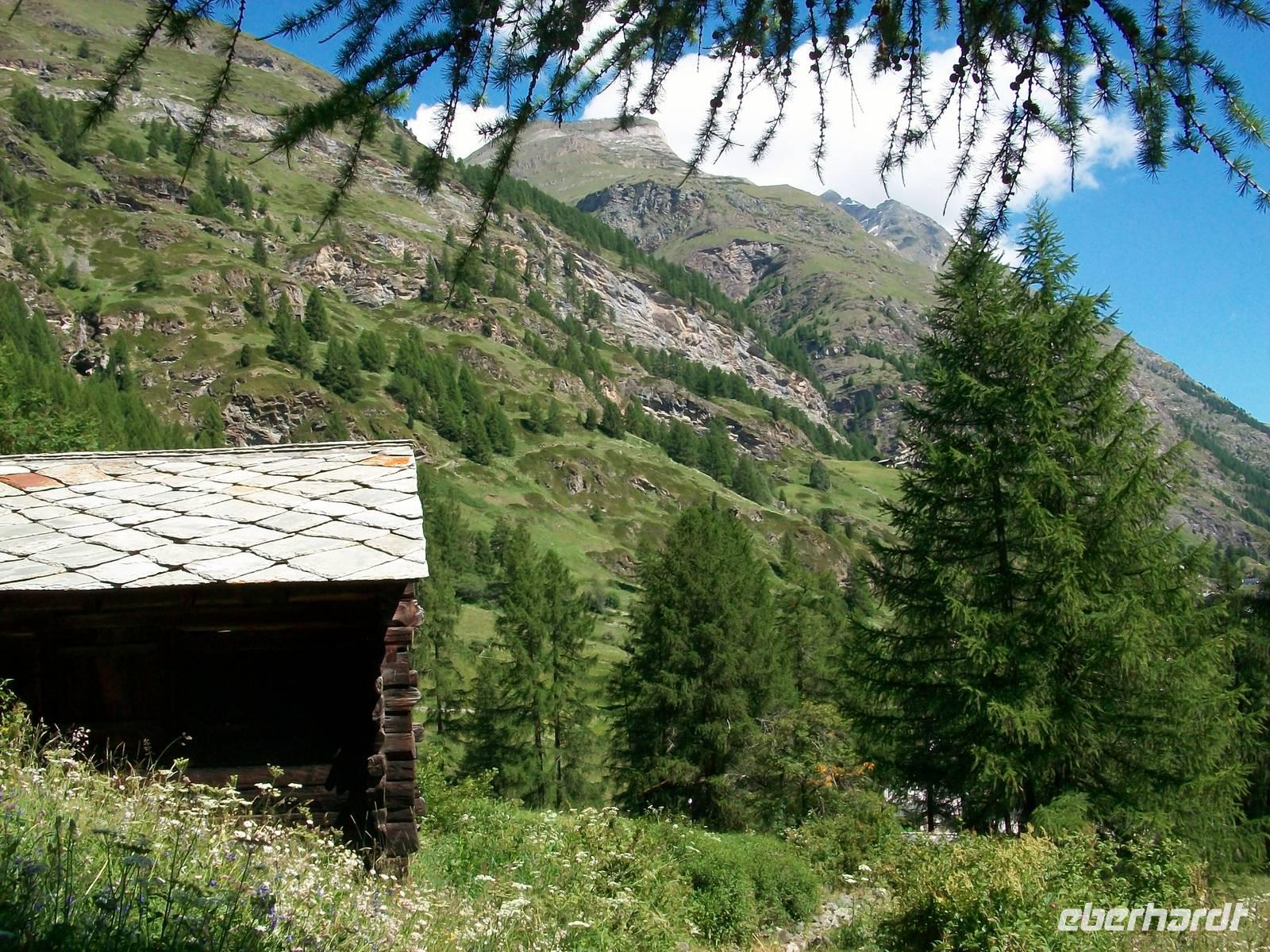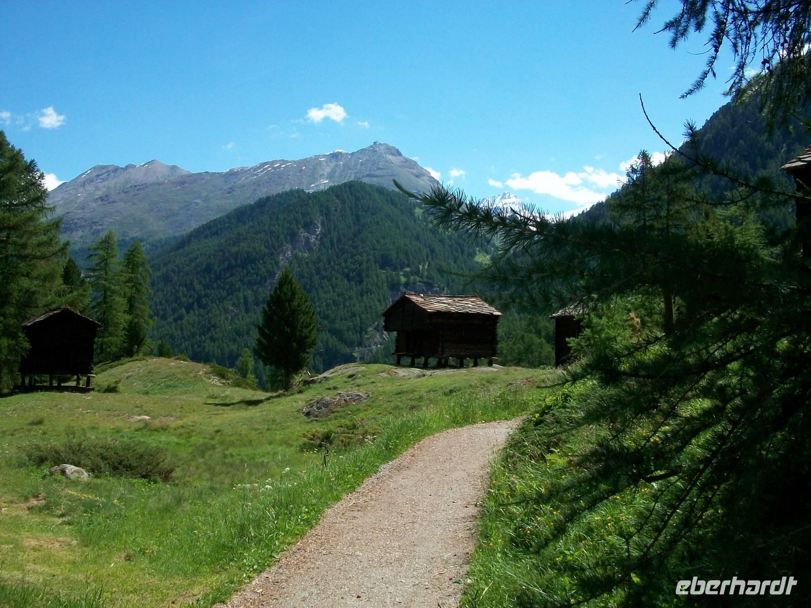Als wir gegen zwei starten, können die Regenschirme geschlossen bleiben; wir gehen gemeinsam durch den ältesten Teil des Ortes und staunen über die alten Walliser Holzhäuser die uns aus einer längst vergangenen Epoche überliefert wurden.