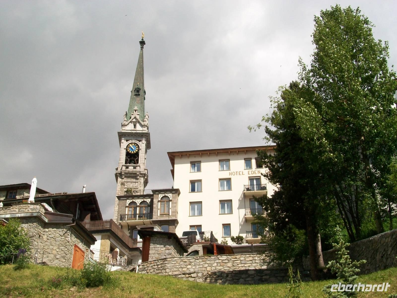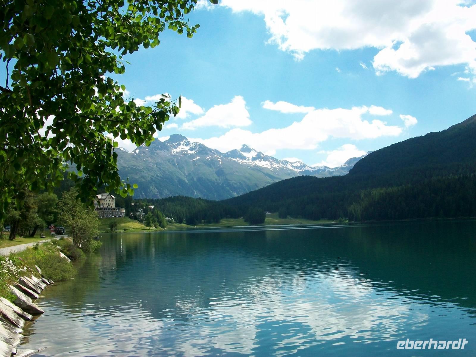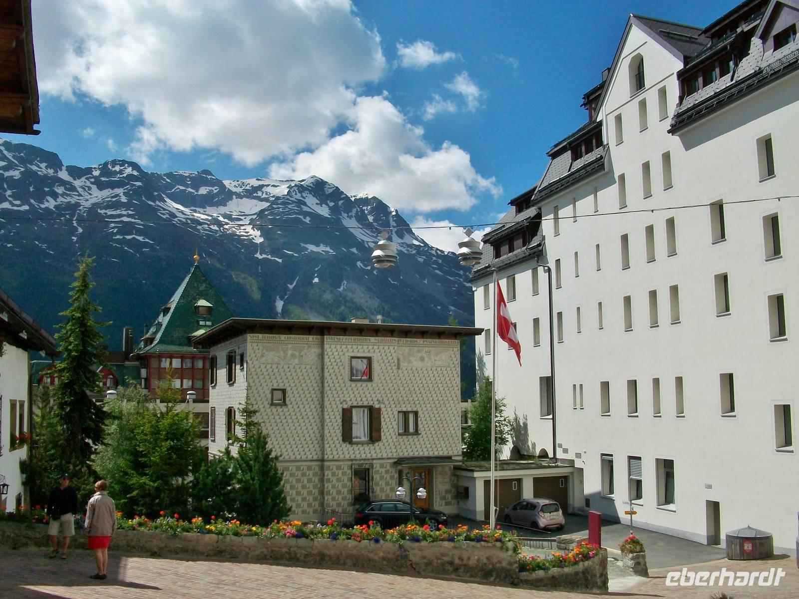 Noch einmal über den Flüela- Pass und durch die malerischen Orte des Engadins; unser erstes Ziel heißt Sankt Moritz. Doch zunächst folgen wir dem noch jungen Inn der hier En heißt aufwärts. Über zahlreiche Windungen und Steilstufen sendet der Fluss seine grünen Fluten zu Tal; von der Straße aus genießen wir diese schönen Impressionen, begleitet vom Sonnenschein. An den Häusern der schönen Orte ist der typische Kratzputz angebracht, an einigen Gebäuden ist er sehr kunstvoll gestaltet.