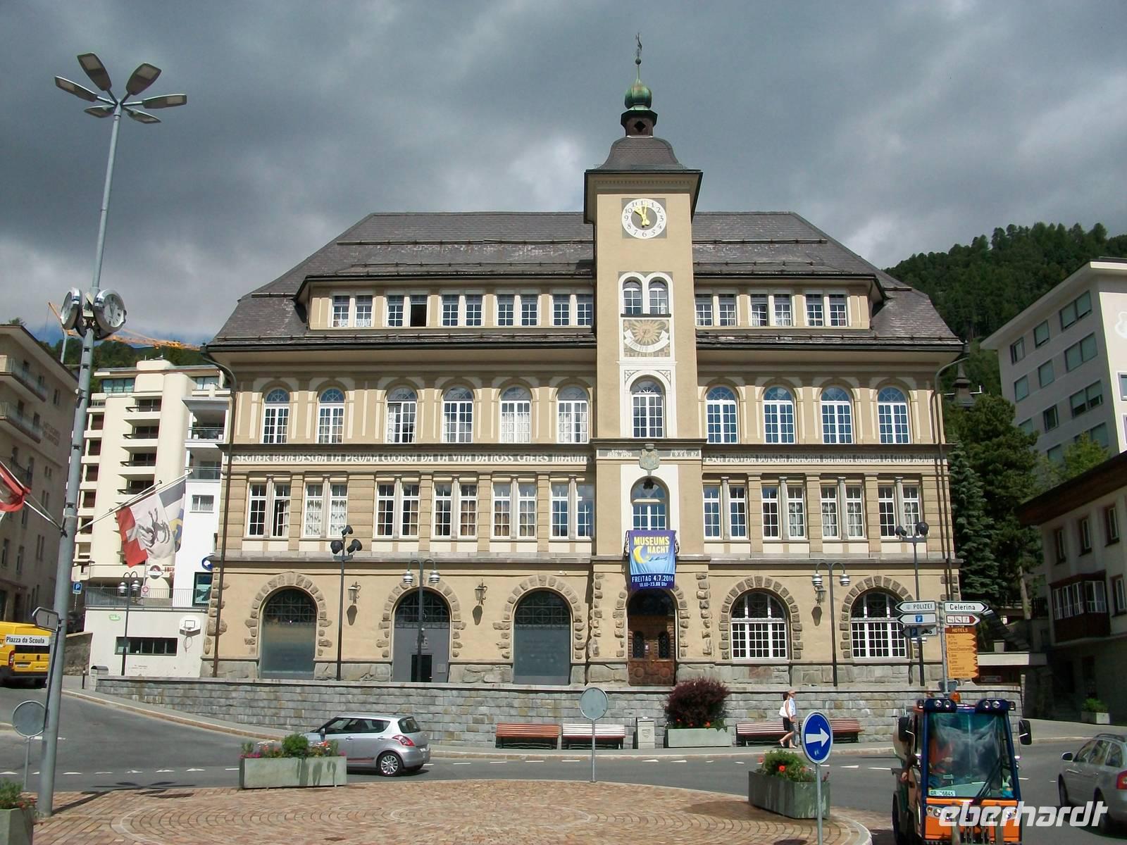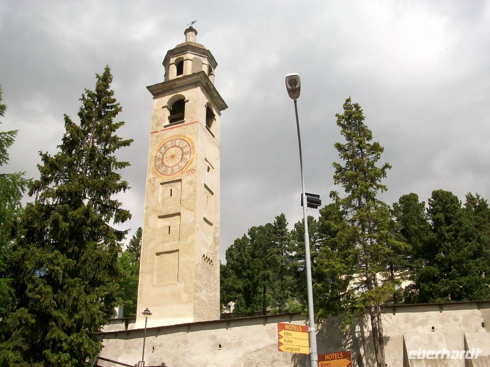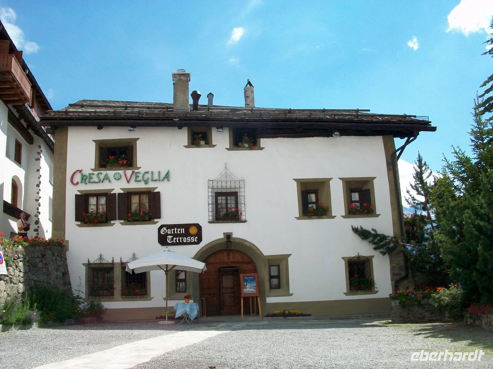 Noch einmal über den Flüela- Pass und durch die malerischen Orte des Engadins; unser erstes Ziel heißt Sankt Moritz. Doch zunächst folgen wir dem noch jungen Inn der hier En heißt aufwärts. Über zahlreiche Windungen und Steilstufen sendet der Fluss seine grünen Fluten zu Tal; von der Straße aus genießen wir diese schönen Impressionen, begleitet vom Sonnenschein. An den Häusern der schönen Orte ist der typische Kratzputz angebracht, an einigen Gebäuden ist er sehr kunstvoll gestaltet.