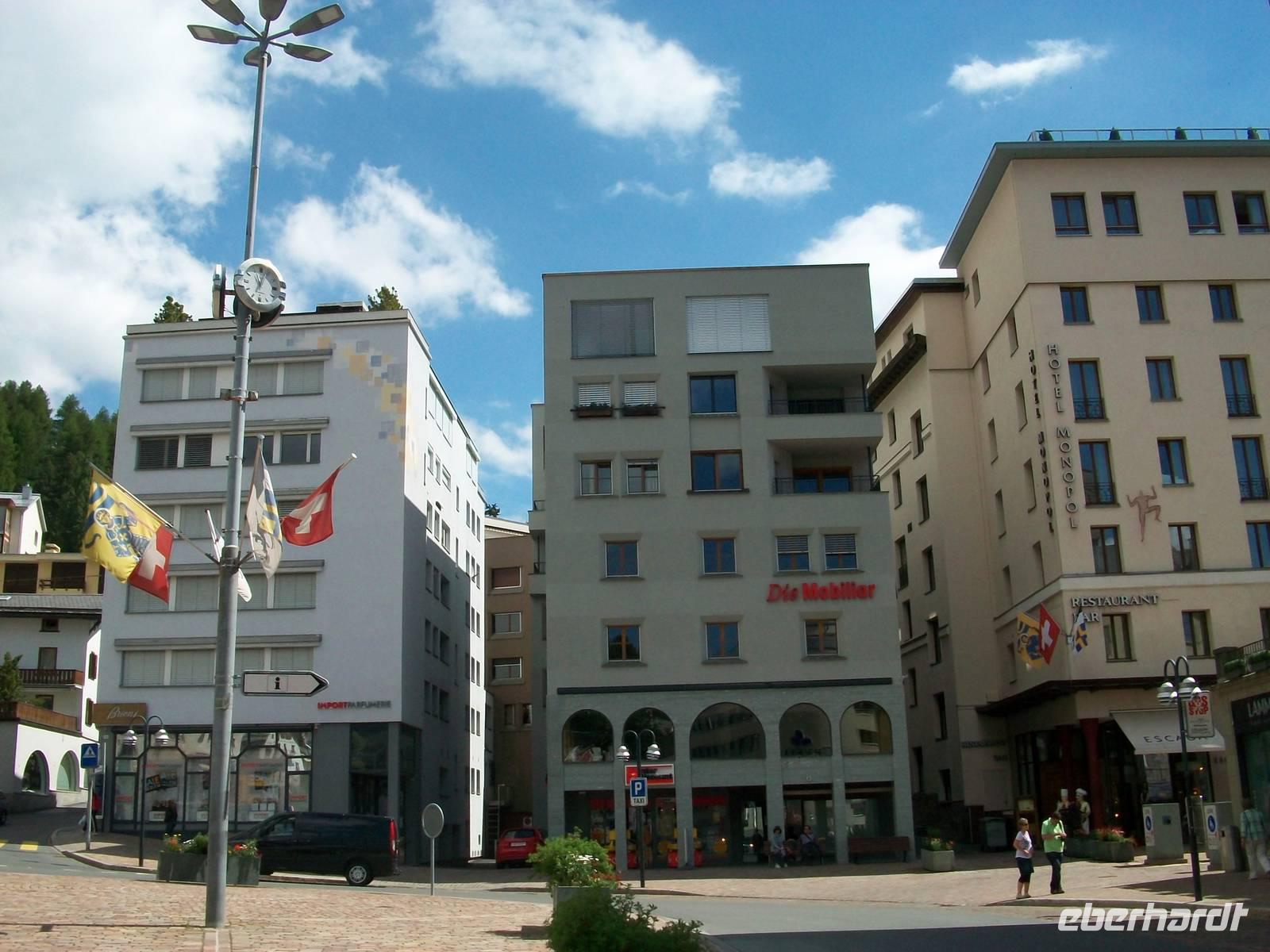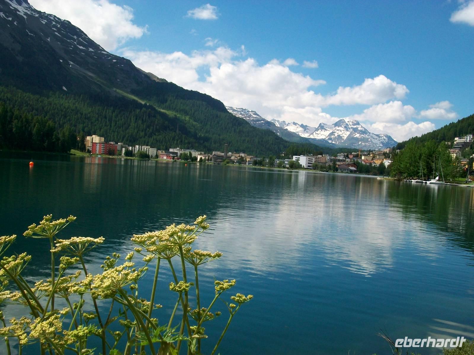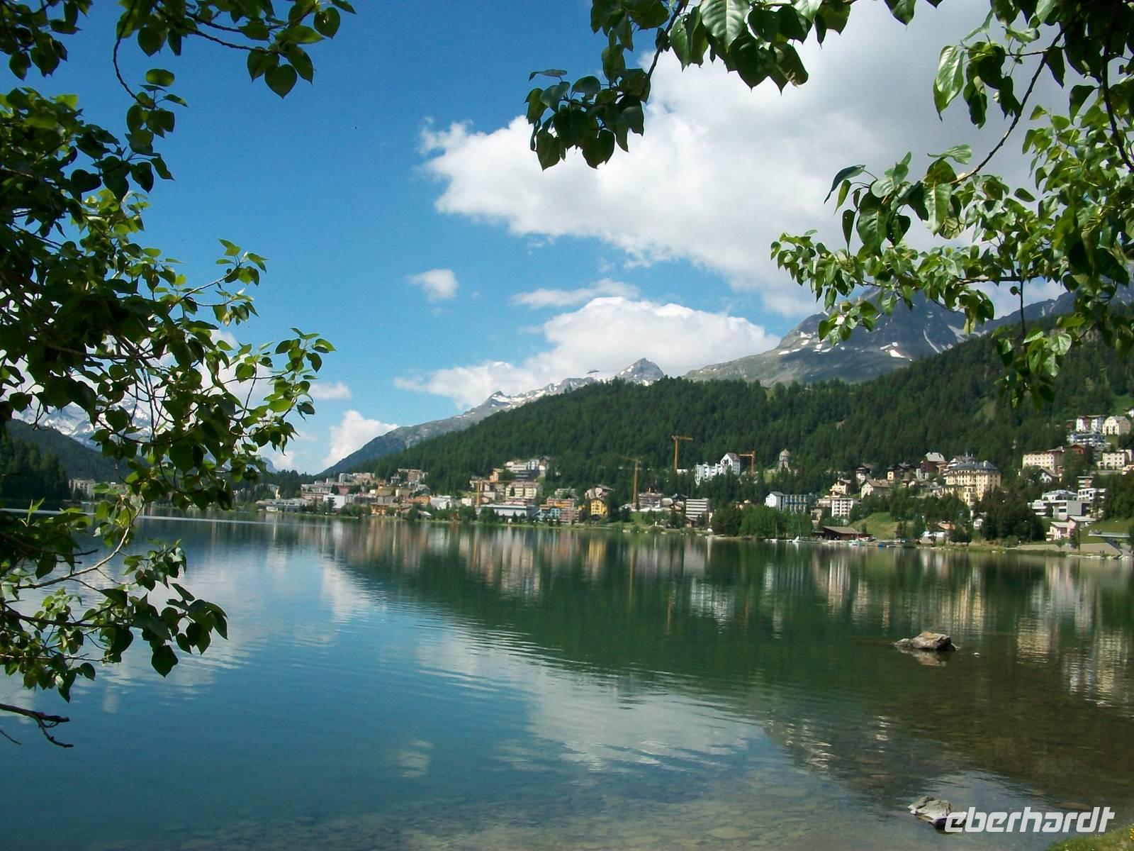 Dann kommen wir in Sankt Moritz an; vom Bahnhof gelangen wir durch das Parkhaus und über eine Rolltreppe hinauf in den mondänen Ort. Bei einem Bummel erschließen wir uns die Welt der Reichen und Schönen, sehen die Edelboutiquen und gepflegten Straßenzüge und unten am See erblicken wir die schöne Hochgebirgslandschaft die den Ort umgibt.