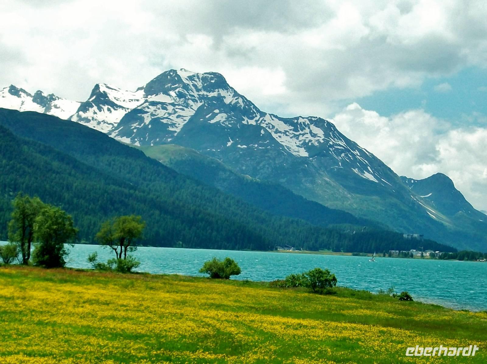 Nach diesem Besuch suchen wir uns ein schönes Plätzchen zu unserem Mittagsimbiss; inmitten einer schönen Blumenwiese am See bei Silvaplana genießen wir eine kurze Mittagsruhe.