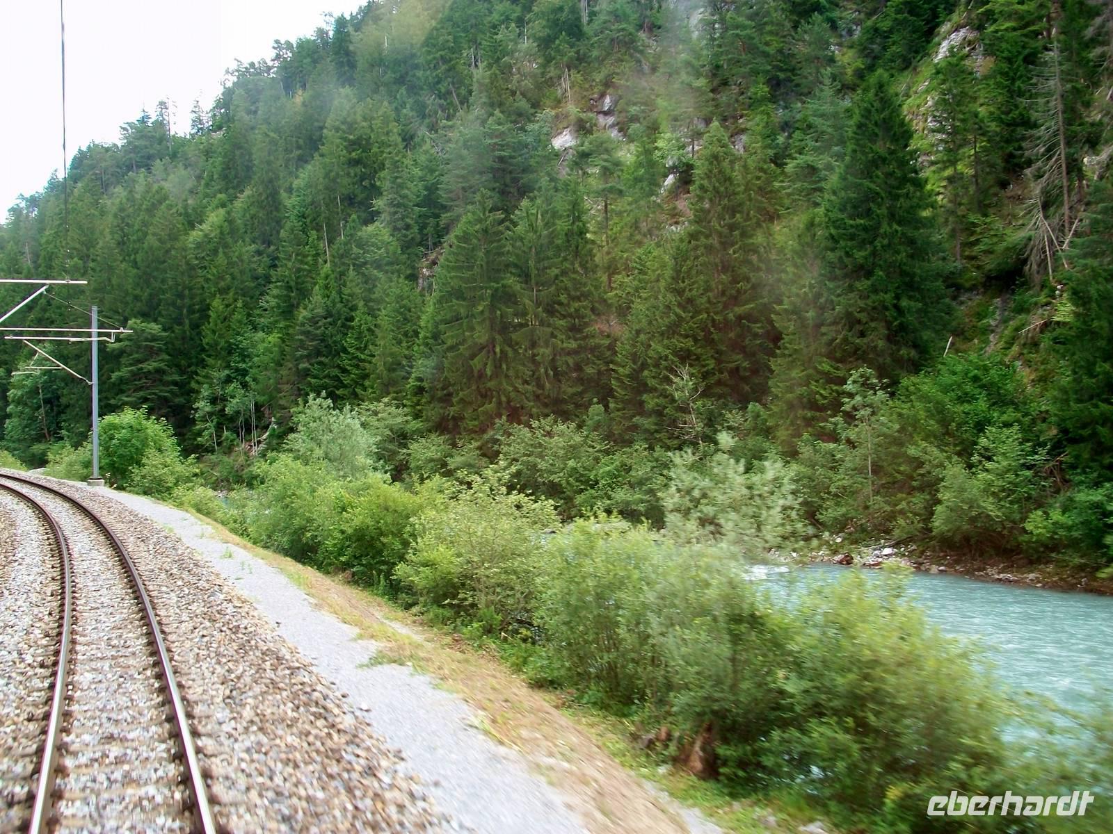 Wild und unbändig schlängelt sich der junge Rhein entlang schroffer Felsen, die Bahnstrecke führt direkt hindurch und wir sehen die stürmischen Fluten zu Tal strömen.