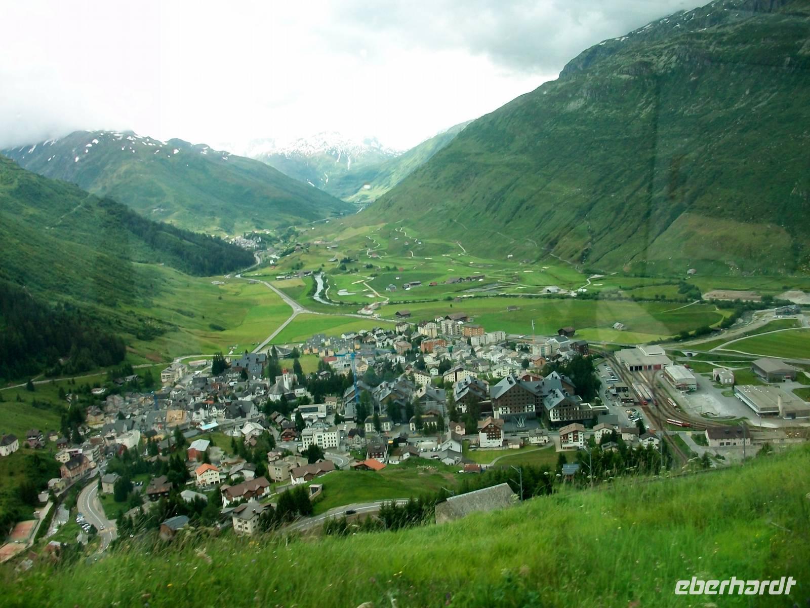 Später treten die Berge zurück, die Landschaft wird lieblicher, das Grün dominiert nun den Blick. Bald kommt auf der rechten Seite der monumentale Bau der Abtei Sankt Martin in das Blickfeld, wir sind in Disentis angelangt. Hier bekommen wir nun eine Lok mit Zahnradtechnik, mit ihr erklimmen wir als nächstes den Oberalppass. Hier oben, über 2 000 Meter, erwartet uns eine karge Landschaft; Wolken umwabern uns, sie lassen Tropfen auf die Fenster des Zuges fallen. Lange halten wir uns aber in dieser unwirtlichen Gegend nicht auf, unten im Ort Andermatt angelangt, setzt sich die Sonne wieder durch.
