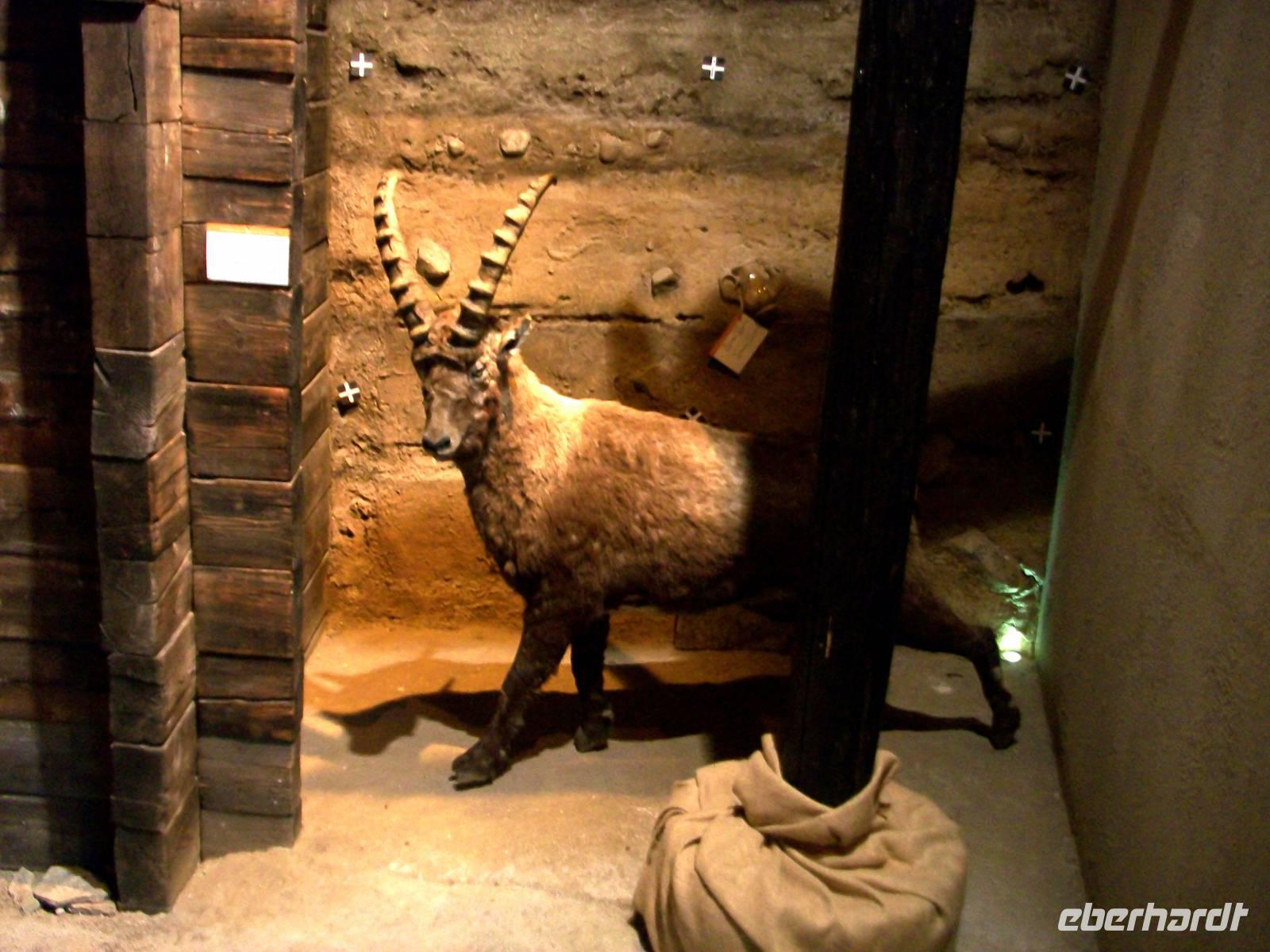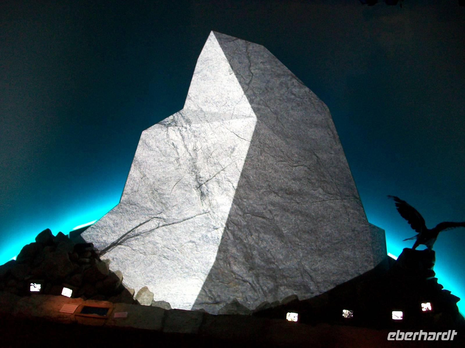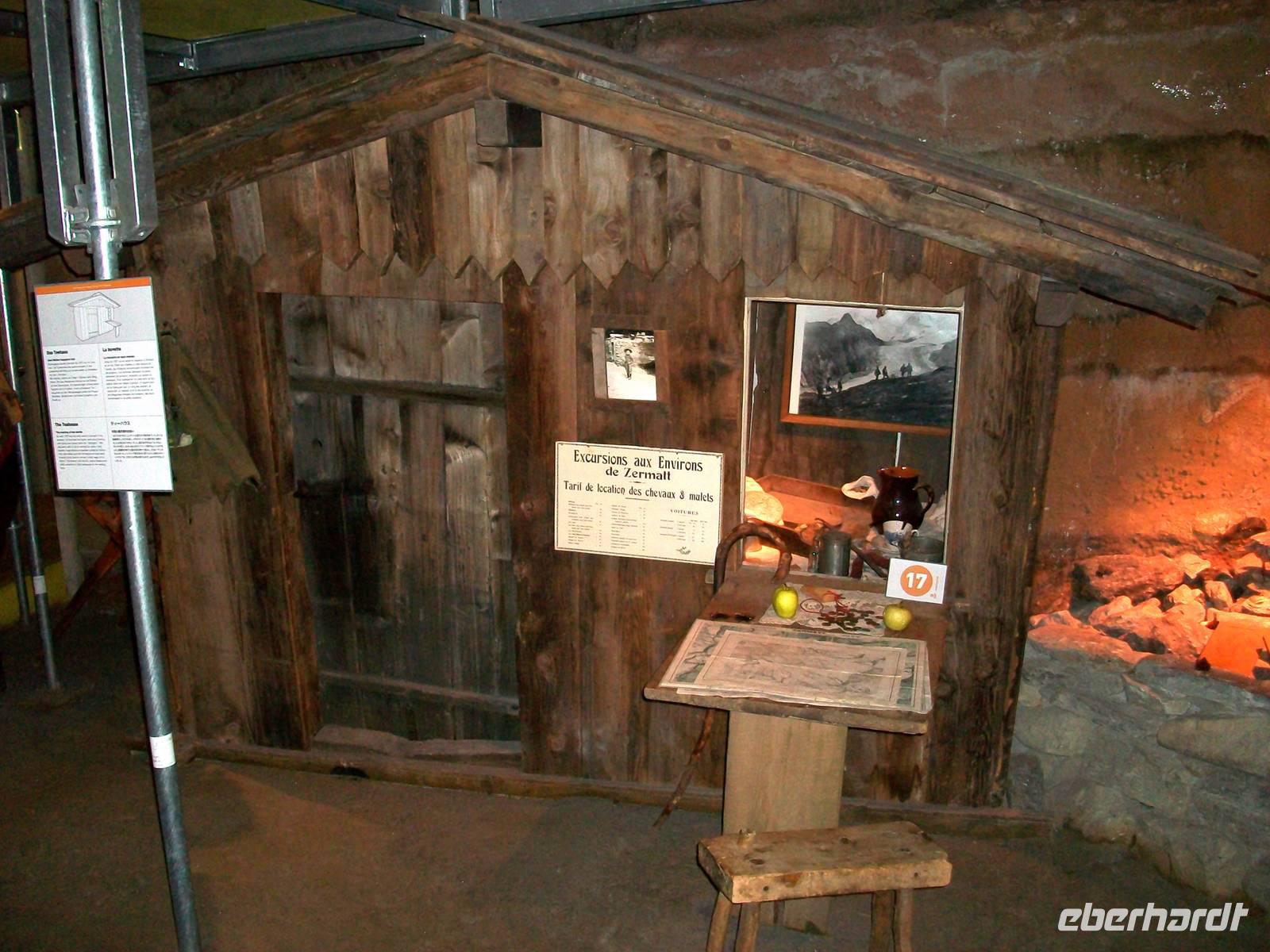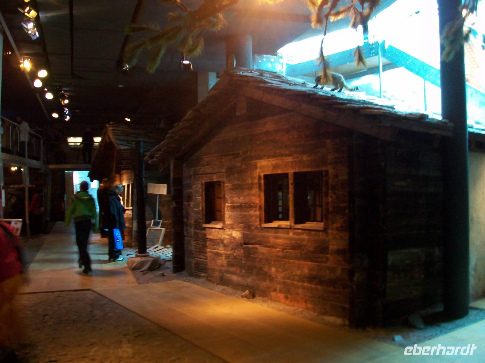 Dann tauchen wir im Museum ab in eine ganz andere Welt. Hier, tief unter der Erde, sehen wir den Ort wie er vor über hundert Jahren ausgesehen haben mag. Da sind sie wieder zu sehen: die Holzhäuser, aber auch eine kleine Kapelle; wir können in die Wohnstuben der Älpler hineinschauen, sehen so manches Getier und eine Hotelrezeption aus dem 19. Jahrhundert. Auf der Leinwand läuft gerade ein Film mit der Bergsteigerlegende Luis Trenker; nach diesen Bildern entfaltet sich vor unseren Augen ein stilisiertes Matterhorn und eine beeindruckende Installation beginnt: der Berg der Berge im Wandel der Jahreszeiten, immer in einem neuen Licht erstrahlend- einfach grandios!