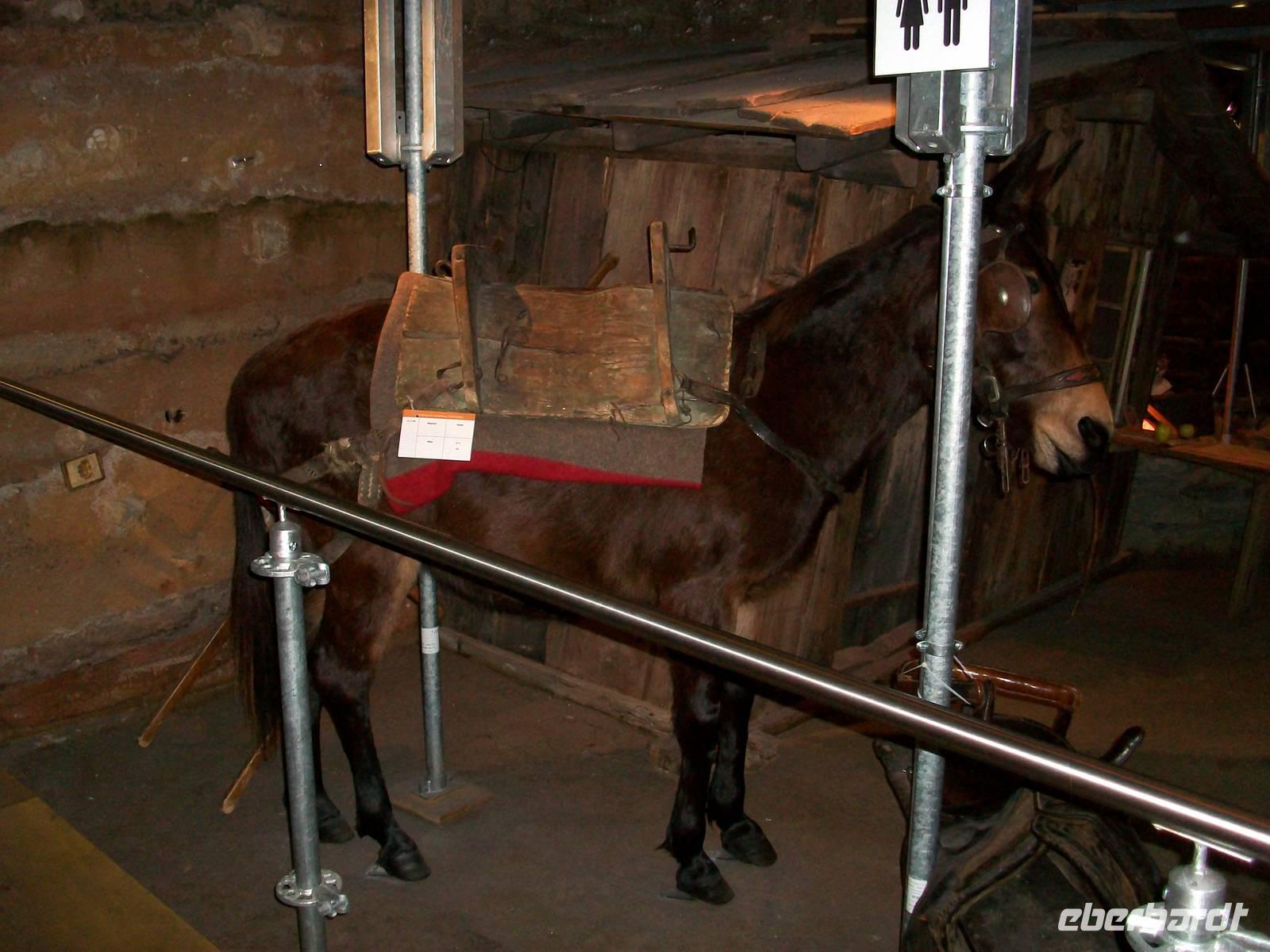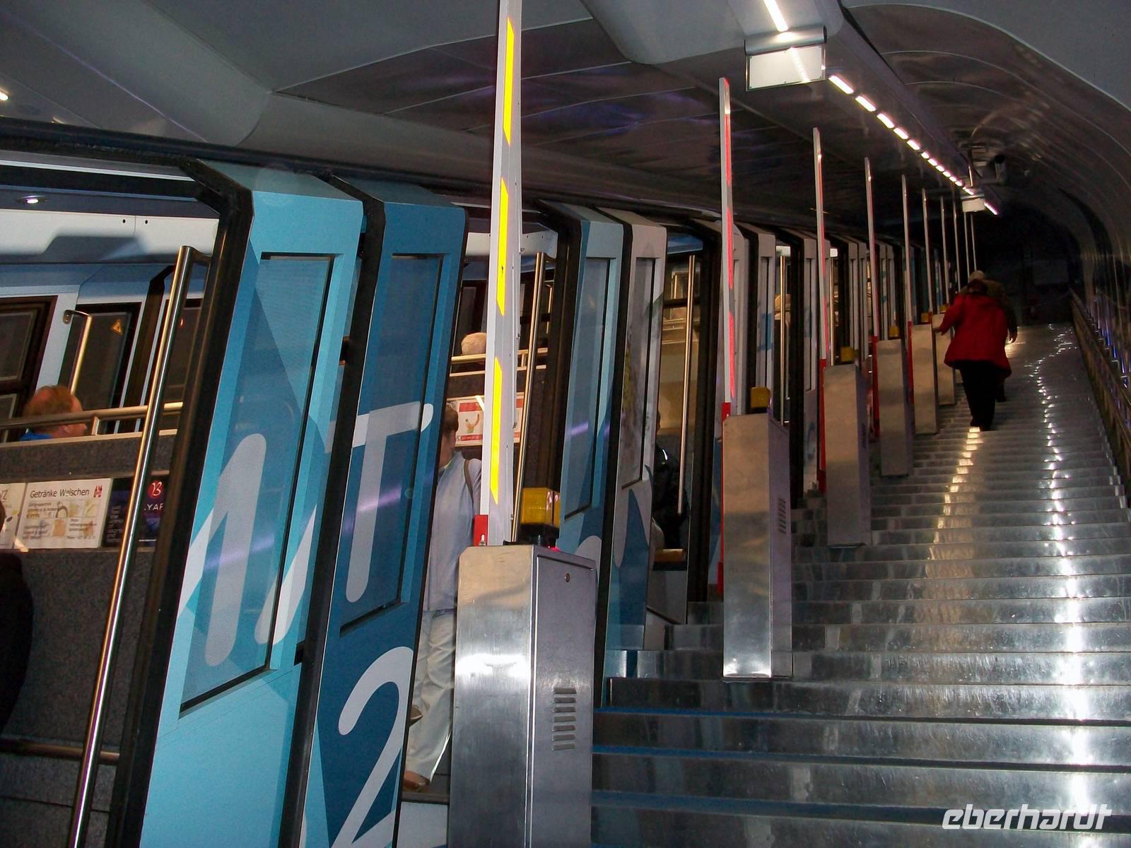Zunächst geht es durch einen Tunnel tief in den Berg hinein. Dann gelangen wir durch ein Drehkreuz direkt zur Bahn die uns dann im Berg selbst hinauf bringen wird.