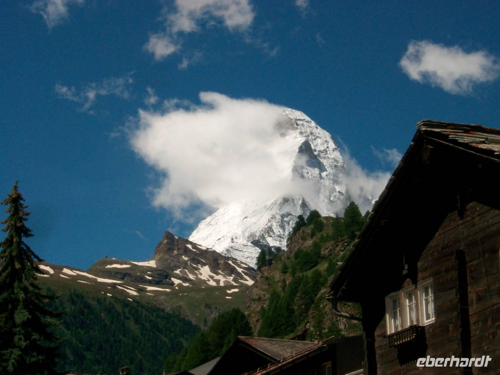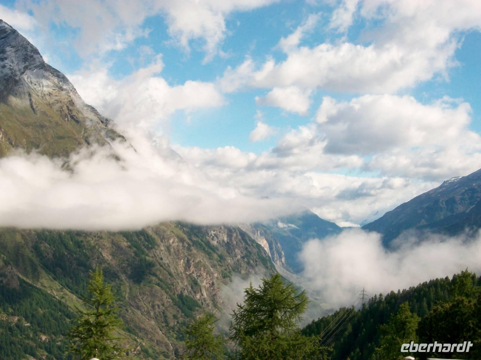 1.7.2014. Auch wenn am Morgen dicke Wolken von Süden herüber über das Matterhorn quellen- es sind Schönwetterwolken die uns Petrus zur Dekoration des blauen Himmels geschickt hat.