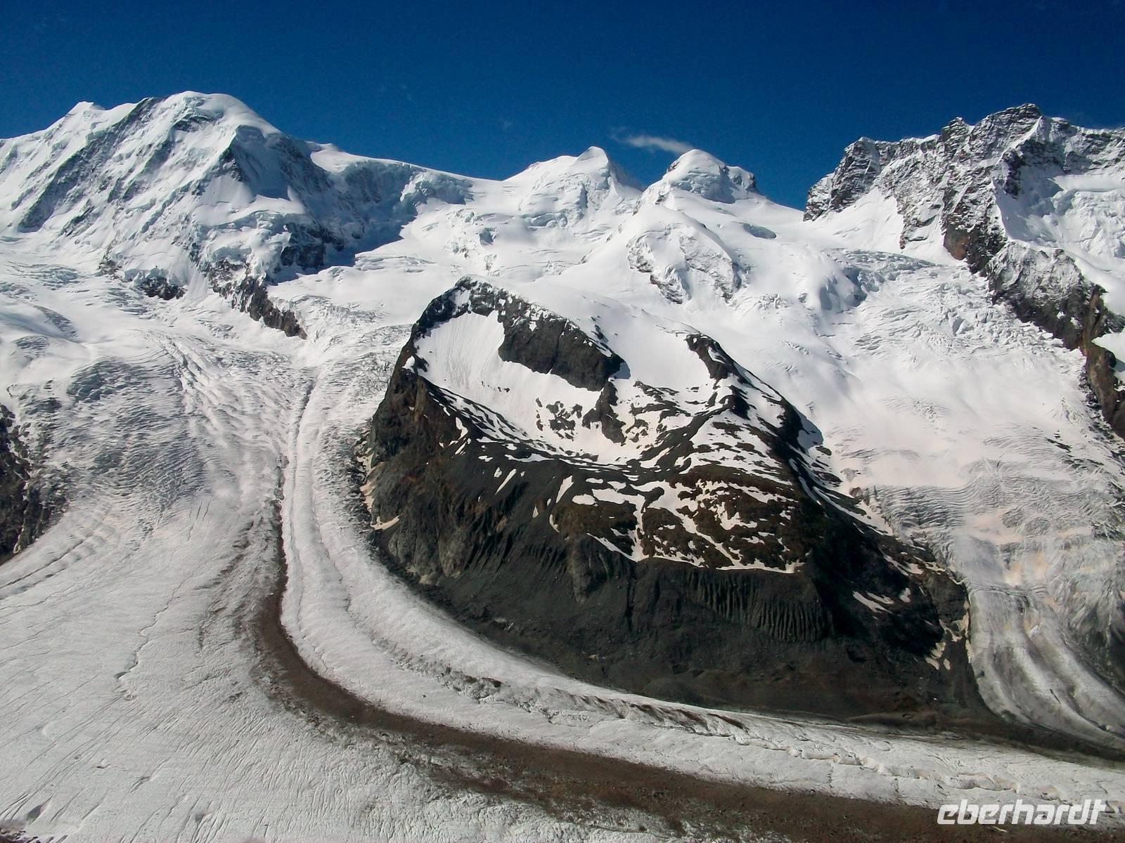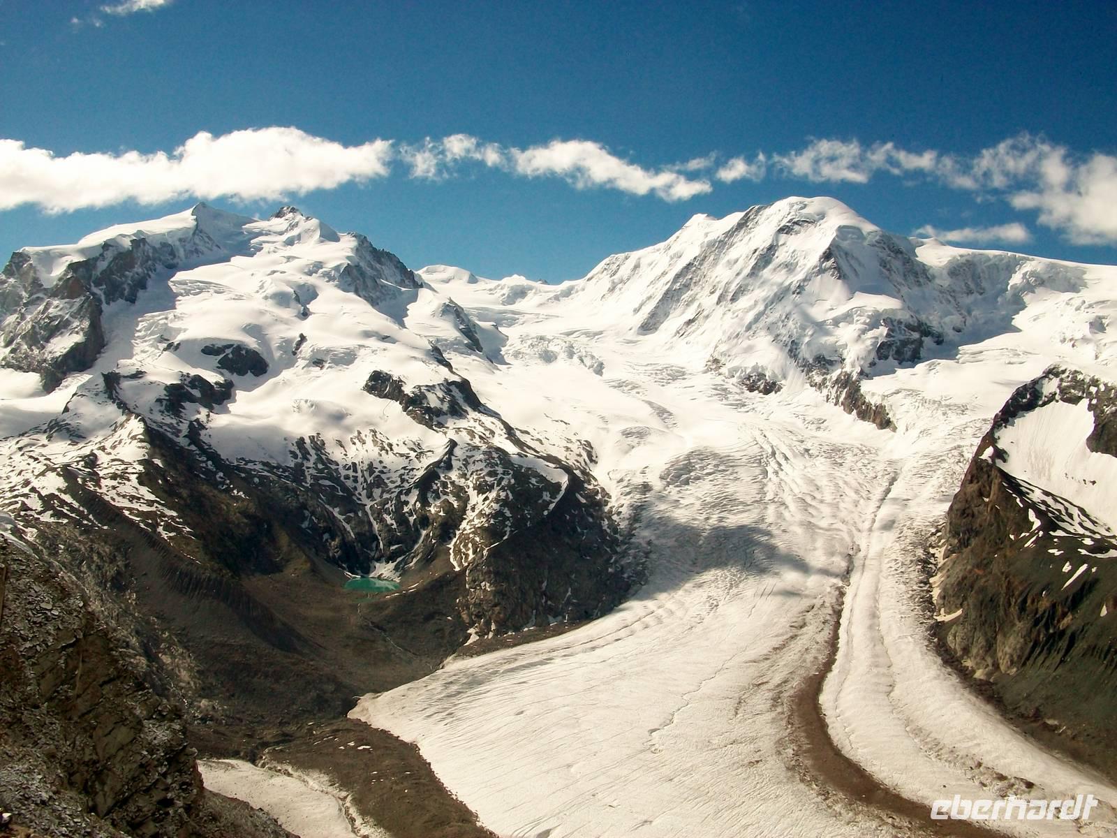 Dann langen wir auf über 3 000 Meter an; hier oben offenbart sich das phantastischste Bergpanorama was es nur geben kann. Im Süden das Monte Rosa Massiv, dann Castor und Pollux, das Breithorn hat noch eine Wolkenmütze auf, auch das Matterhorn verbirgt sich vorerst unseren Blicken.