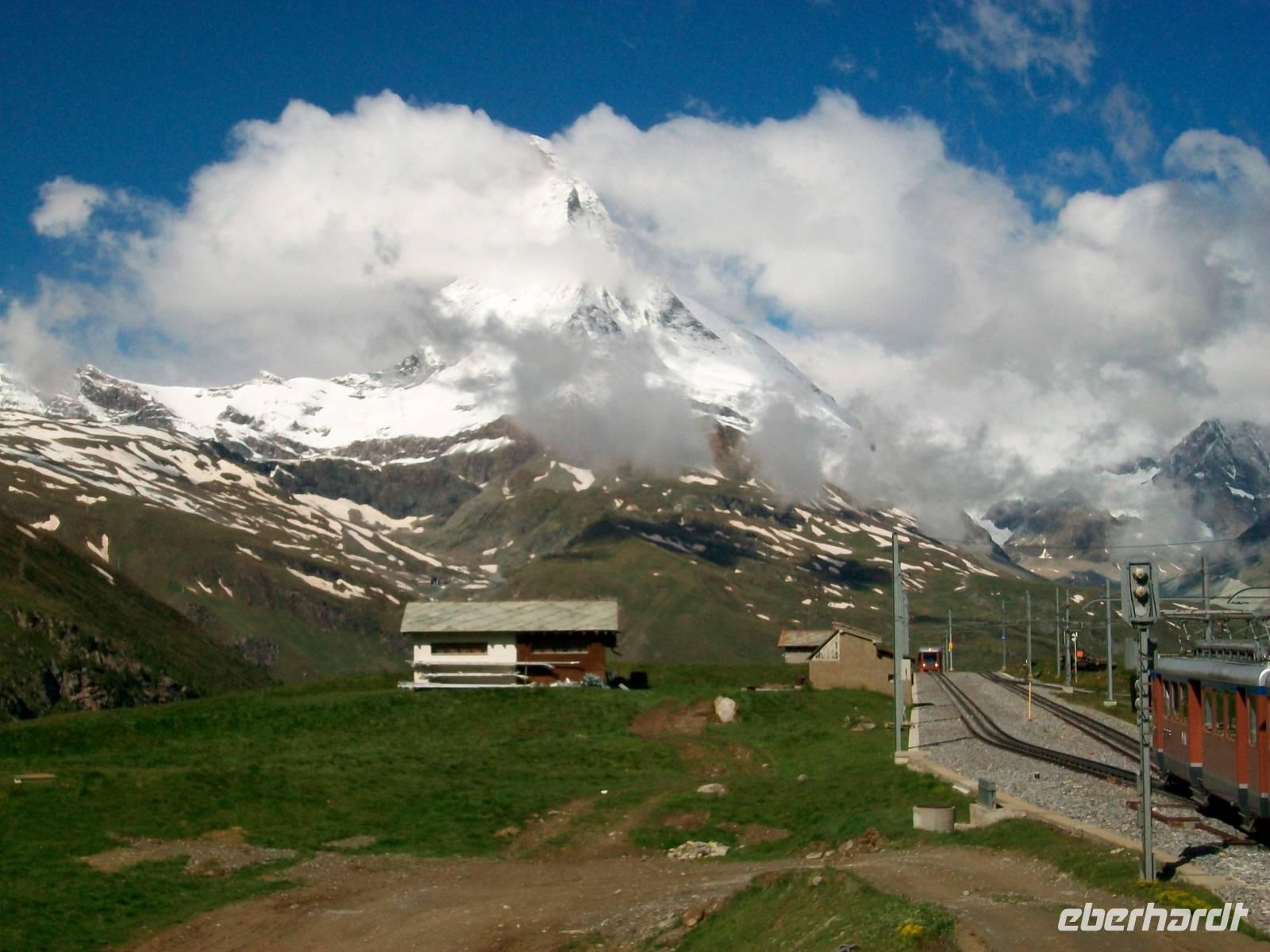 8.30 Uhr. Voller Erwartung hat sich der Großteil unserer Gruppe eingefunden; der Weg zur Talstation ist nicht weit und zwanzig Minuten später sitzen wir in der Zahnradbahn die uns hinauf zum Gornergrat bringen wird. Zunächst durchfahren wir ein Waldstück; bei Findelbach stürzt ein Wasserfall tosend zu Tal, dann verschwinden wir erst einmal in einem Tunnel. Die Sicht ist gut, der Blick kann weit ins schöne Land schweifen und wie wir an Höhe gewinnen so tritt der Baumbestand zurück und bald sehen wir die 4 000er im ewigen Schnee.