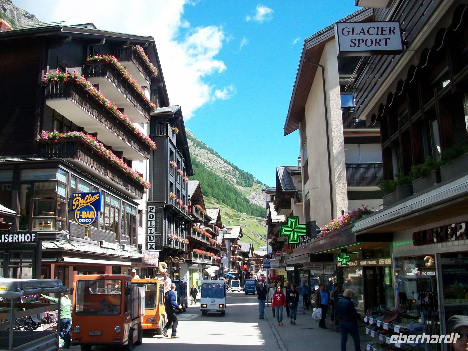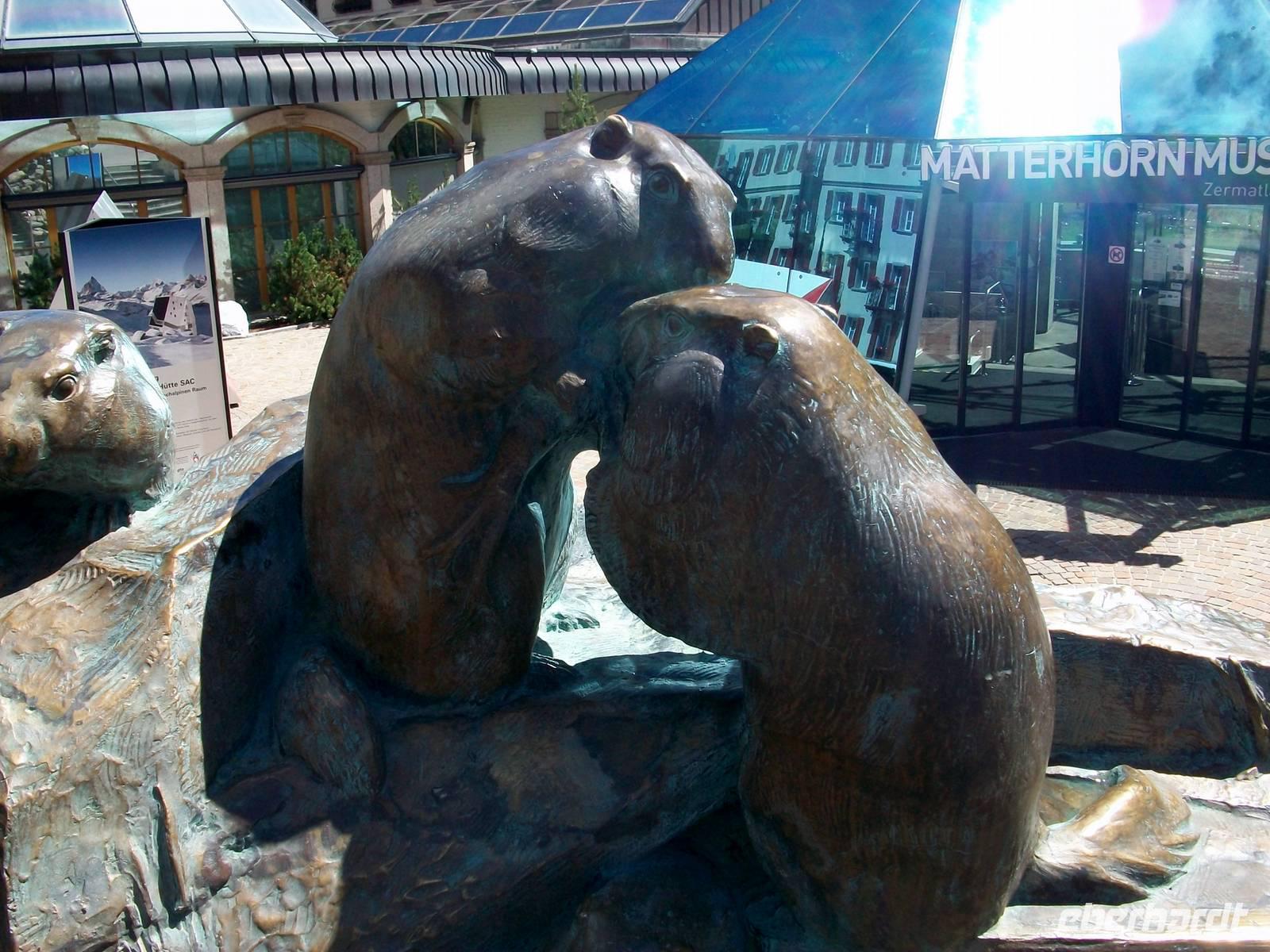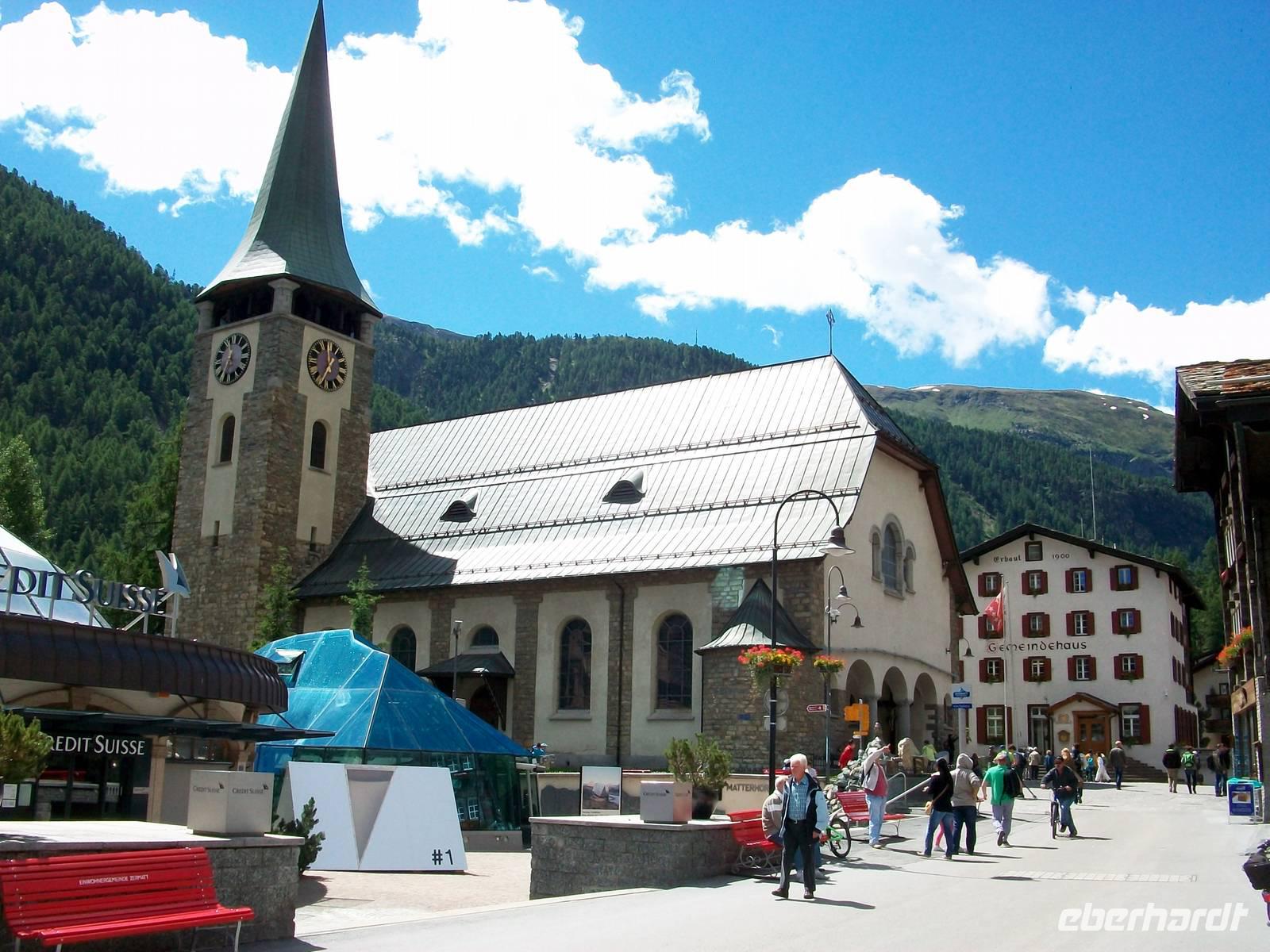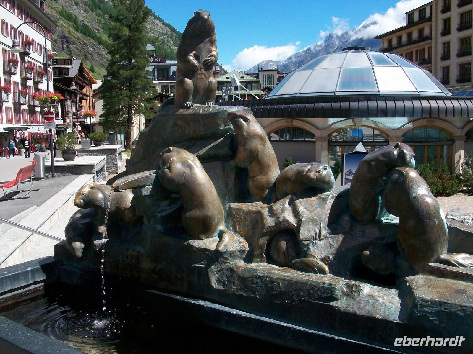 Unten im schönen Ort lohnt ein Bummel entlang der pittoresken Häuser und edlen Geschäfte. Etwas abseits gelangt man ins alte Zermatt um wenig später an der Kirche herauszukommen und über den possierlichen Murmeltierbrunnen zu staunen. Hinter der Kirche befindet sich der sehr gepflegte Friedhof; ein Besuch lohnt schon deshalb, weil es hier eine besondere Abteilung für verunglückte Bergsteiger und deren Führer gibt. Dem Eingeweihten ist so manch Name bekannt, besonders die bei der Erstbesteigung des Matterhorns umgekommen Menschen um Edward Whymper, das war 1865.