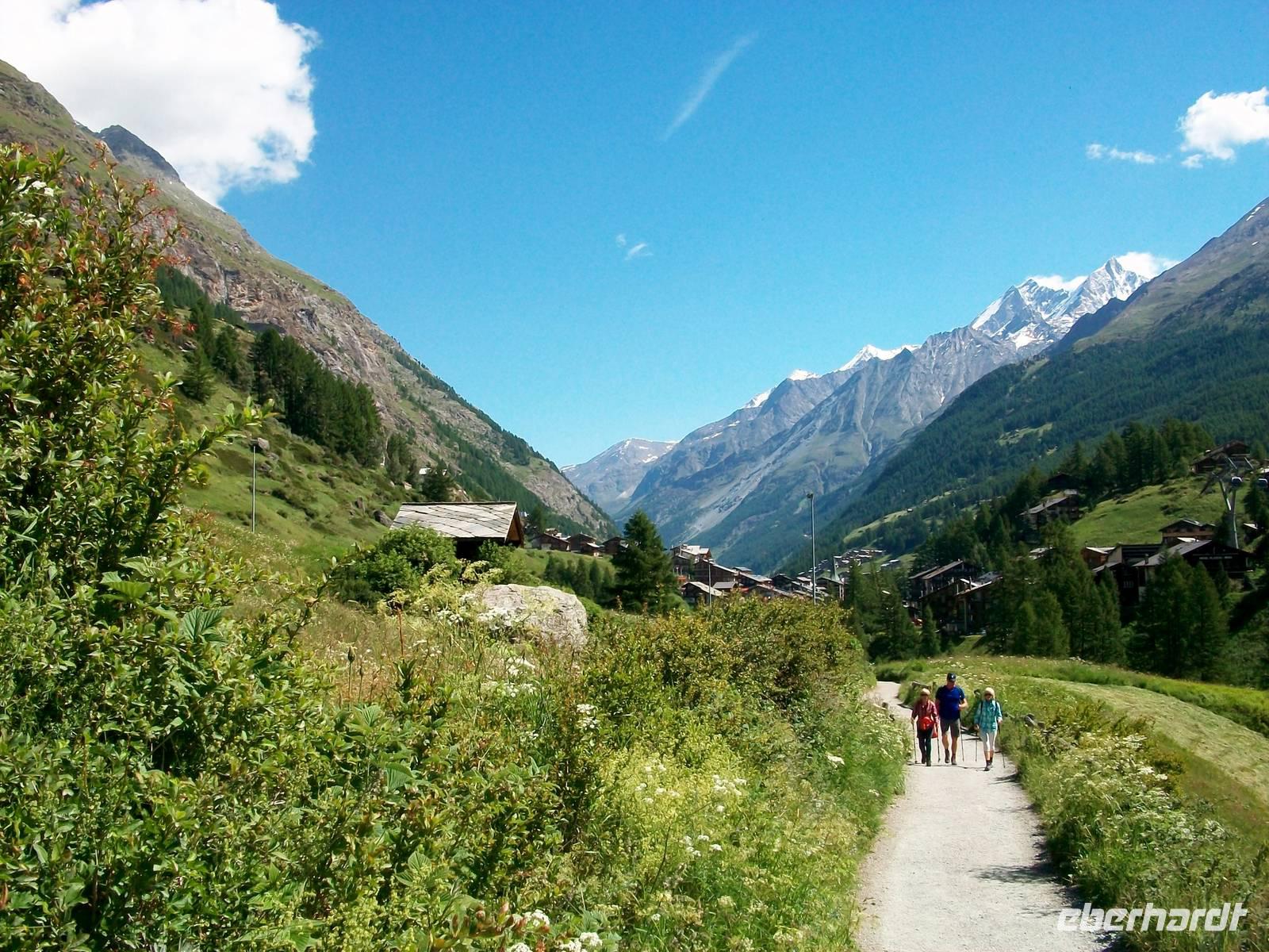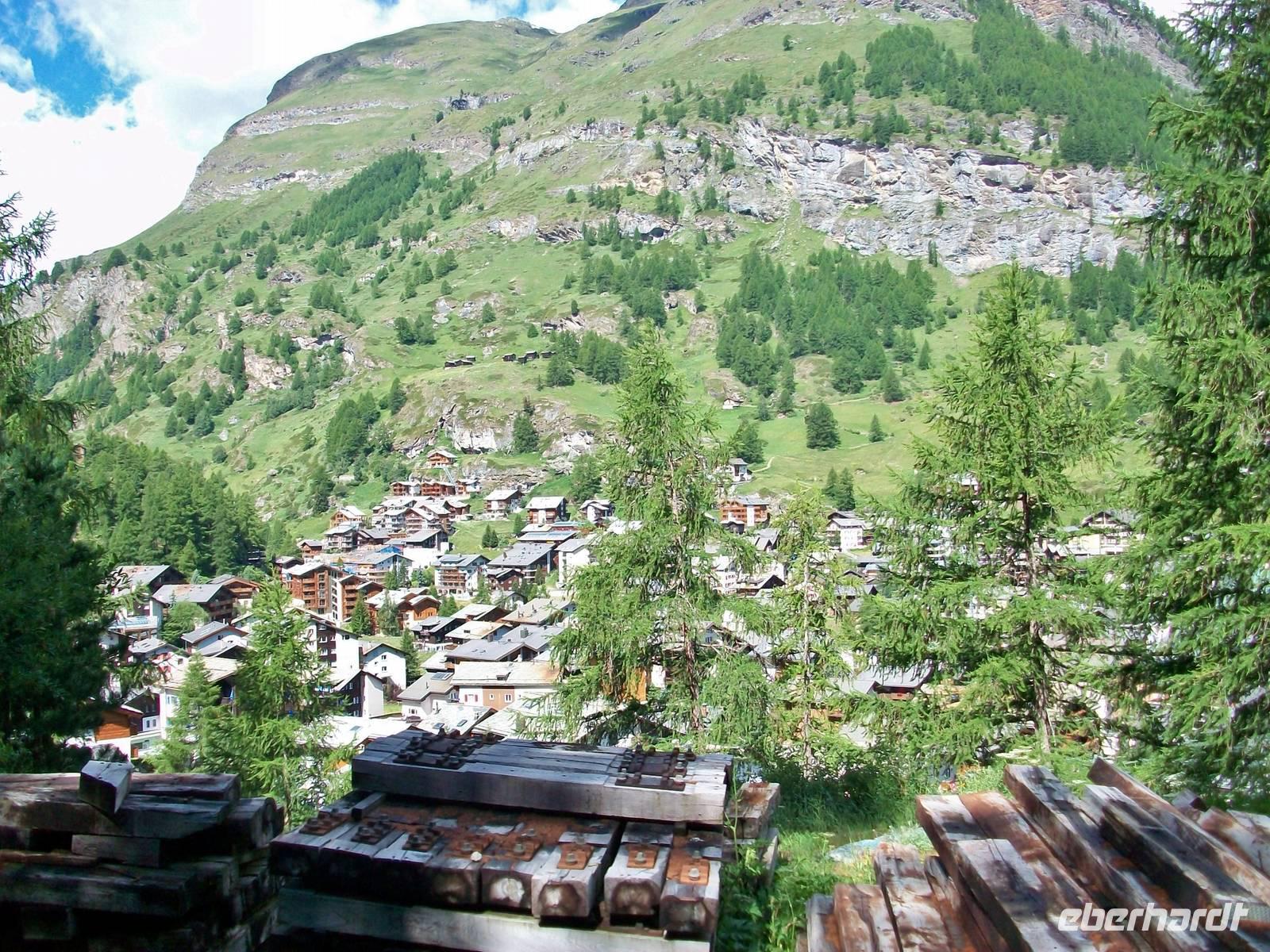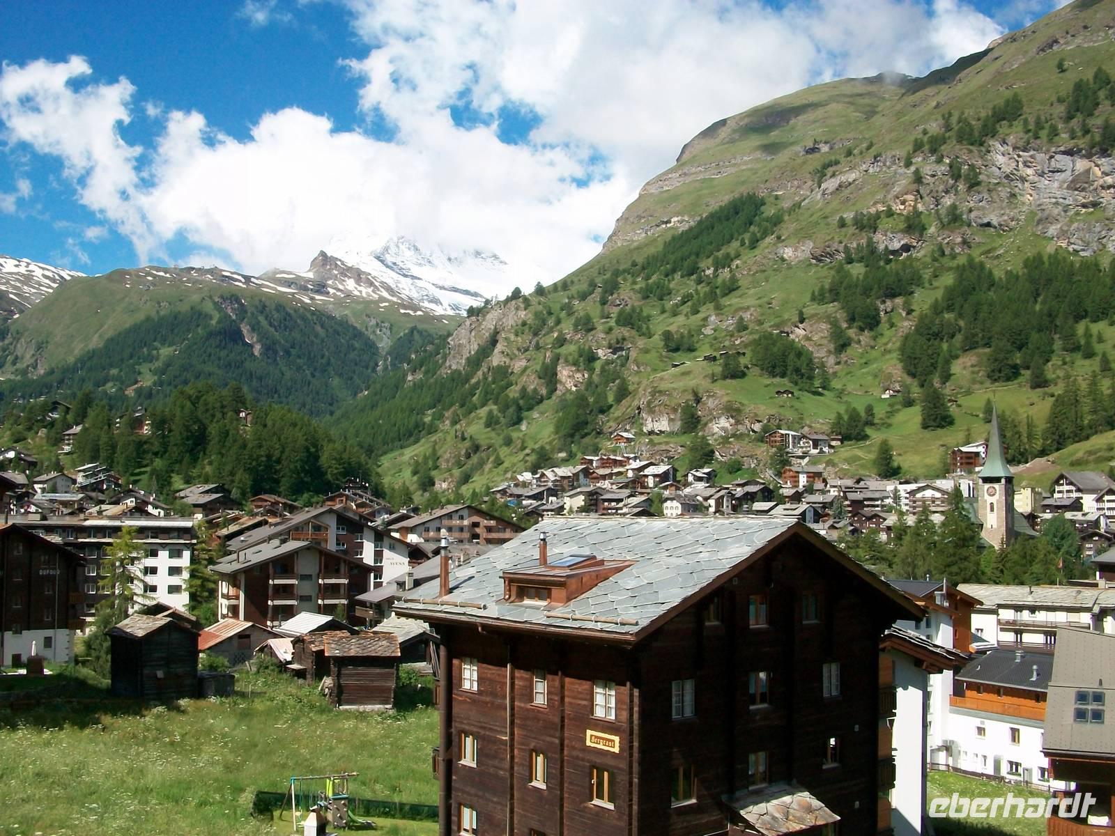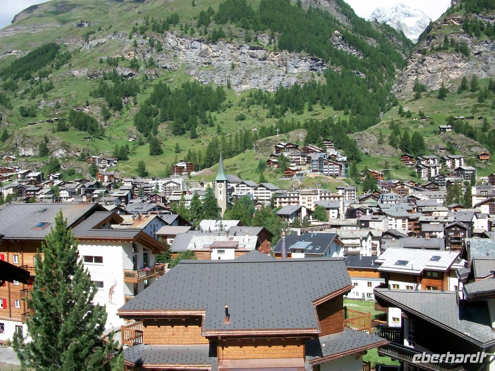 Unten im schönen Ort lohnt ein Bummel entlang der pittoresken Häuser und edlen Geschäfte. Etwas abseits gelangt man ins alte Zermatt um wenig später an der Kirche herauszukommen und über den possierlichen Murmeltierbrunnen zu staunen. Hinter der Kirche befindet sich der sehr gepflegte Friedhof; ein Besuch lohnt schon deshalb, weil es hier eine besondere Abteilung für verunglückte Bergsteiger und deren Führer gibt. Dem Eingeweihten ist so manch Name bekannt, besonders die bei der Erstbesteigung des Matterhorns umgekommen Menschen um Edward Whymper, das war 1865.