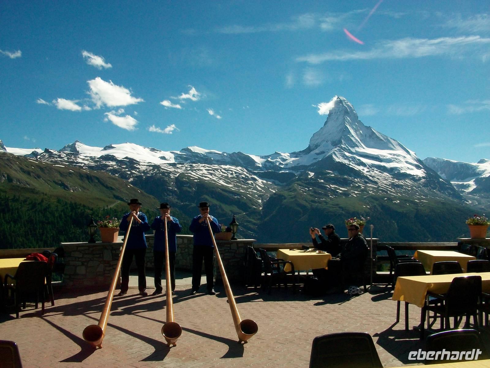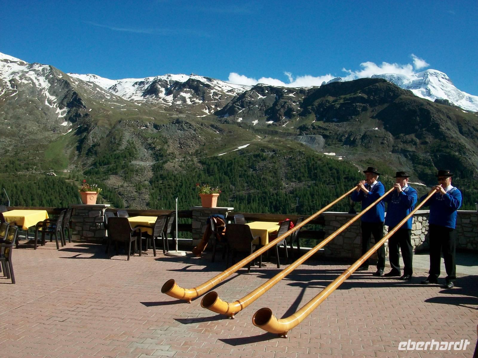 Ein Hupsignal, die Schranken vor den Türen schließen sich, und schon beginnt die rasante Fahrt schräg nach oben. Bald wird es wieder hell und wir sind oben angelangt. Was uns nun hier erwartet kann romantischer nicht sein. Auf der Terrasse stehen drei Alphornbläser und im Hintergrund liegen die schneebedeckten Berge die in der bläulichen Luft des Nachmittags in einem ganz besonderen Licht erstrahlen. Das ist nun ein ganz besonders schönes Gefühl; die grandiose Kulisse, die saubere Luft und die eigenartigen Klänge der Instrumente; wir halten den Atem an, schließen die Augen und lassen uns in unsere Phantasie adlergleich in weite Ferne tragen. Das ist Genuss pur und man mag sich gar nicht davon trennen.
