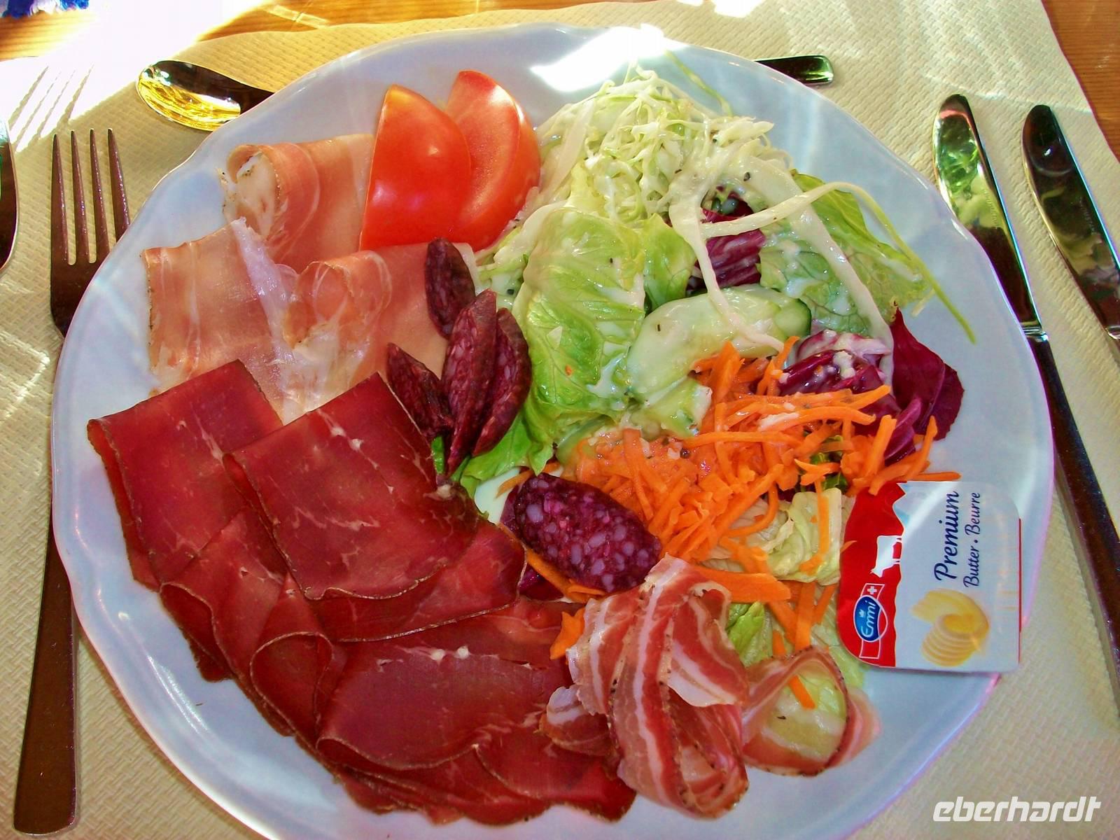 Nachdem wir die Fahrtrichtung gewechselt haben wird uns zum Mittag ein Älplerteller gereicht; diese würzige und schmackhafte Stärkung aus Salami und Käse mundet uns vorzüglich; unterdessen zieht an den Zugfenstern die schroffe Landschaft der Rheinschlucht vorbei- ein doppelter Genuss!