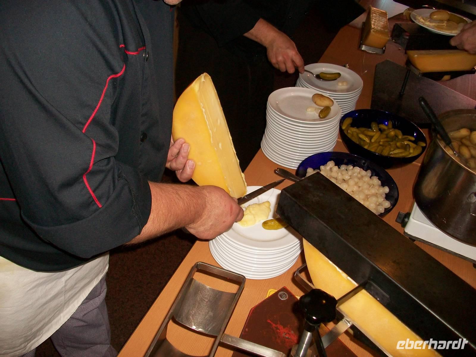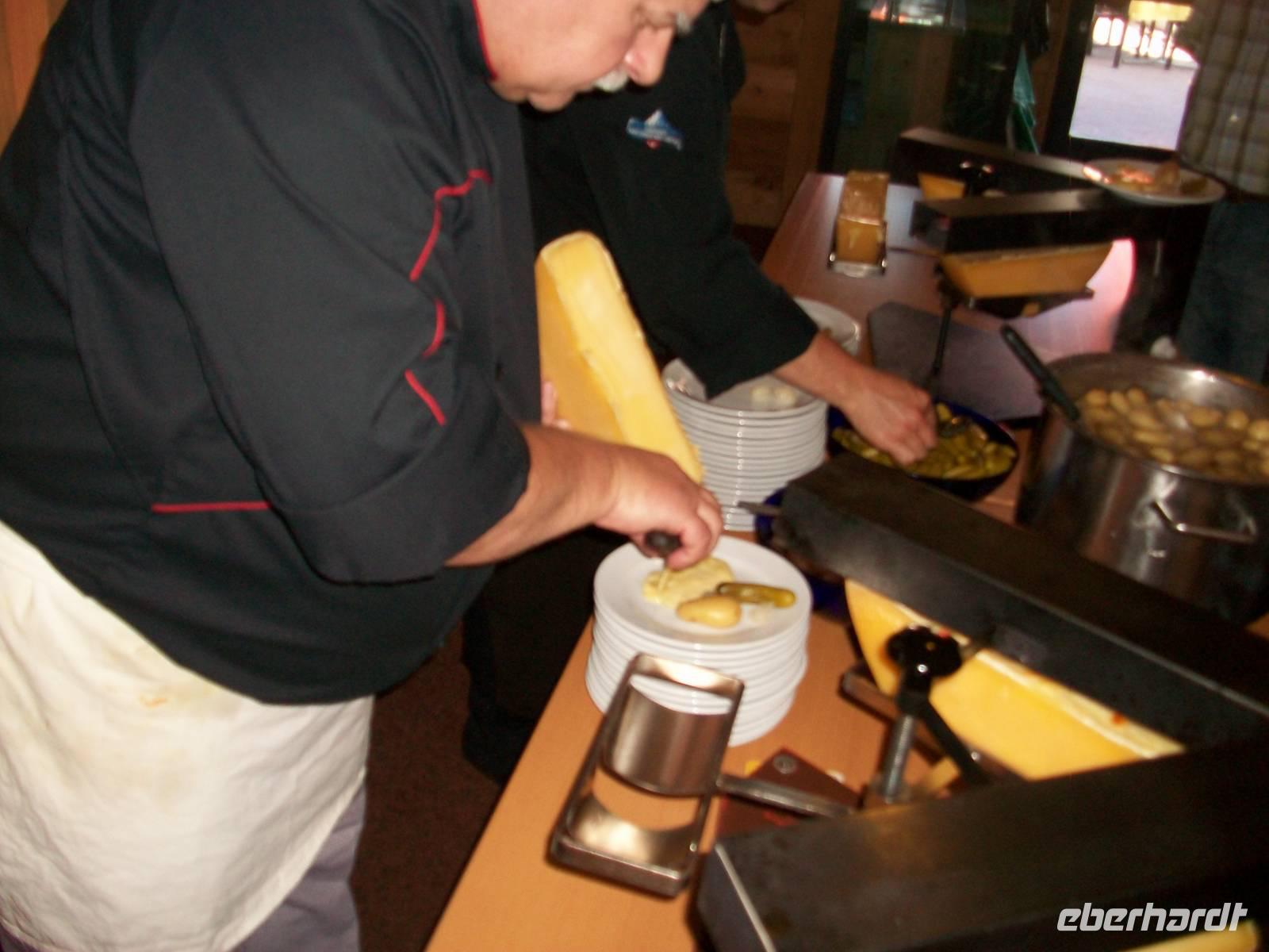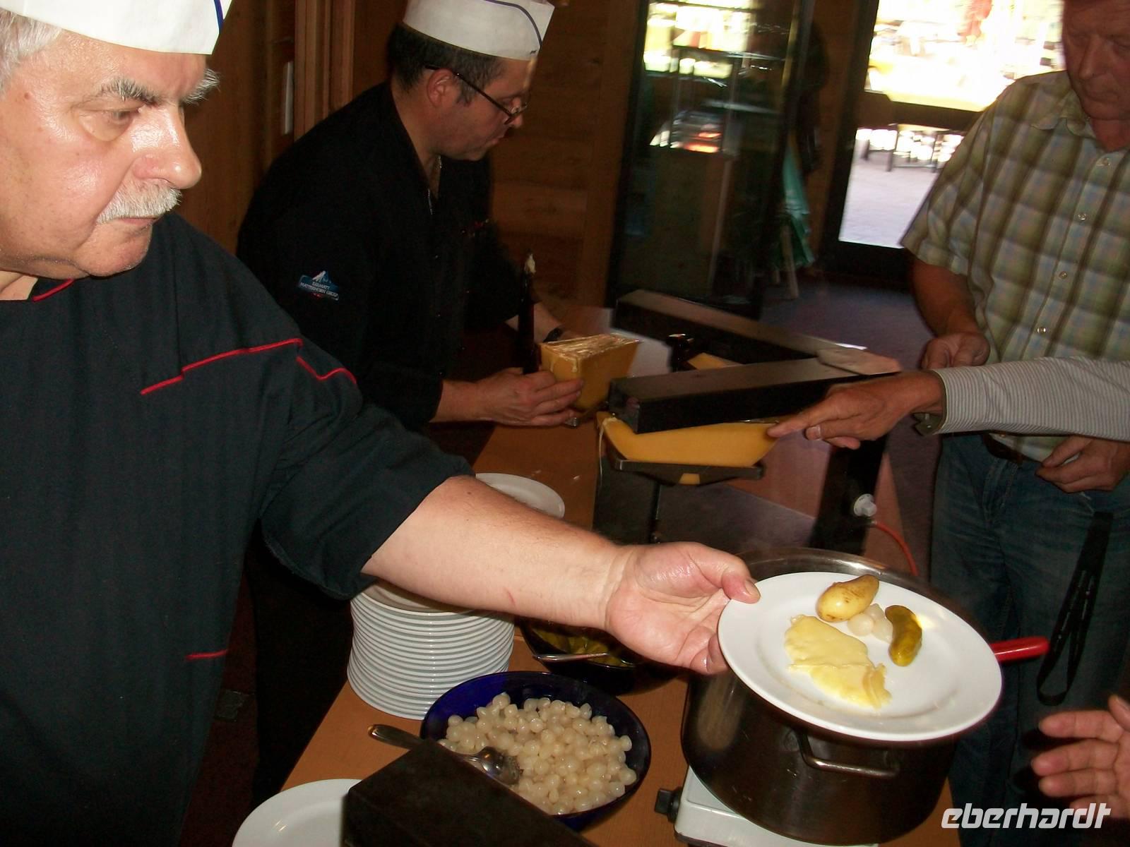 Im Restaurant ist schon das Essen vorbereitet; immer mit dem Blick auf die Berge und das von Wolken unverstellte Matterhorn, genießen wir einen Teller mit Walliser Spezialitäten. Doch das Hauptgericht kündigt sich schon mit einem würzigen Duft an. Auf einer speziellen Vorrichtung wird Käse geschmolzen, zusammen mit kleinen Kartoffeln und sauren Gurken wird uns diese leckere Speise serviert. Es ist die kräftige Nahrung der Schweizer Bergbauern und auch uns mundet das Raclette, so heißt diese Zubereitung, köstlich. Dabei werden wir von zwei Musikanten unterhalten die uns die uralten Weisen der Berge zu Gehör bringen. Den Abschluss macht noch ein leckerer Eisbecher mit Obst, man möchte sich gar nicht von hier oben trennen. Doch wie alle schönen Stunden vergeht dieser Abend auf der Sunnega viel zu schnell, als wir unten im Tal anlangen hat hier schon die Dämmerung Einzug gehalten, während die oberen Spitzen der Berge noch voll von der Sonne angestrahlt werden.