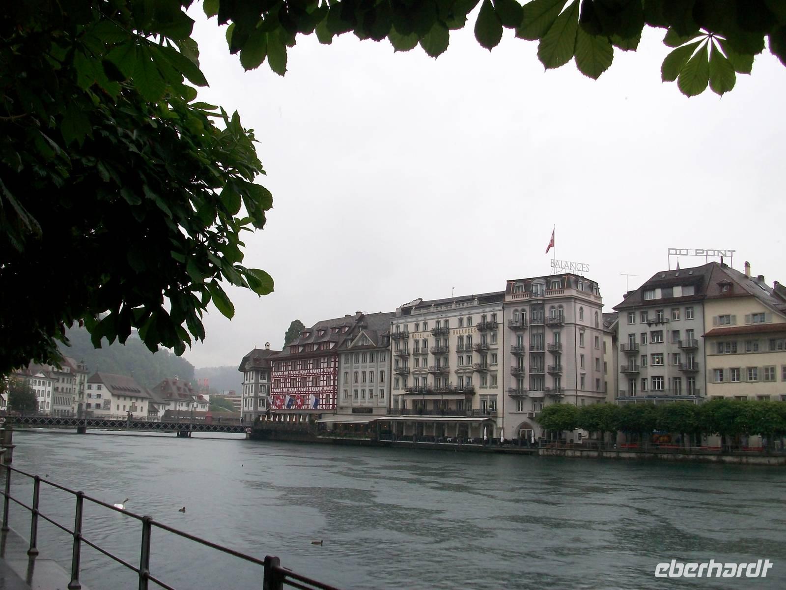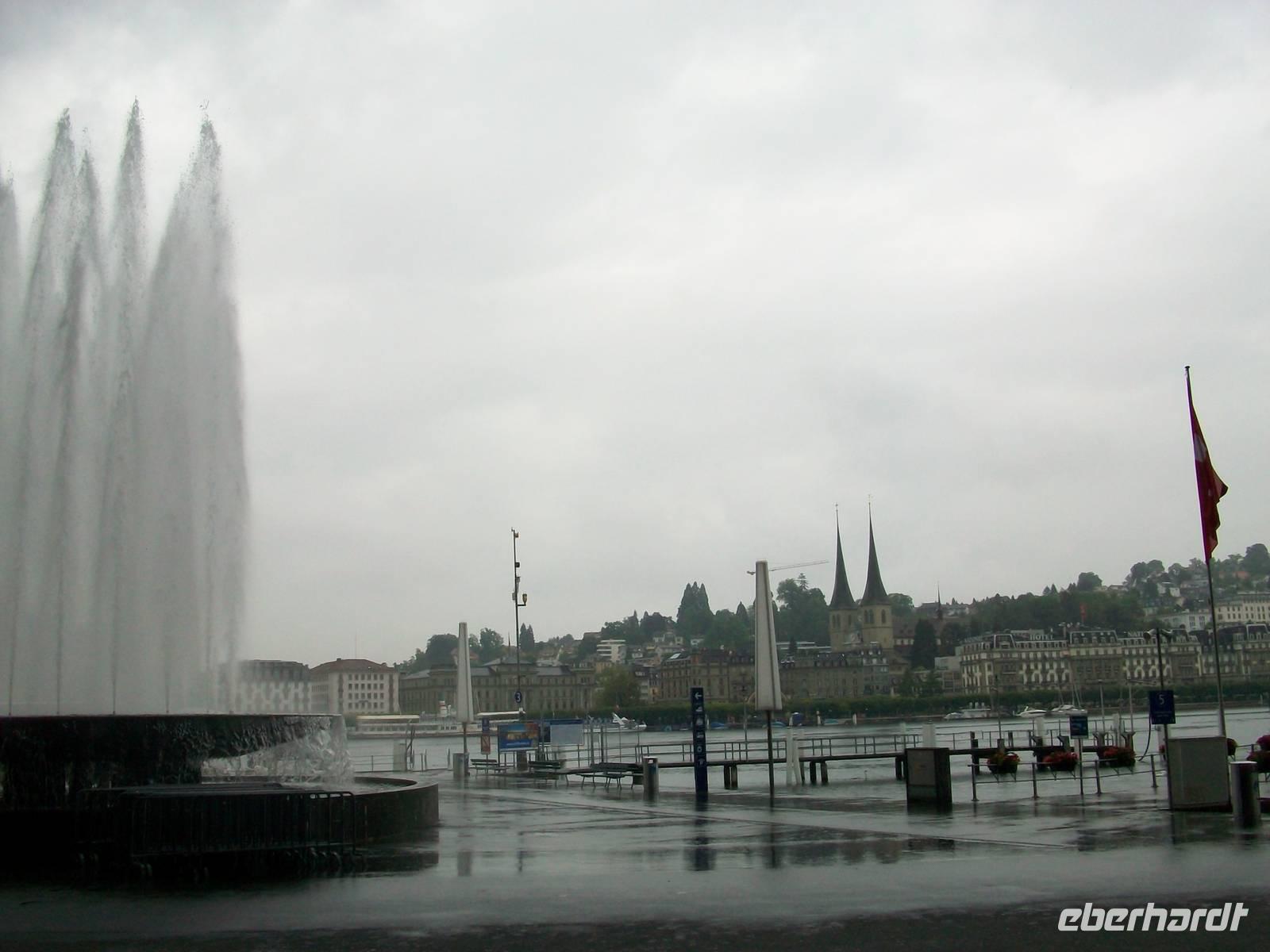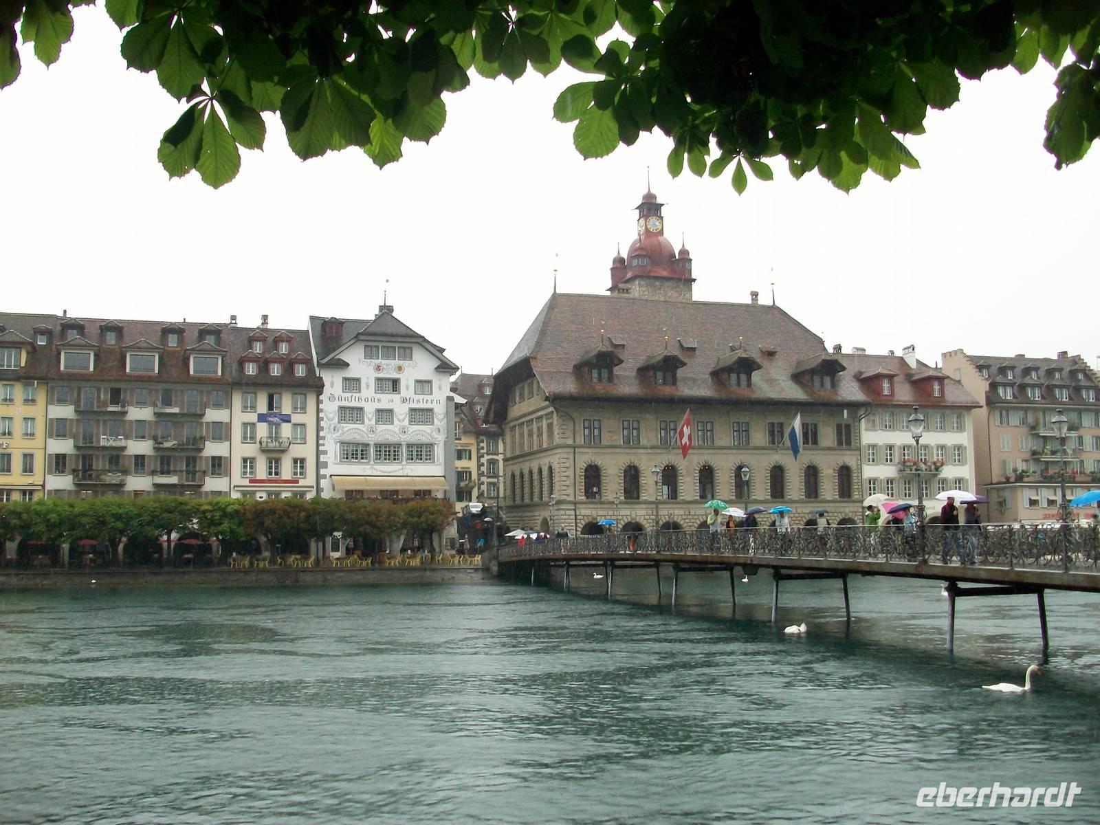 Dann geht es das Haslital abwärts. Auch hier, im oberen Teil, dominiert unwirtliches Land welches aber nicht ohne Reiz ist. Vorbei an den Stauseen gelangen wir wieder unter die Baumgrenze und sind fortan in grüner Vegetation unterwegs. Dem Fluss Aare folgen wir eine Weile um dann später über den Brünigpass in die Zentralschweiz zu gelangen. Leider hat Petrus nun auch endgültig die Schleusen des Himmels geöffnet; Regen tropft gegen den Bus als wir in Luzern anlangen. Dennoch, dieser Ort ist so reizvoll, auch bei diesem Wetter kann man an ihm nicht vorbei fahren!