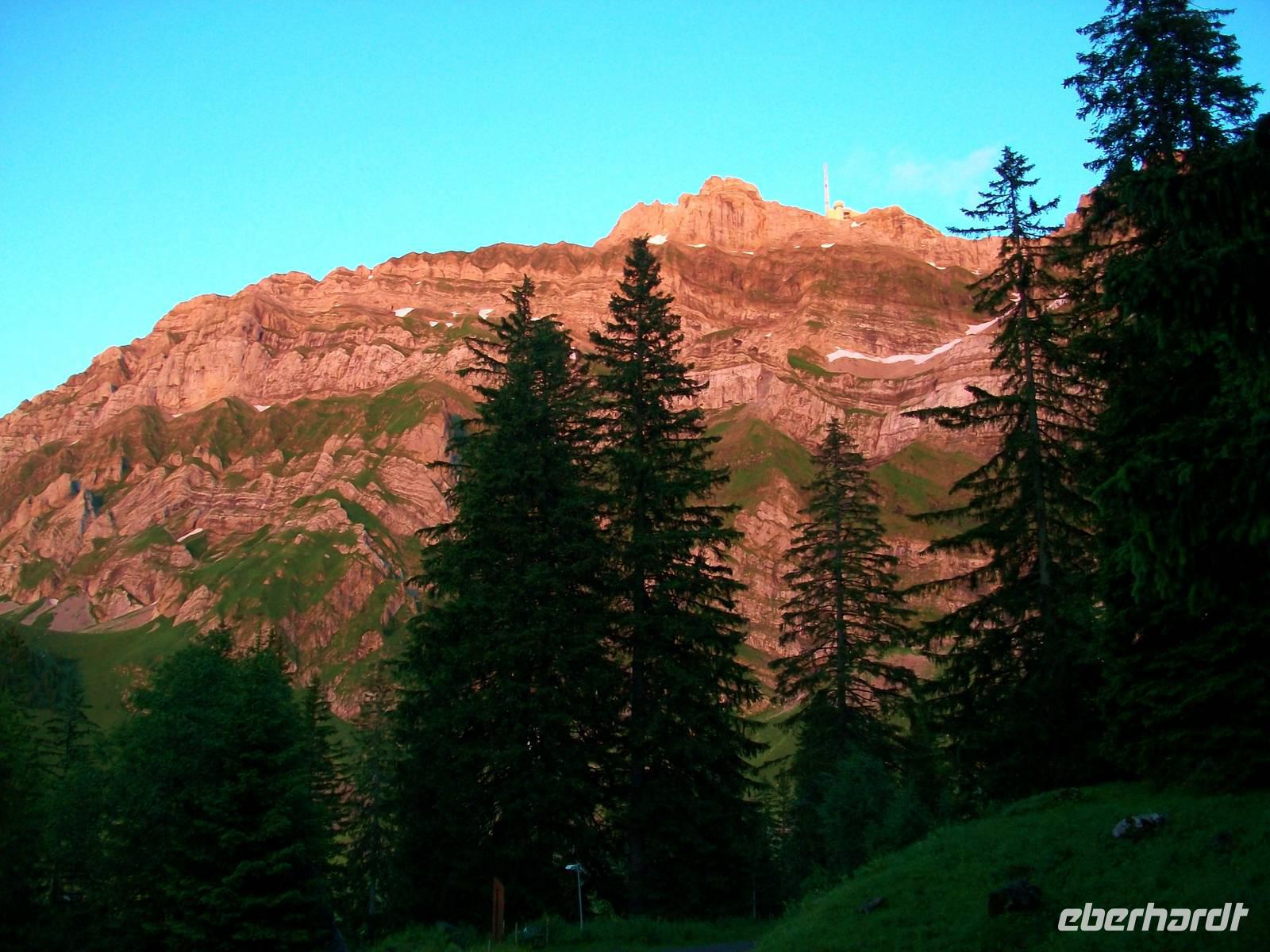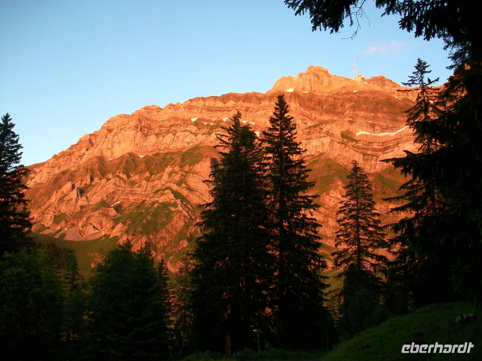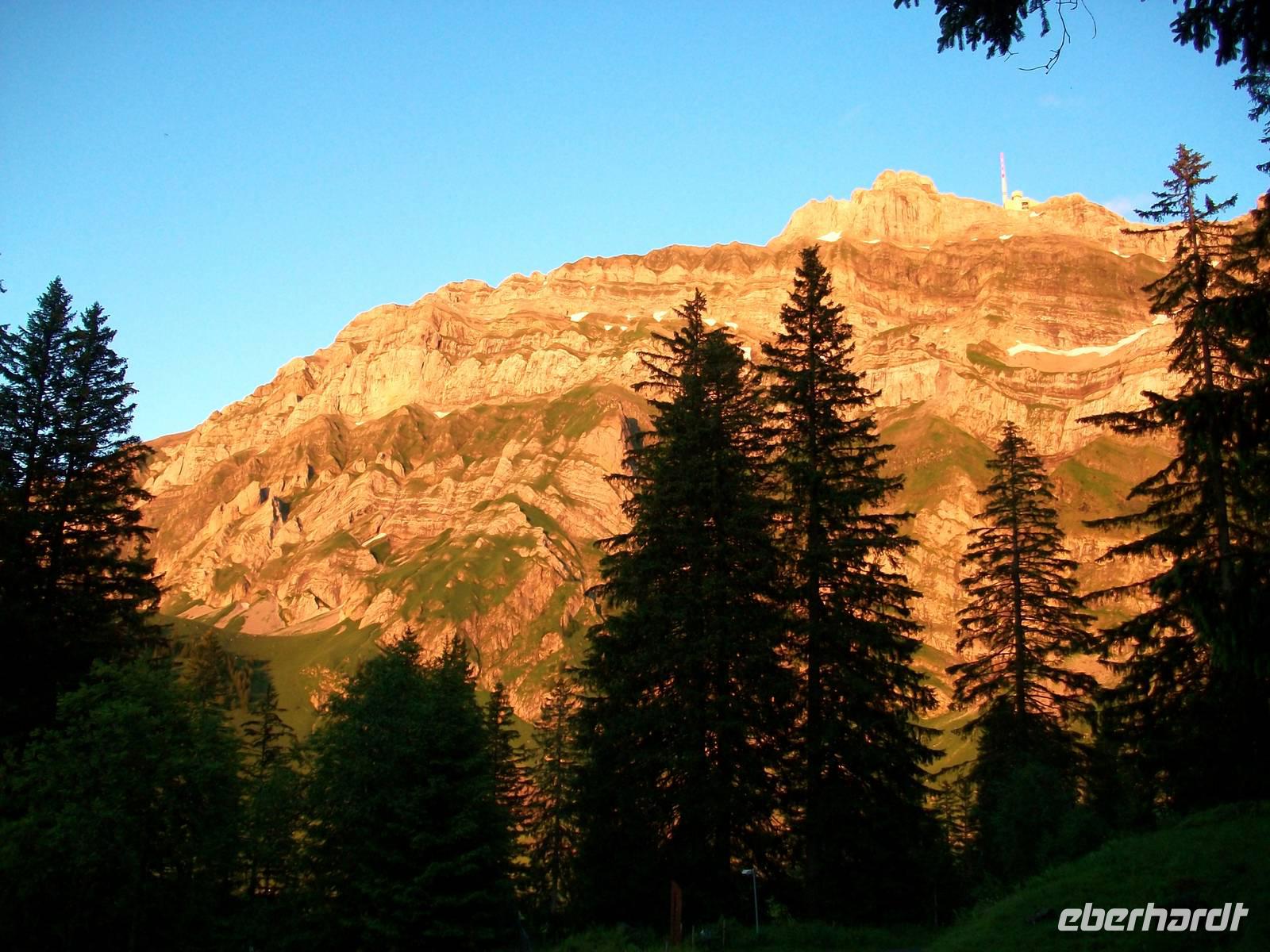 Doch dann müssen wir die Fahrt wieder aufnehmen; über den schönen Ort Hirzel gelangen wir zu einem weiteren See, es ist der Zürichsee. Dann führt uns der Weg hinauf ins Toggenburg; als der Blick frei wird, sehen wir wie es von Westen heller wird; das Tief zieht ab. Allerdings empfängt uns die Schwägalp, unser heutiges Ziel, erst einmal mit kühlem Wind und Regen. Doch nachdem wir uns das Abendessen haben schmecken lassen sind die Wolken verschwunden und die tiefliegende Abendsonne bescheint die Säntiswand und lässt die Berge bei ihrem Untergehen in einem magischen Licht erstrahlen.