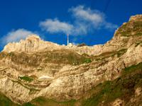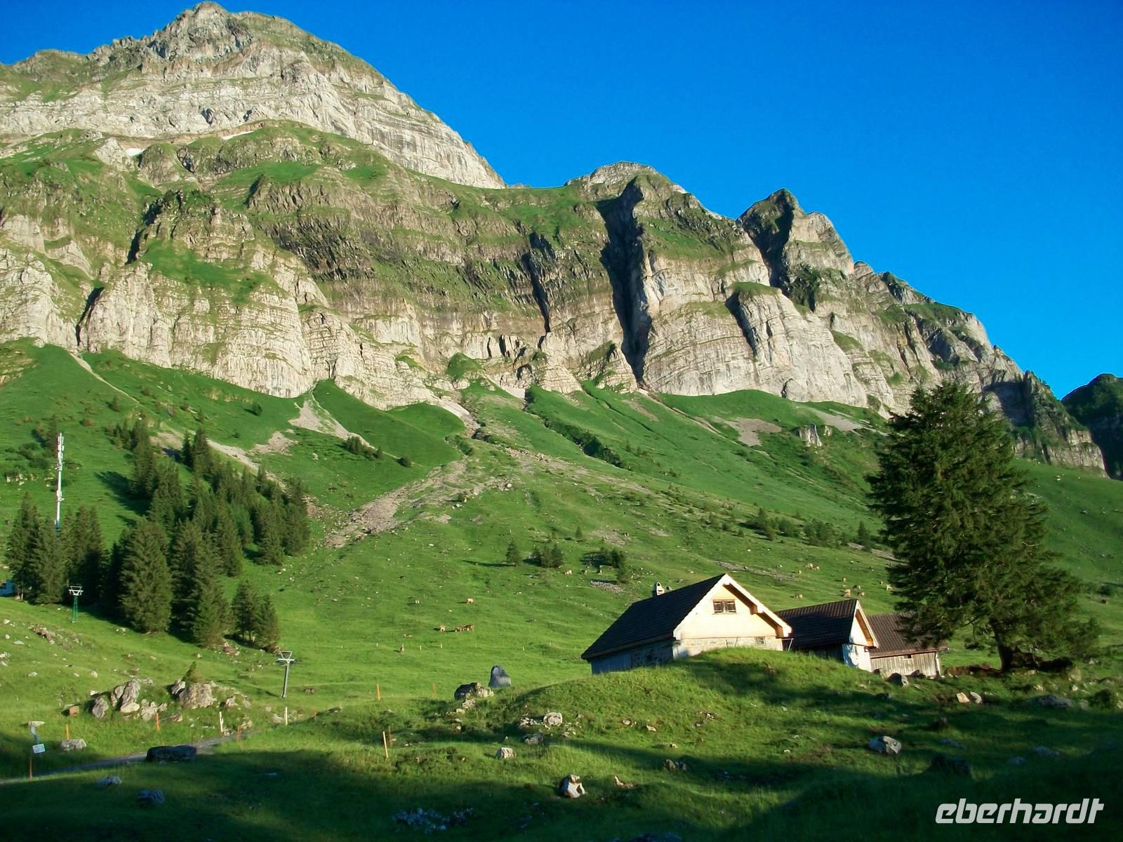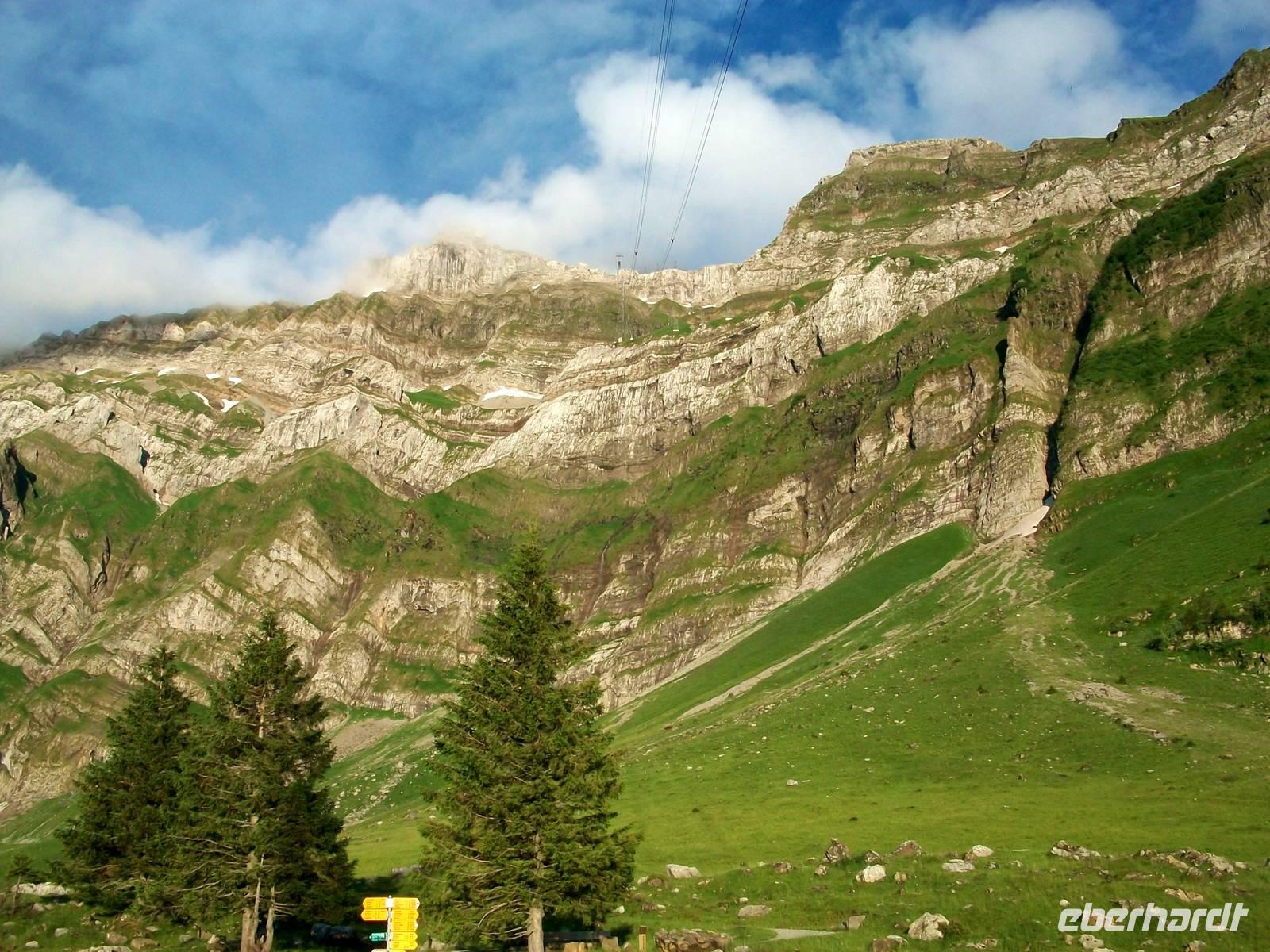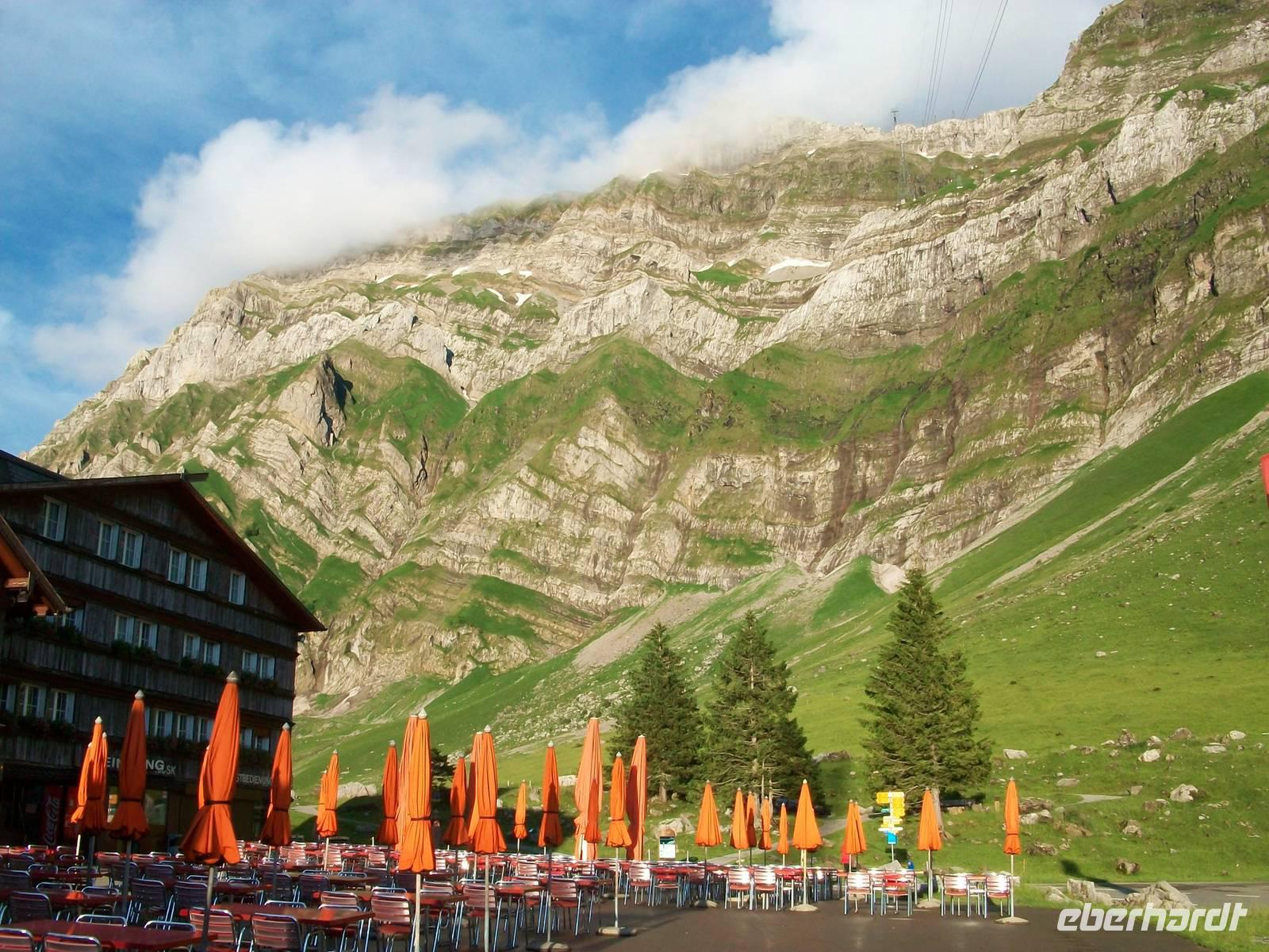 Doch dann müssen wir die Fahrt wieder aufnehmen; über den schönen Ort Hirzel gelangen wir zu einem weiteren See, es ist der Zürichsee. Dann führt uns der Weg hinauf ins Toggenburg; als der Blick frei wird, sehen wir wie es von Westen heller wird; das Tief zieht ab. Allerdings empfängt uns die Schwägalp, unser heutiges Ziel, erst einmal mit kühlem Wind und Regen. Doch nachdem wir uns das Abendessen haben schmecken lassen sind die Wolken verschwunden und die tiefliegende Abendsonne bescheint die Säntiswand und lässt die Berge bei ihrem Untergehen in einem magischen Licht erstrahlen.