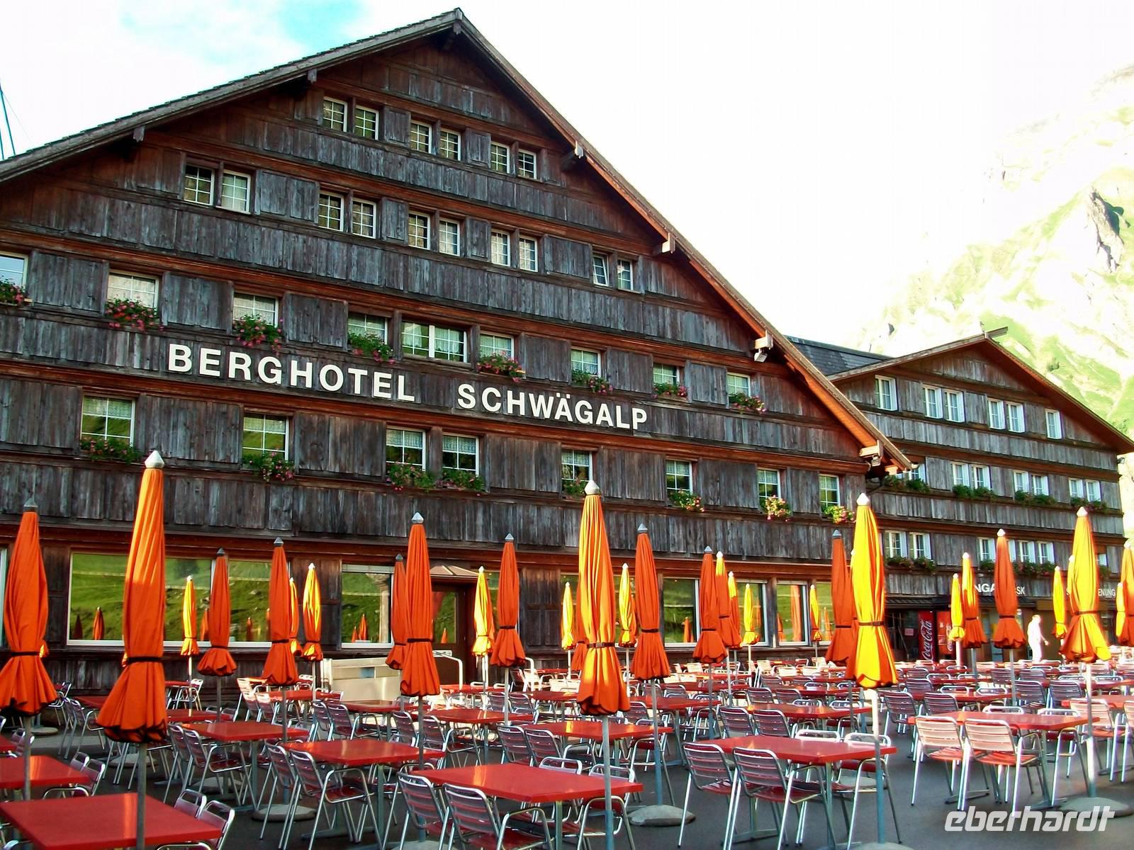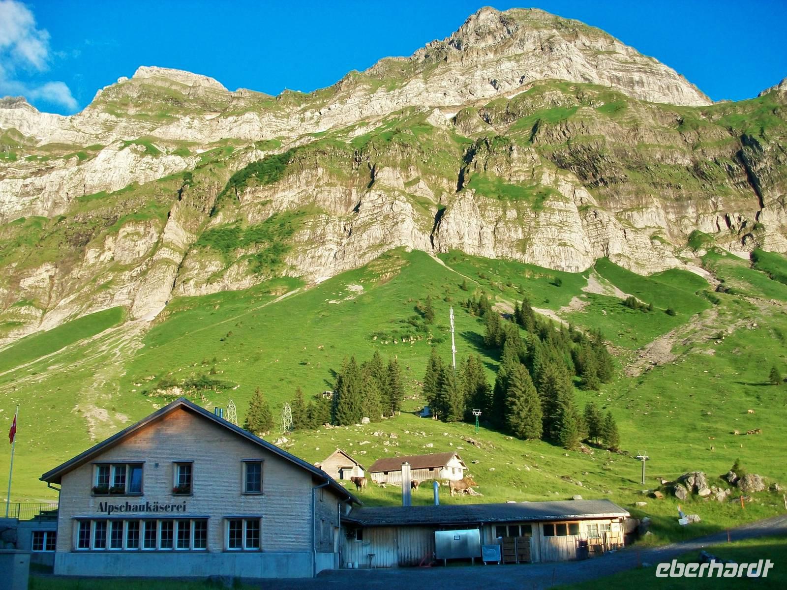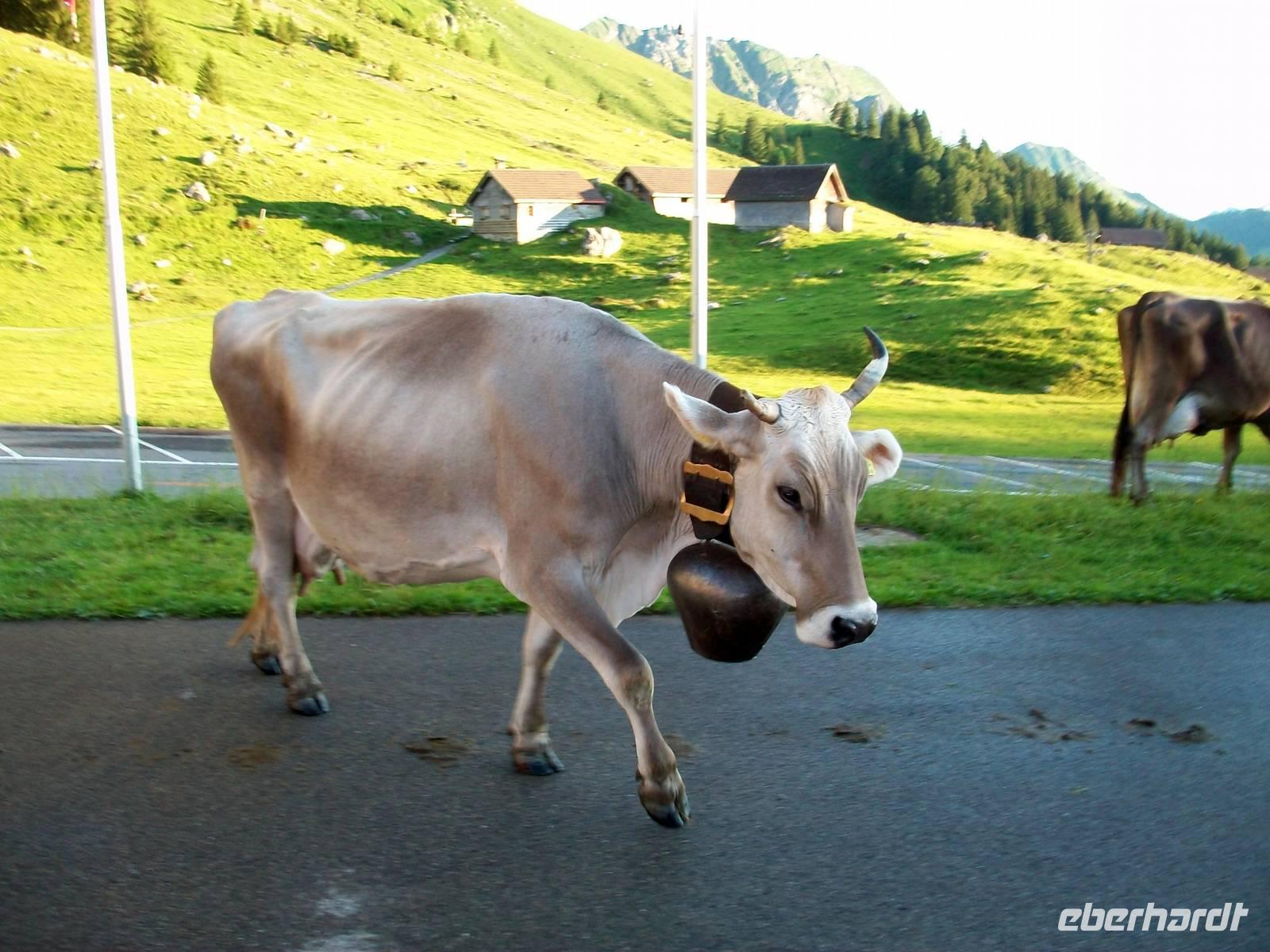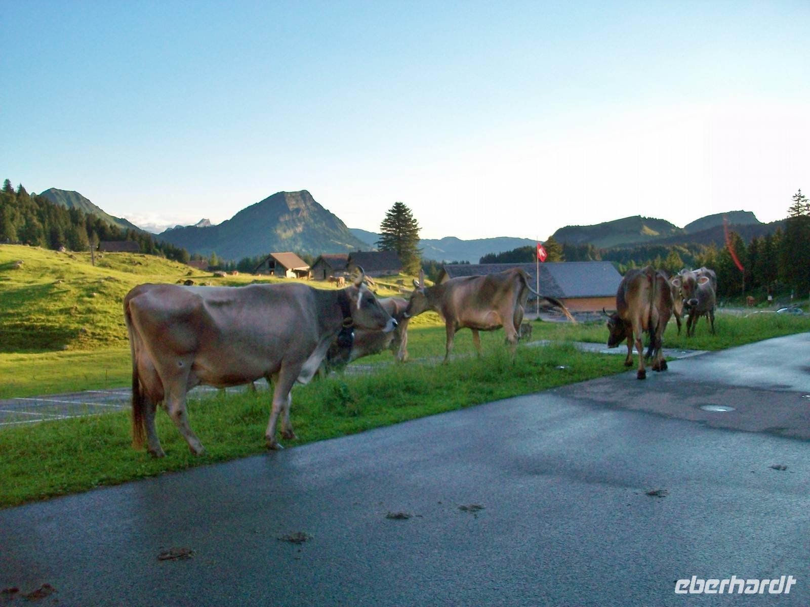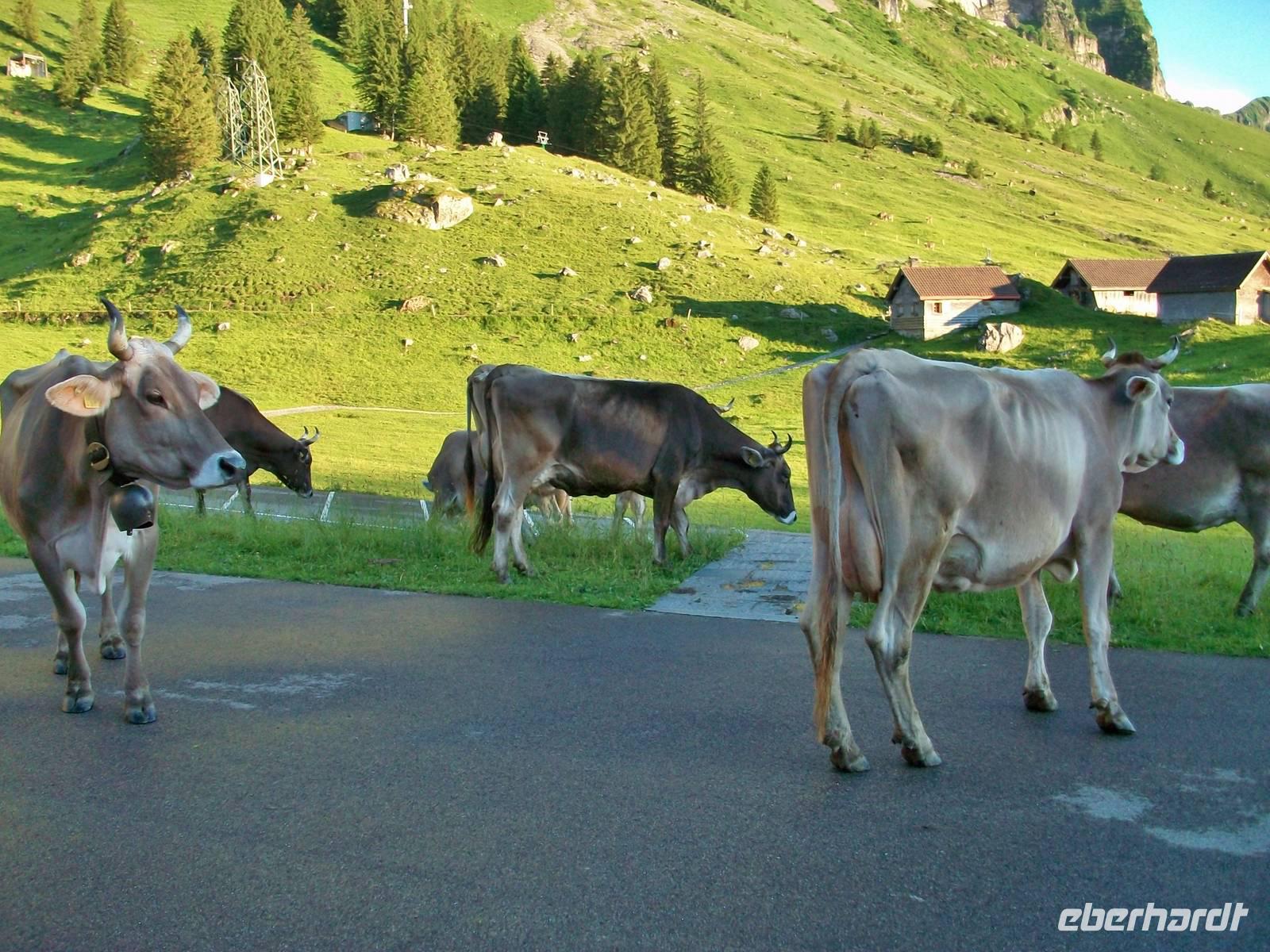 3.7.2014. Der strahlende Schein der hinter den Bergen aufgehenden Sonne dringt durch das Fenster. Schnell wird es auf der Schwägalp hell, das Licht bescheint auch die hintersten Winkel- ein schöner Tag beginnt. Von überall ist das Gebimmel der Kuhglocken zu vernehmen, eben kommt eine kleine Herde auf der Straße vorbei und es gibt ein schönes Fotomotiv. Hier leben die Menschen noch im Einklang mit der Natur, man möchte an solch einem schönen Ort länger verweilen aber leider ist nun heute schon die Heimreise angesagt. Zunächst gibt es aber noch einen großen Höhepunkt, der letzte auf unserer Reise.