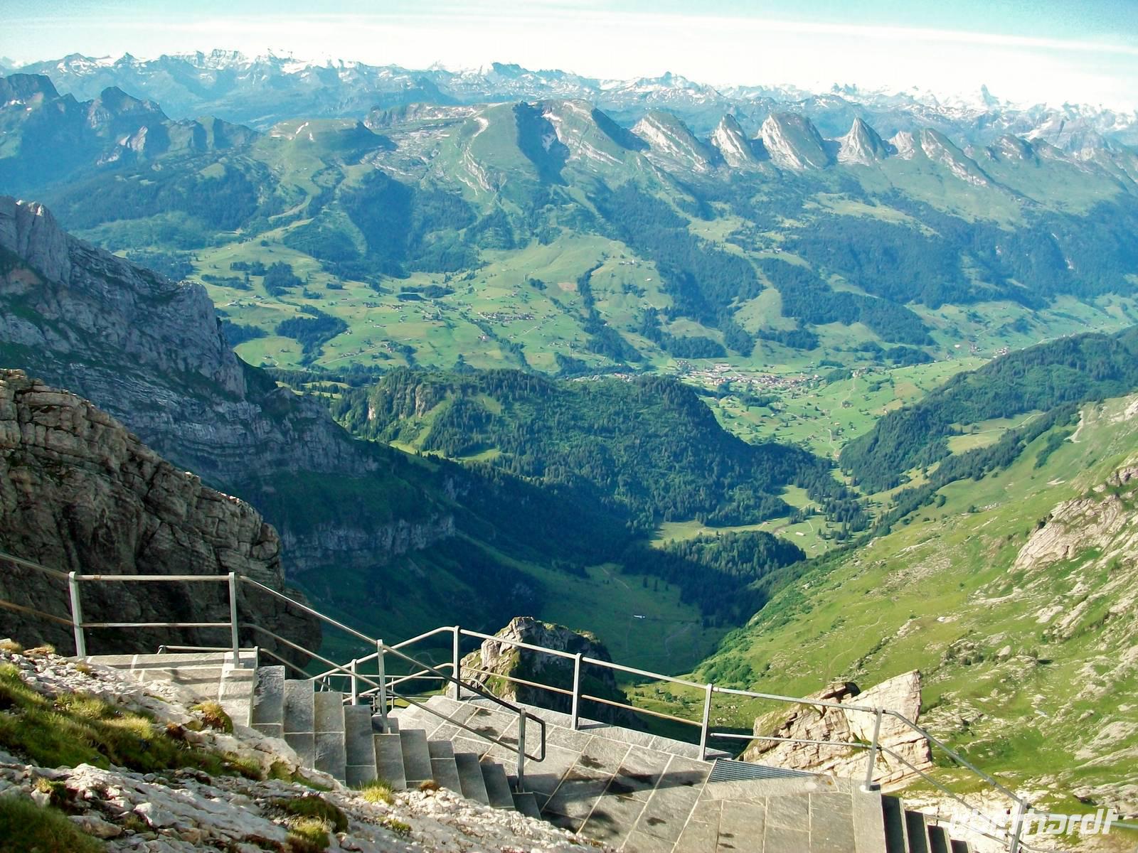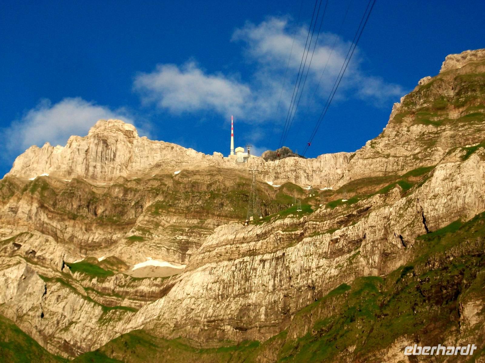 Eine erwartungsvolle Reisegesellschaft hat sich an der Talstation der Säntis- Schwebebahn eingefunden. Bald gelangen wir in die große Kabine und die Auffahrt beginnt. Schnell werden die Häuser der Schwägalp kleiner, die Bahn bringt uns leise summend hinauf und der Säntiswand immer näher. Bald wird auch der grandiose Blick über die Berge frei und als wir dann oben anlangen, genehmigen wir uns im Panoramarestaurant ein leckeres Frühstück vom reichhaltigen Buffet.