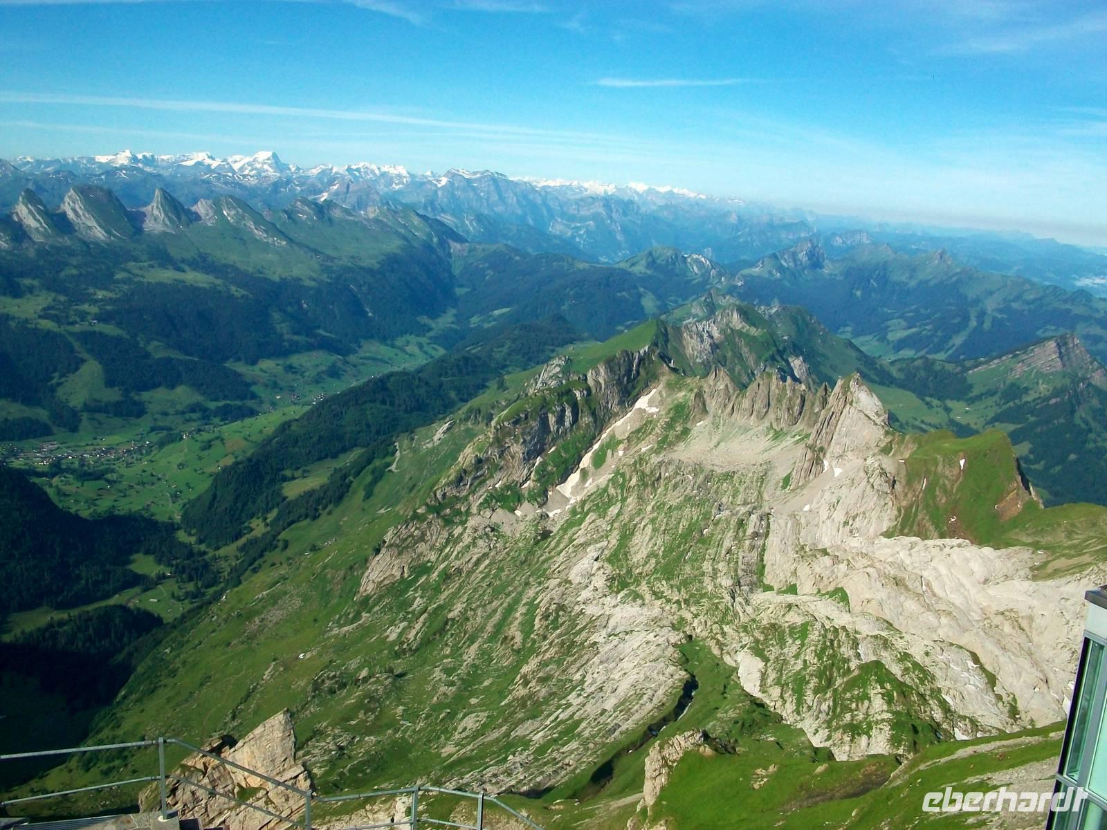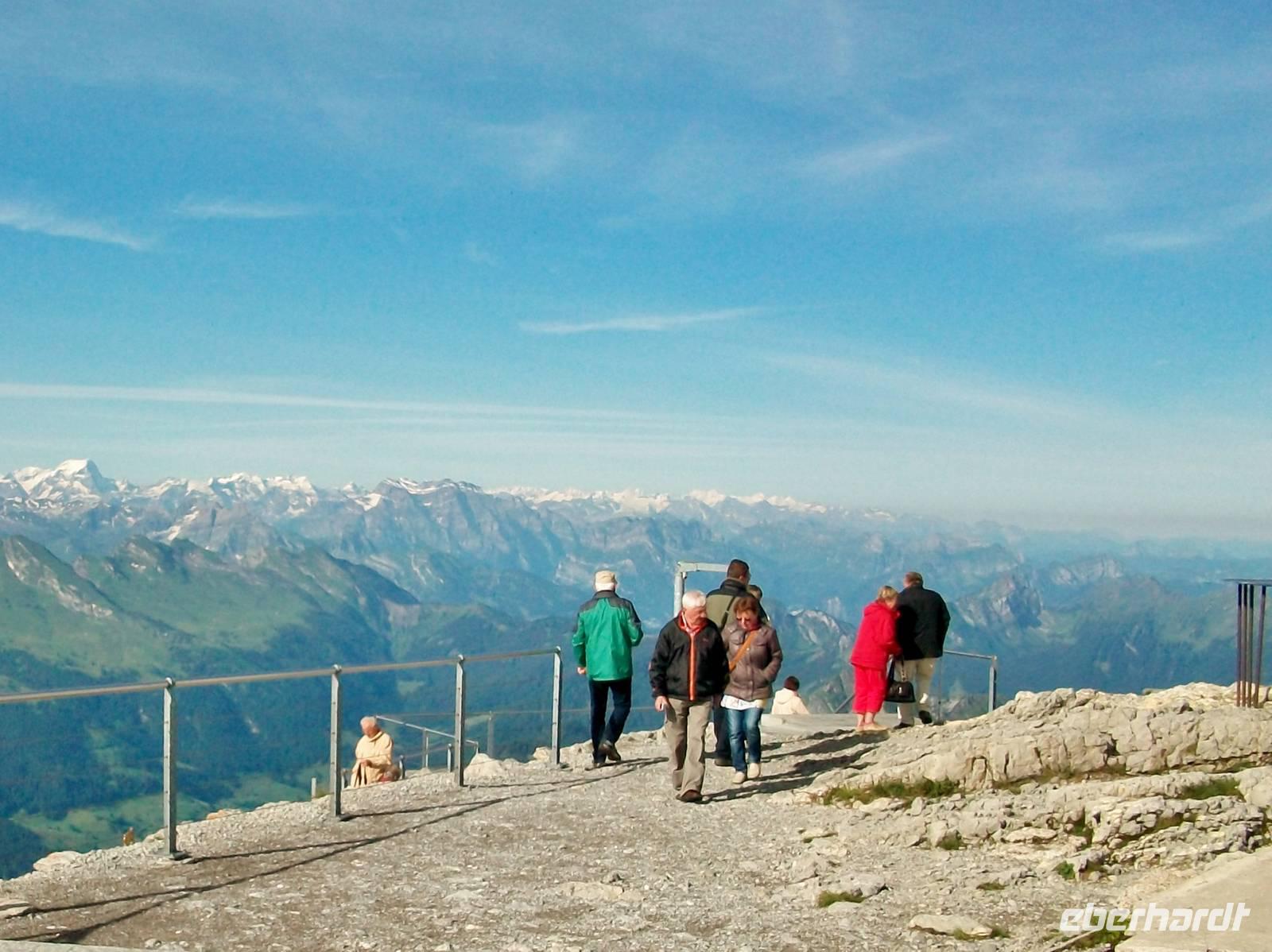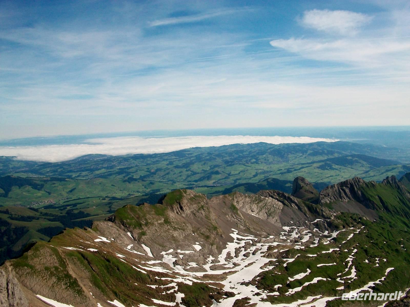 Im Hintergrund ist das Dreigestirn von Eiger Mönch und Jungfrau zu sehen, etwas weiter der Pilatus. In Richtung Bodensee haben sich Wolken im Tal festgehangen die wie ein gigantischer Teppich über dem schönen Land liegen. Hinter uns ragen die schrägen Spitzen der Churfirsten auf, dahinter ist der Walensee zu erahnen.