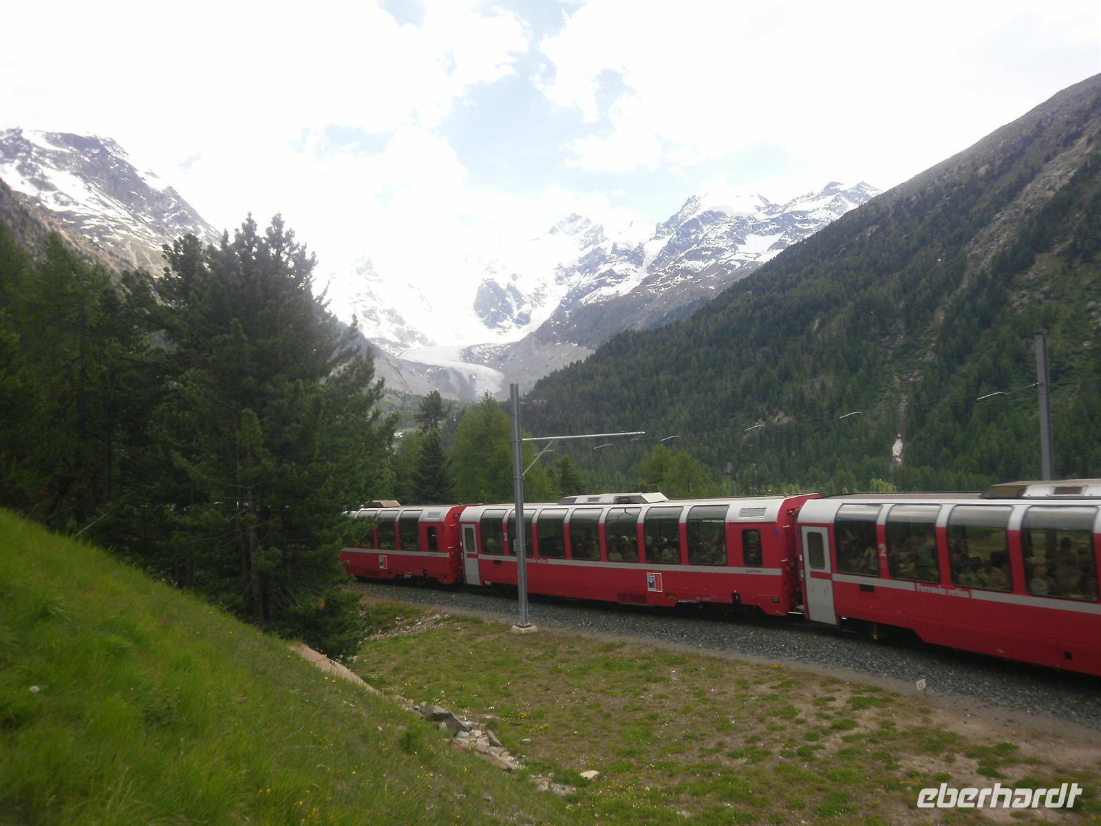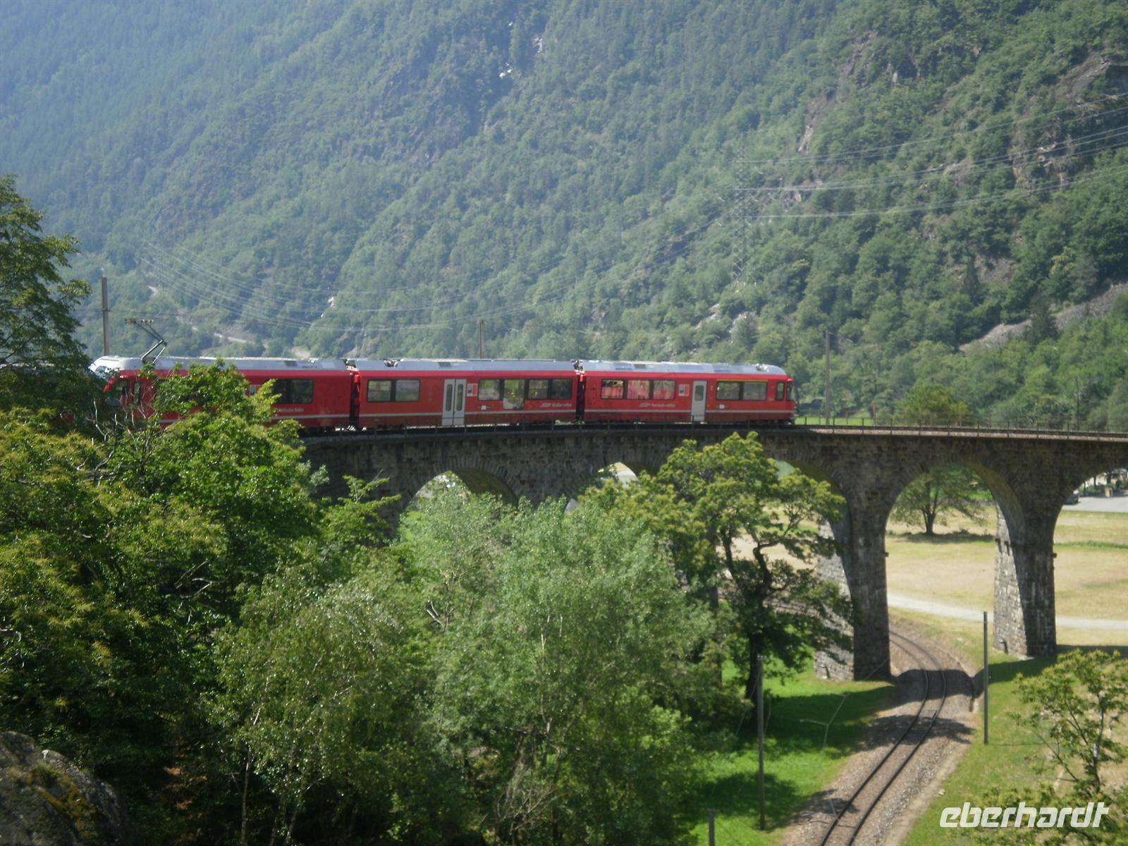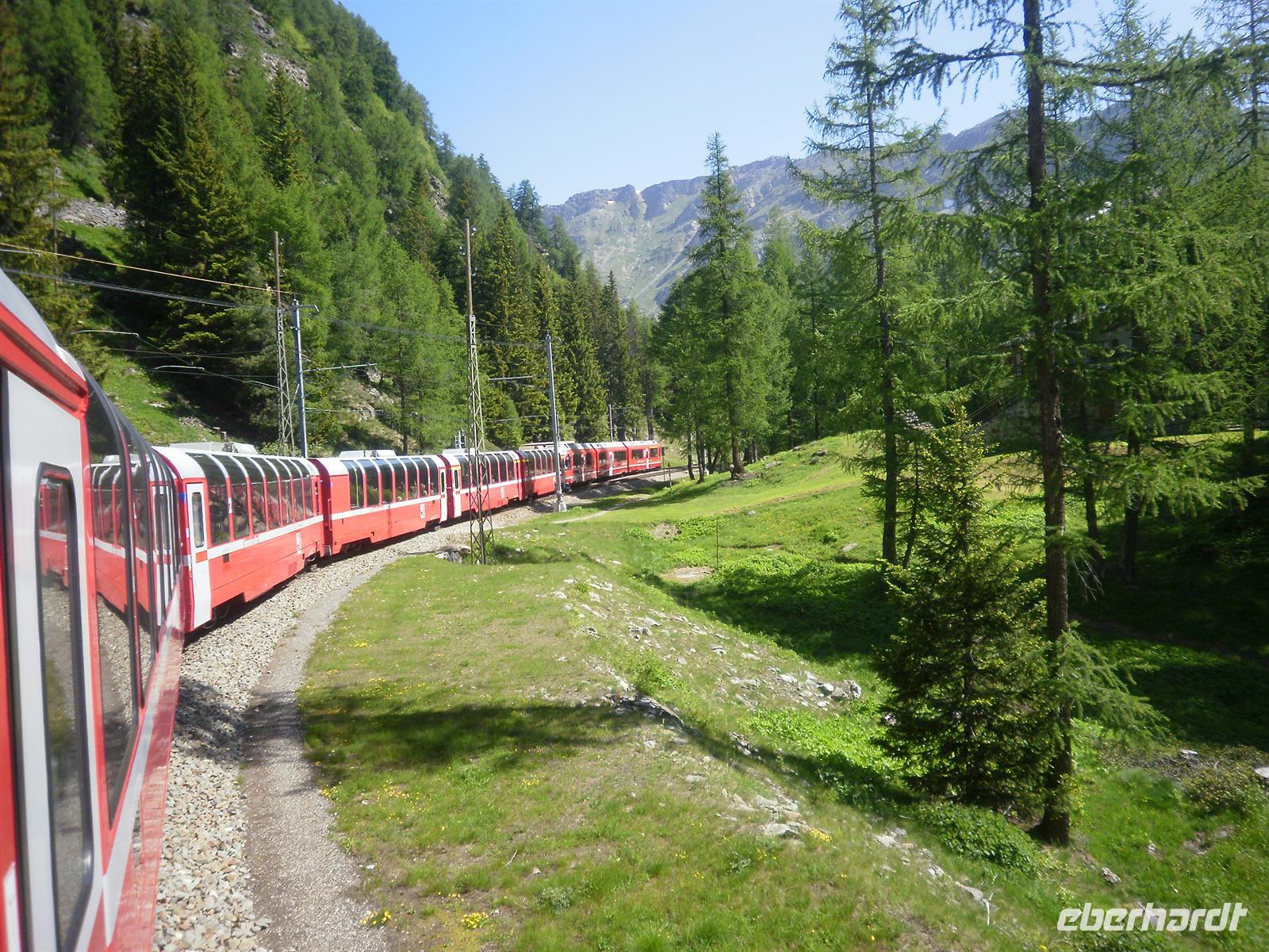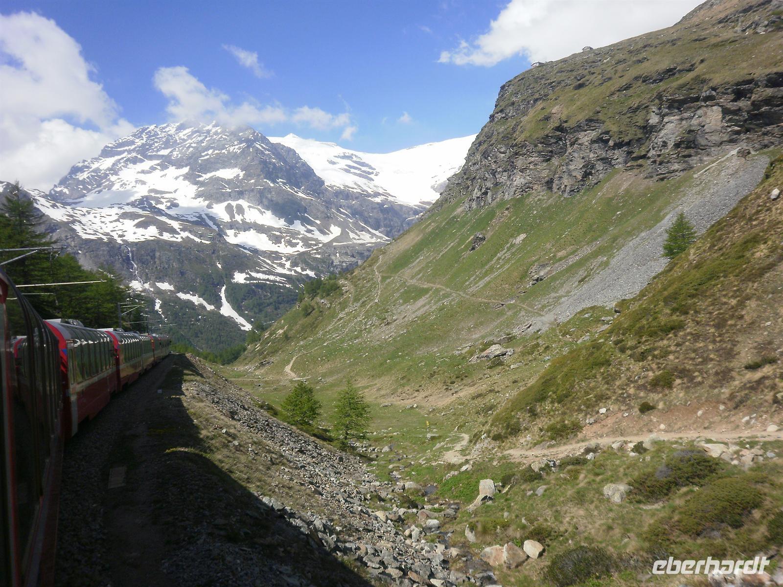 Die Bernina-Linie ist die einzige Schweizerbahn, die offen über die Alpen führt. Sie wurde 1910 fertig gestellt und brachte uns von den Gletschern des Berninapasses auf 2.253 m ü. d. M. hinunter auf 429 m ü. d. M. nach Tirano. Während der Höhenunterschied zwischen Ospizio Bernina und Tirano 1.824 Meter beträgt, misst die Horizontaldistanz nur 22 Kilometer. Diese Höhendifferenz wird ohne Zahnrad-Strecken überwunden - trotz Steigungen von bis zu 70o/oo. Das ist das absolute Maximum, das eine Adhäsionsbahn noch nutzbringend bewältigen kann. Besonders raffiniert ist übrigens auch die Wahl der Linienführung. Sie ermöglicht nicht nur die Überwindung der immensen Höhenunterschiede, sie eröffnet dem Reisenden auch atemberaubende Ausblicke auf eine imposante Bergwelt, auf Gletscher und Täler.