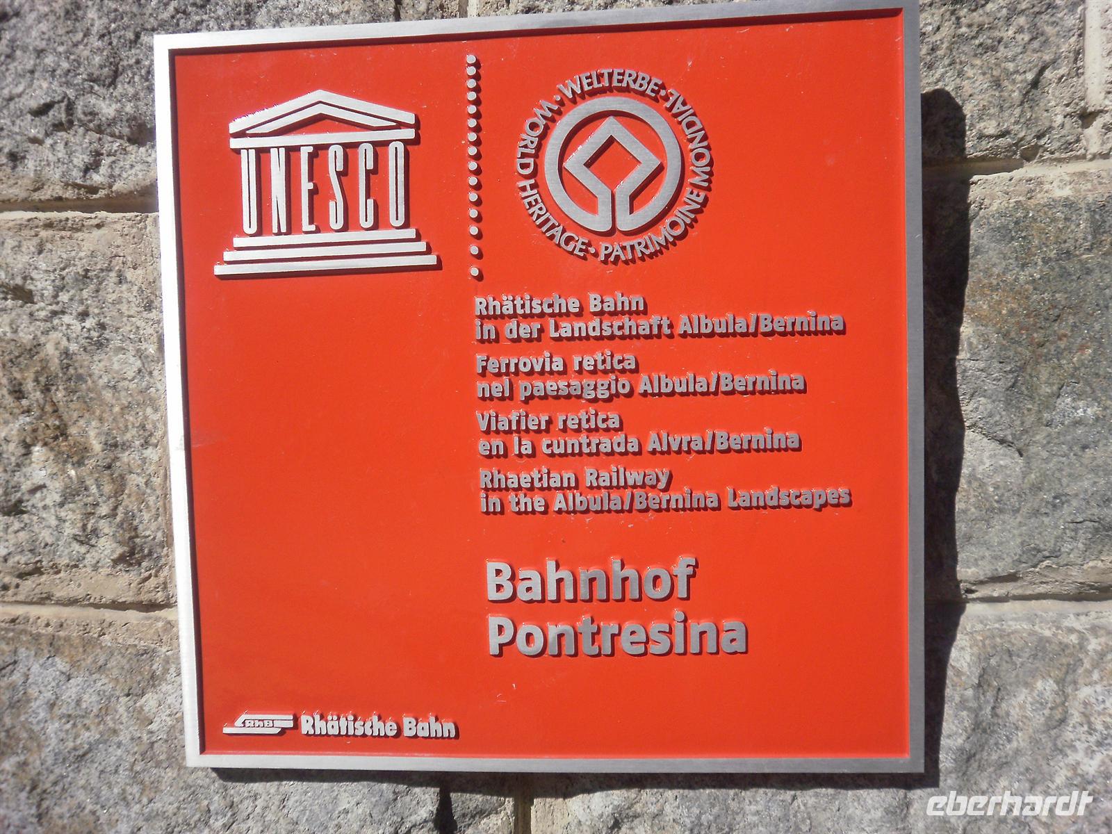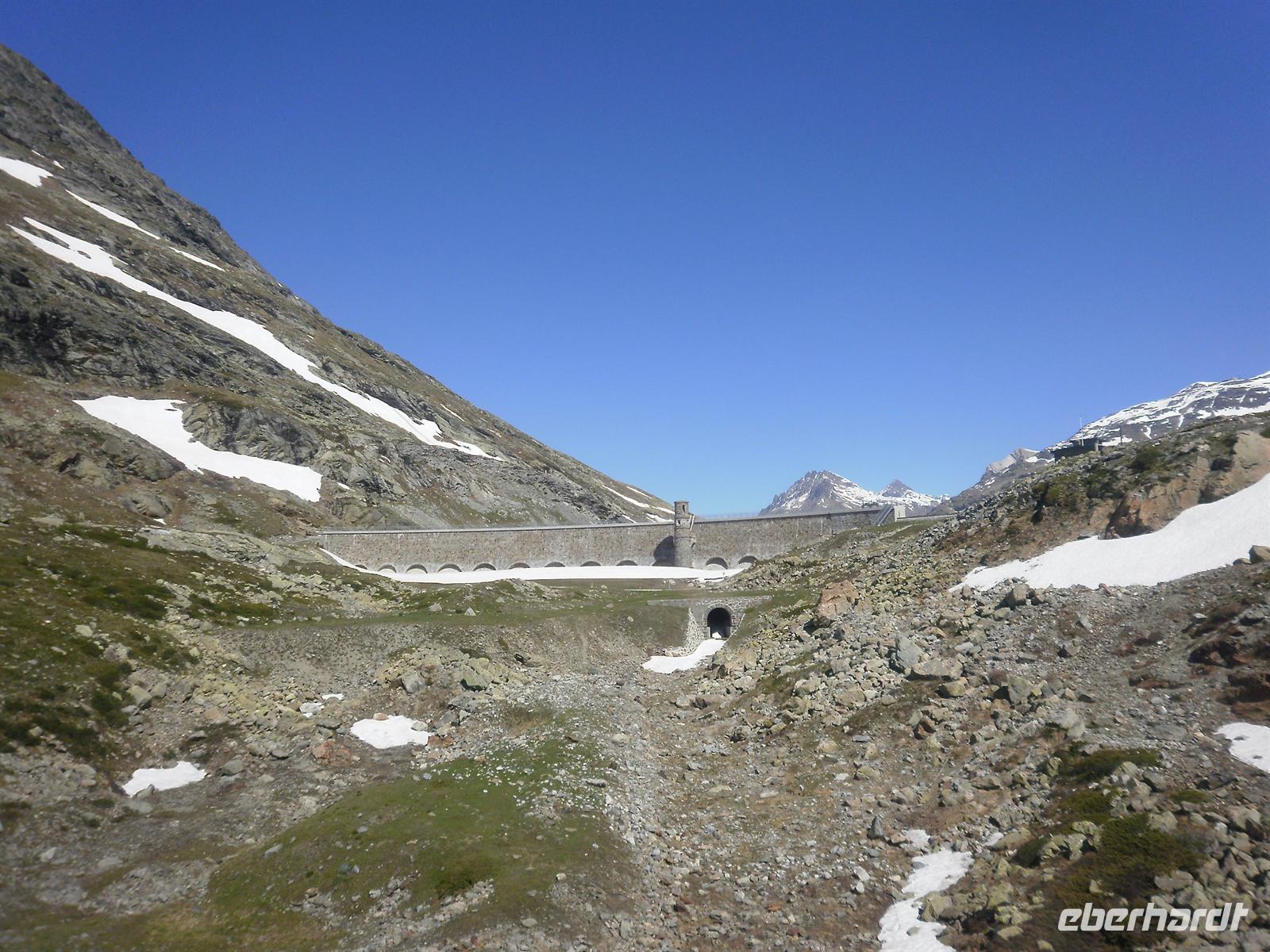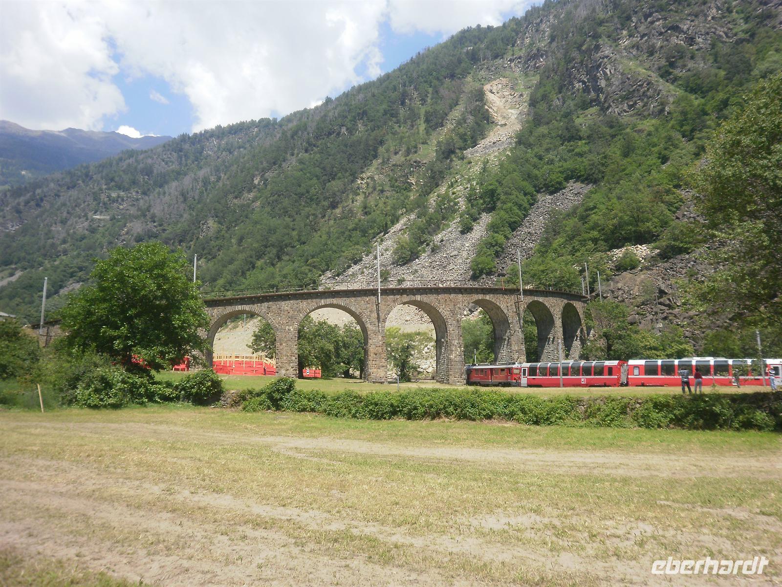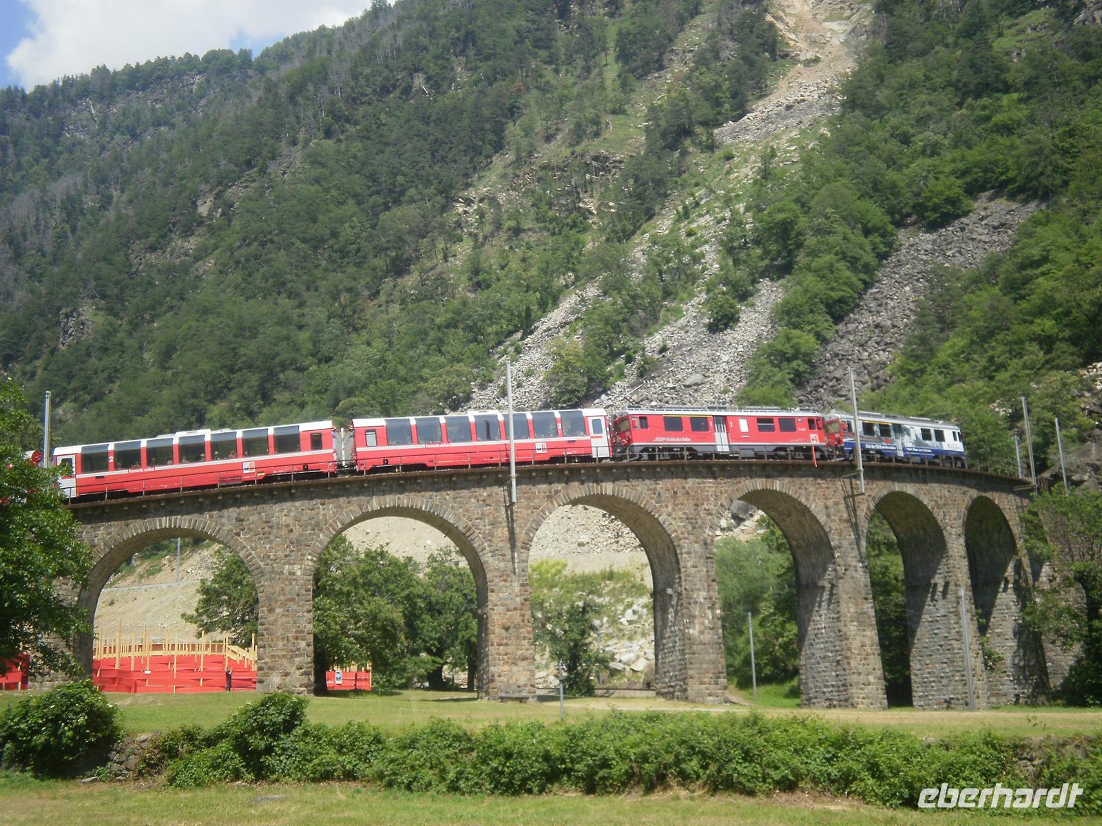Die Bernina-Linie ist die einzige Schweizerbahn, die offen über die Alpen führt. Sie wurde 1910 fertig gestellt und brachte uns von den Gletschern des Berninapasses auf 2.253 m ü. d. M. hinunter auf 429 m ü. d. M. nach Tirano. Während der Höhenunterschied zwischen Ospizio Bernina und Tirano 1.824 Meter beträgt, misst die Horizontaldistanz nur 22 Kilometer. Diese Höhendifferenz wird ohne Zahnrad-Strecken überwunden - trotz Steigungen von bis zu 70o/oo. Das ist das absolute Maximum, das eine Adhäsionsbahn noch nutzbringend bewältigen kann. Besonders raffiniert ist übrigens auch die Wahl der Linienführung. Sie ermöglicht nicht nur die Überwindung der immensen Höhenunterschiede, sie eröffnet dem Reisenden auch atemberaubende Ausblicke auf eine imposante Bergwelt, auf Gletscher und Täler.