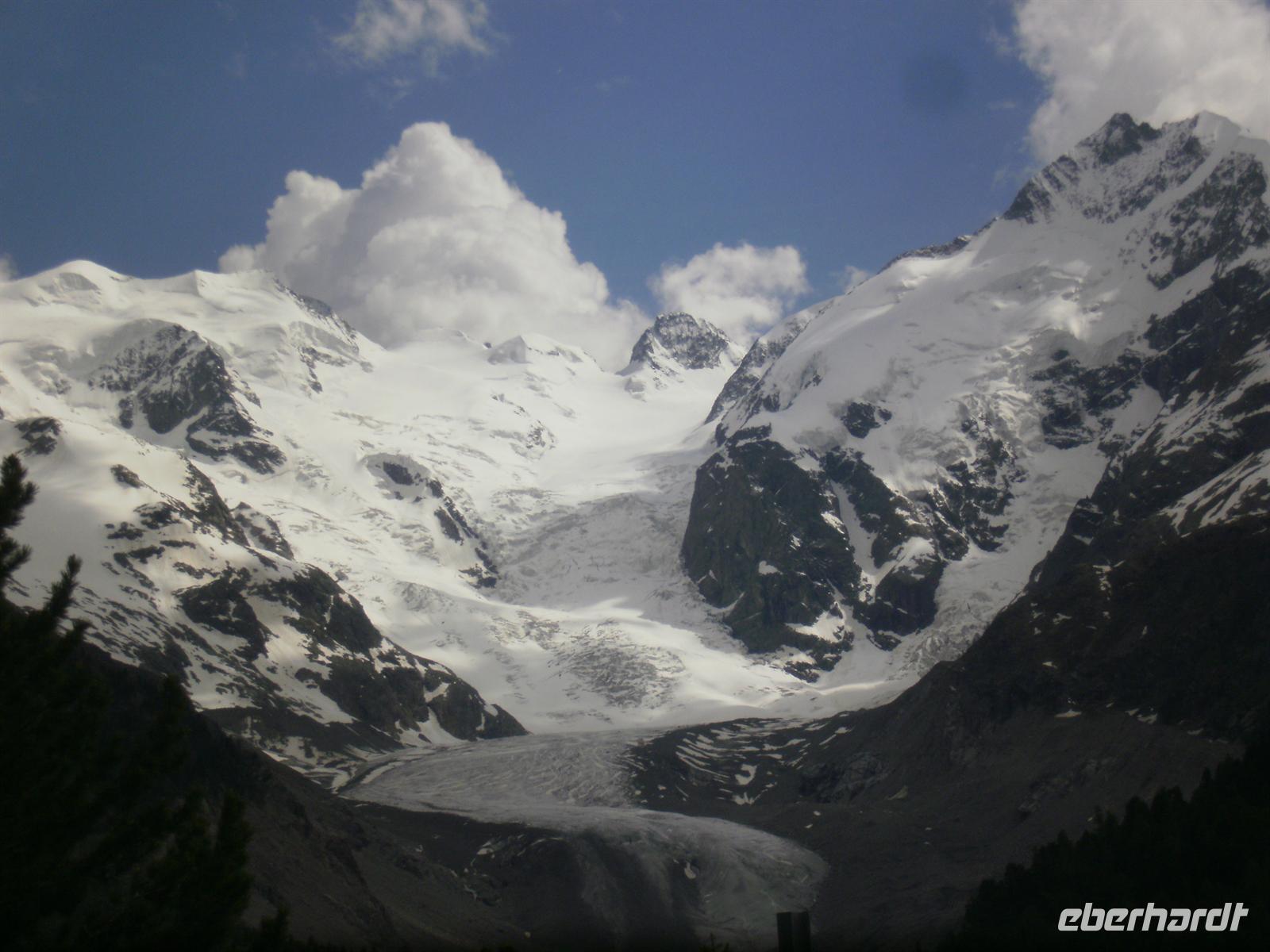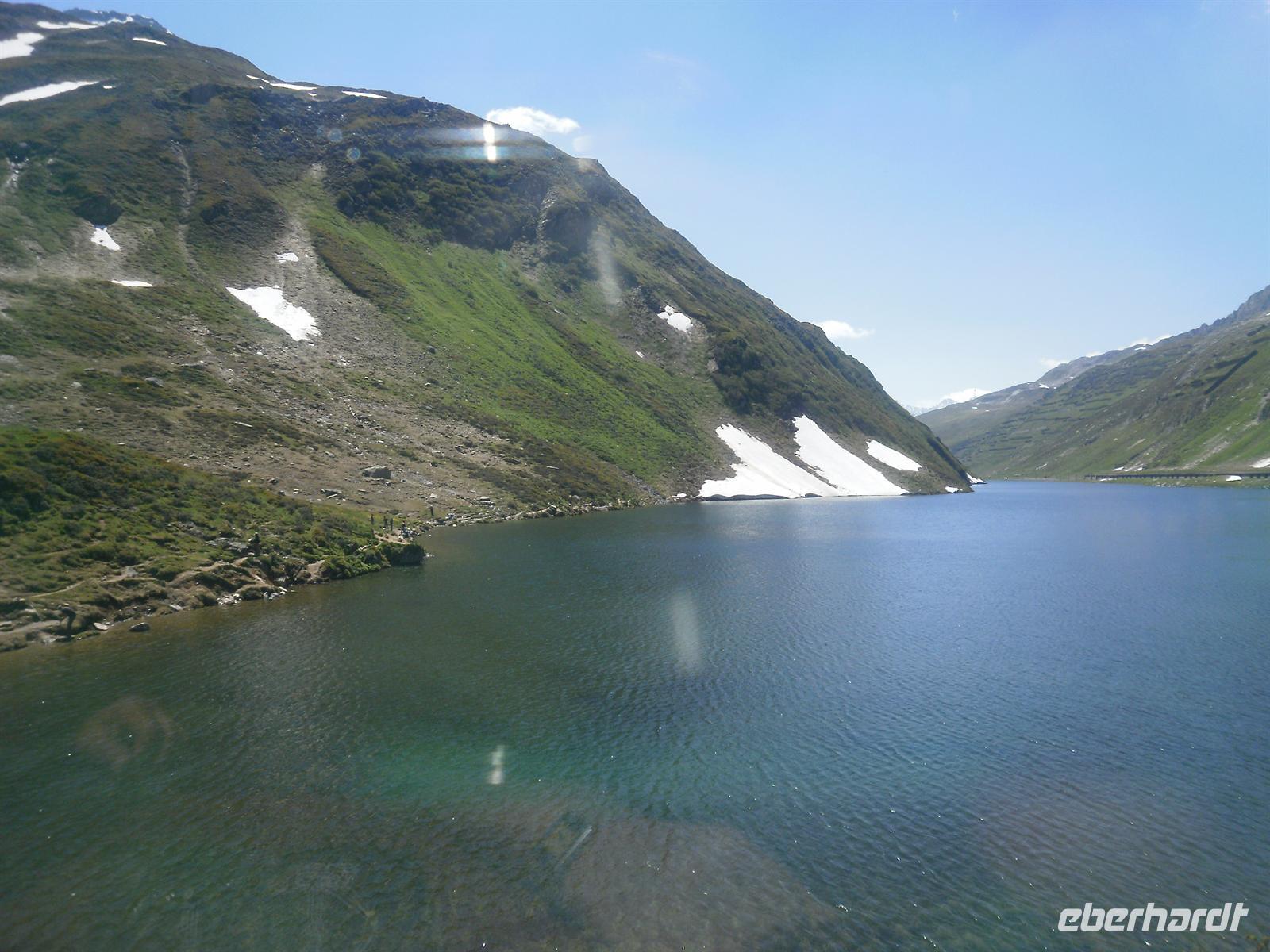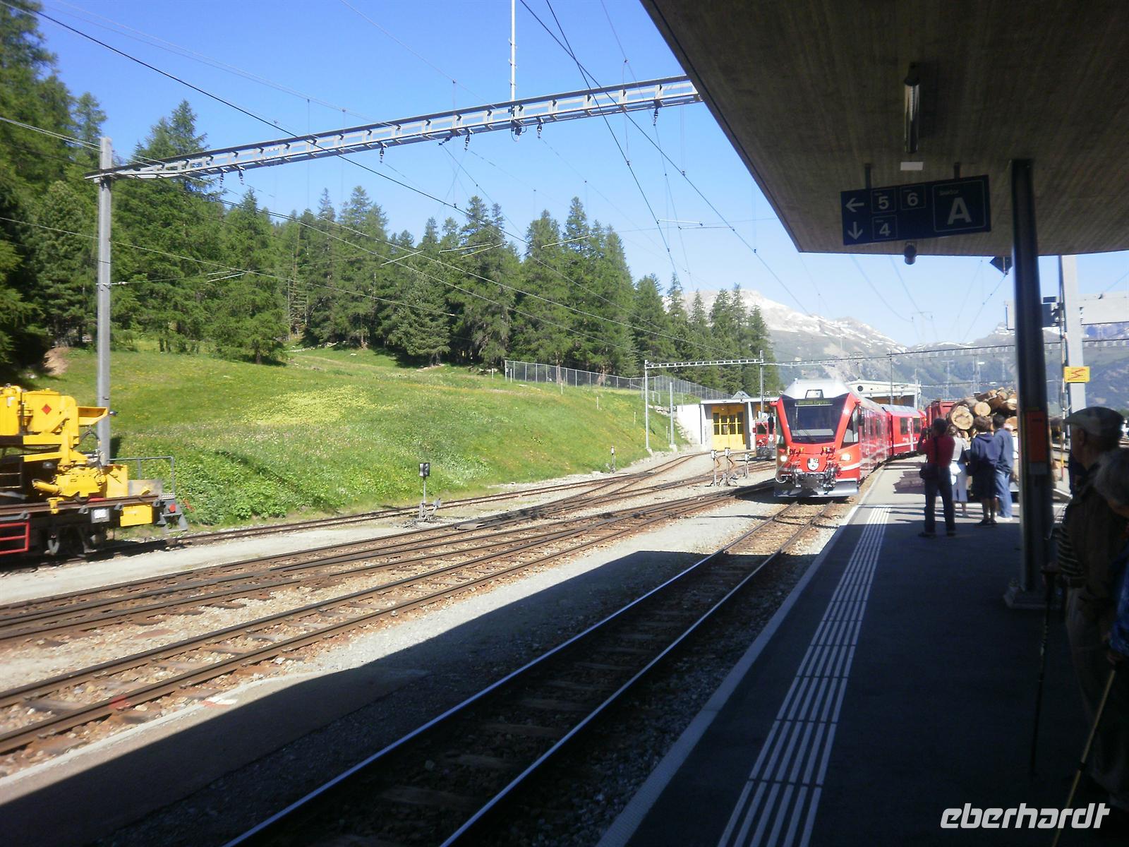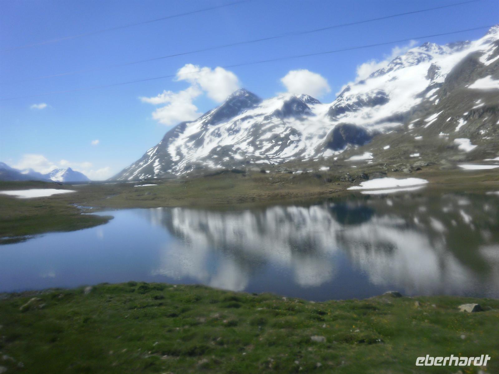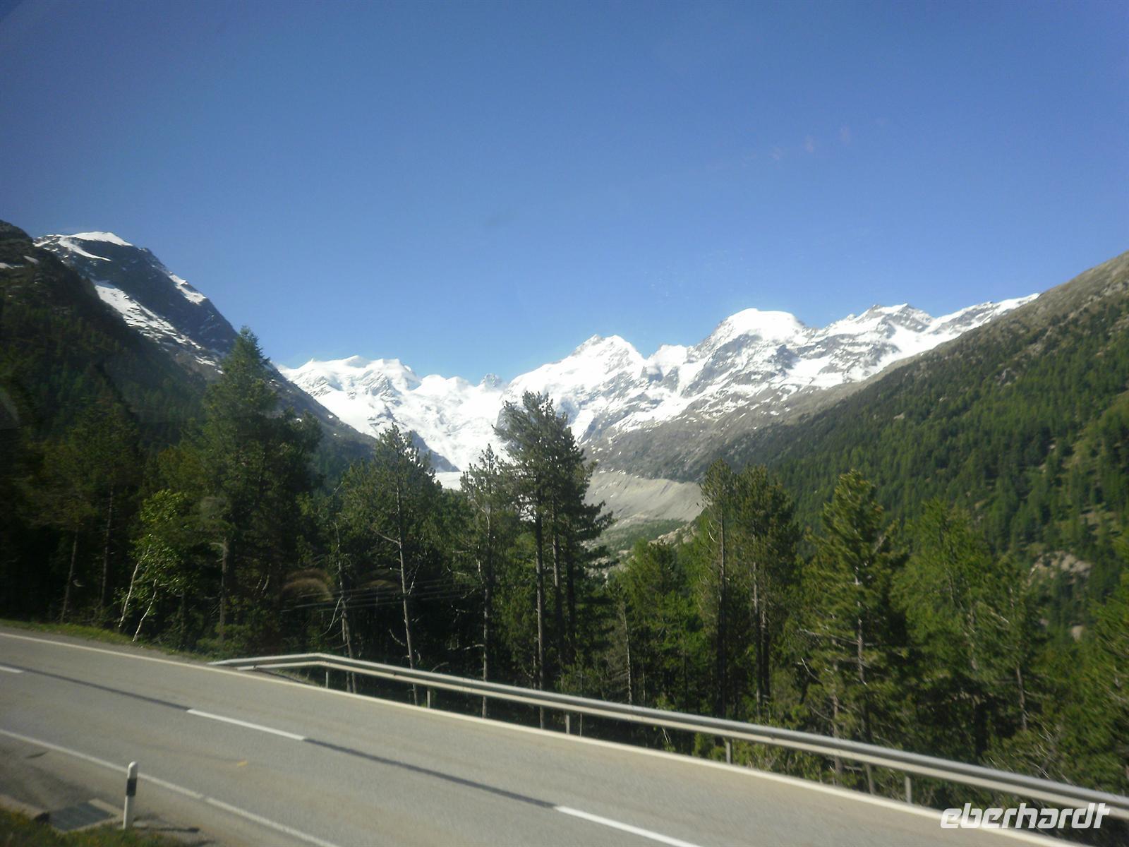 Heute stand bereits der erste Höhepunkt dieser Reise, die Fahrt mit dem Bernina-Express, auf dem Programm. Wir mussten dafür zwar zeitig aufstehen, aber das störte niemanden. Mit unserem Bus ging es über den 2.383 m hoch gelegenen Flüela-Pass nach Pontresina. Dort stiegen wir bei herrlichem Sonnenschein in den Bernina-Express ein.