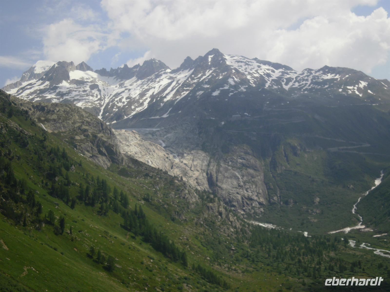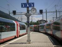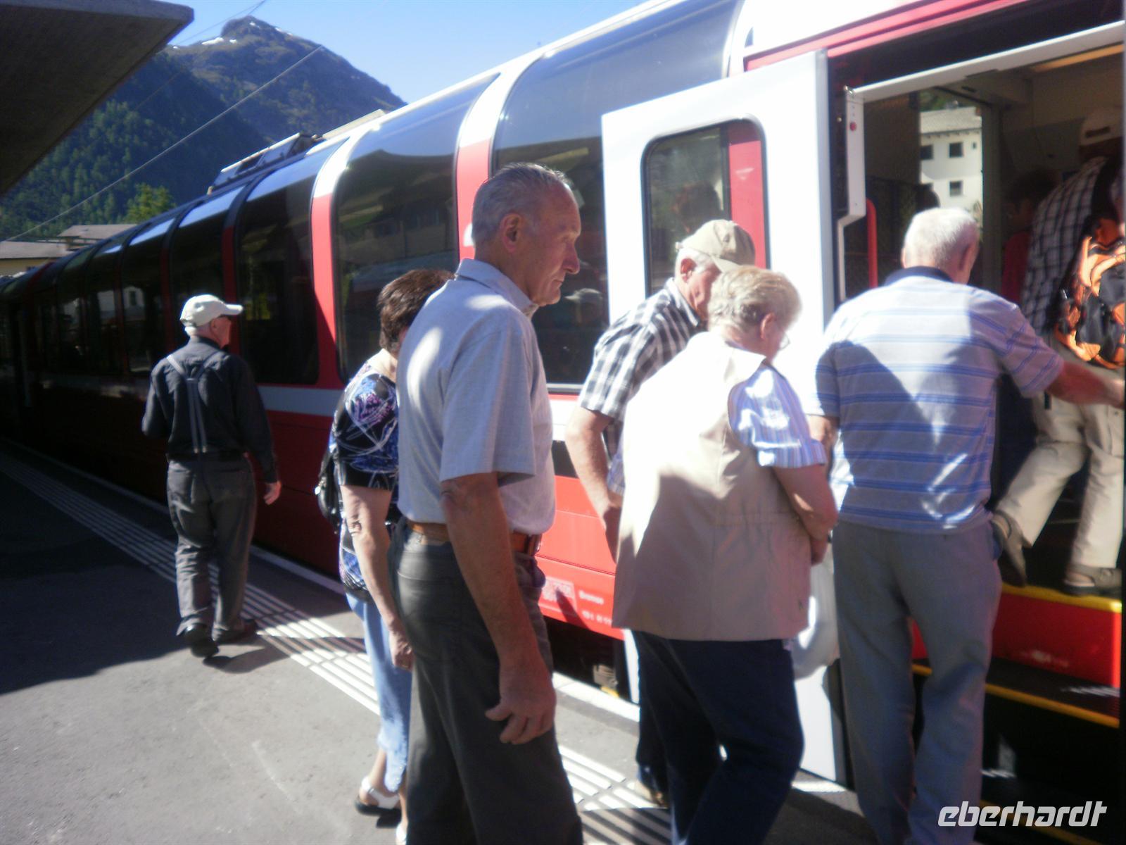 Der nächste Höhepunkt unserer Reise stand am 4. Tag an - die Fahrt mit dem "Glacier-Express". Am Vormittag spazierten wir ganz gemütlich zum Bahnhof in Davos-Platz. Zuvor verabschiedeten wir uns von unserem Buschauffeur Frank, der allein mit dem Bus und unserem Gepäck die weite Strecke bis ins Wallis zurücklegte. Nachdem wir es in unserem Panoramawagen der 2. Klasse gemütlich gemacht hatten, ging es über Filisur, Tiefencastel, Thusis, Chur, Reichenau, die Vorderrheinschlucht, Disentis, über den 2.033 Meter hohen Oberalppass, Andermatt, das Goms, Brig und Visp nach Zermatt. Die Bahnfahrt mit dem langsamsten Schnellzug der Welt dauerte etwa acht Stunden, aber keine Angst - niemandem von uns wurde langweilig. Das Landschaftsbild verändert sich ständig und es gibt verdammt viel zu sehen...! Zudem wurden wir zum Mittagessen mit einem Prättigauer Bauernteller verwöhnt, einer kalten Platte mit Bündner Fleisch, Käse und Brot. Mit durchschnittlich 35 km/h legt der Glacier-Express die etwa 280 Kilometer lange Strecke von Davos nach Zermatt zurück.