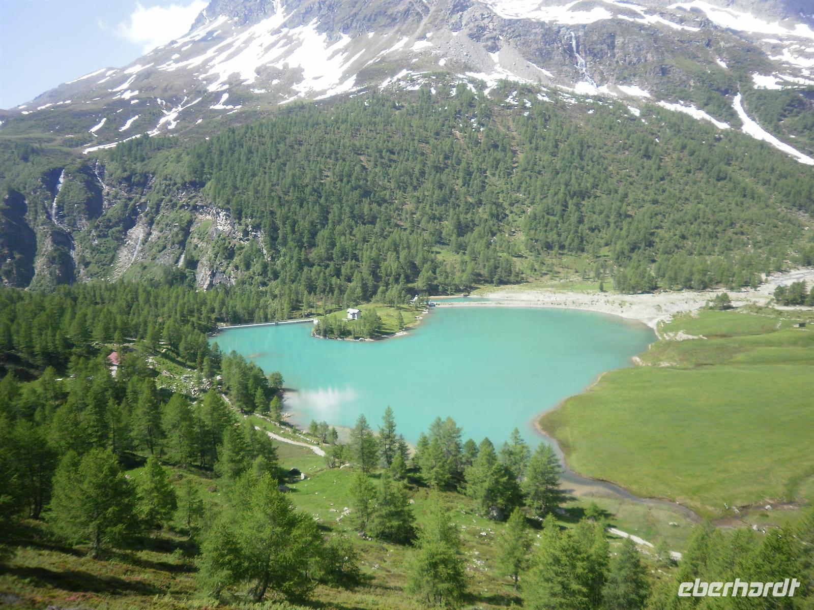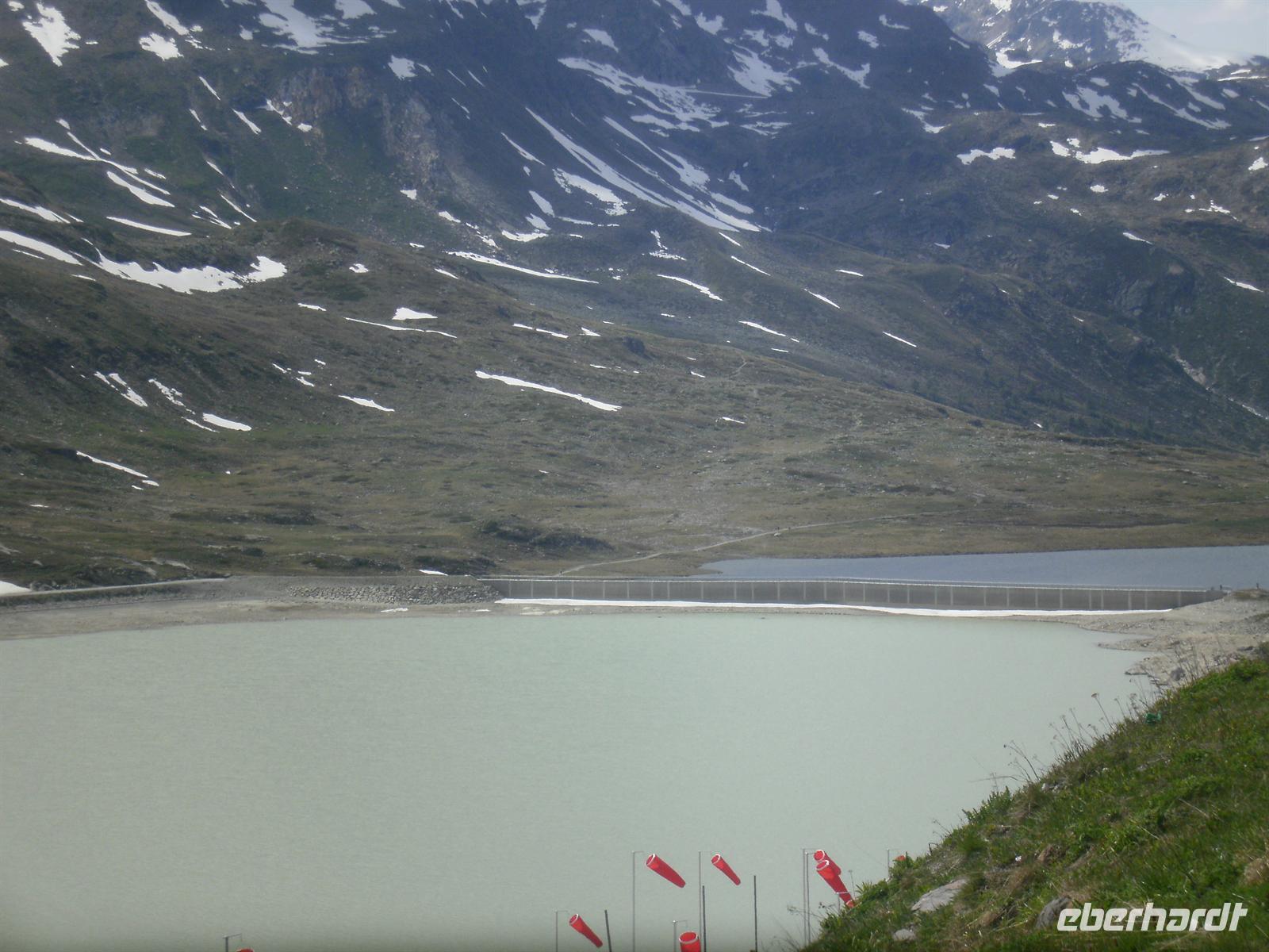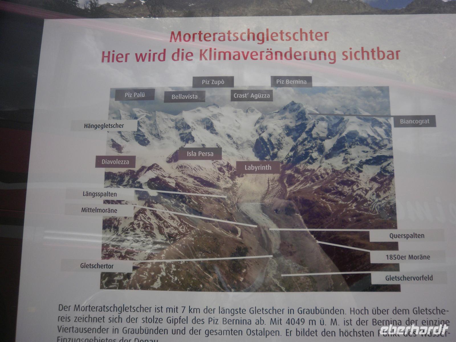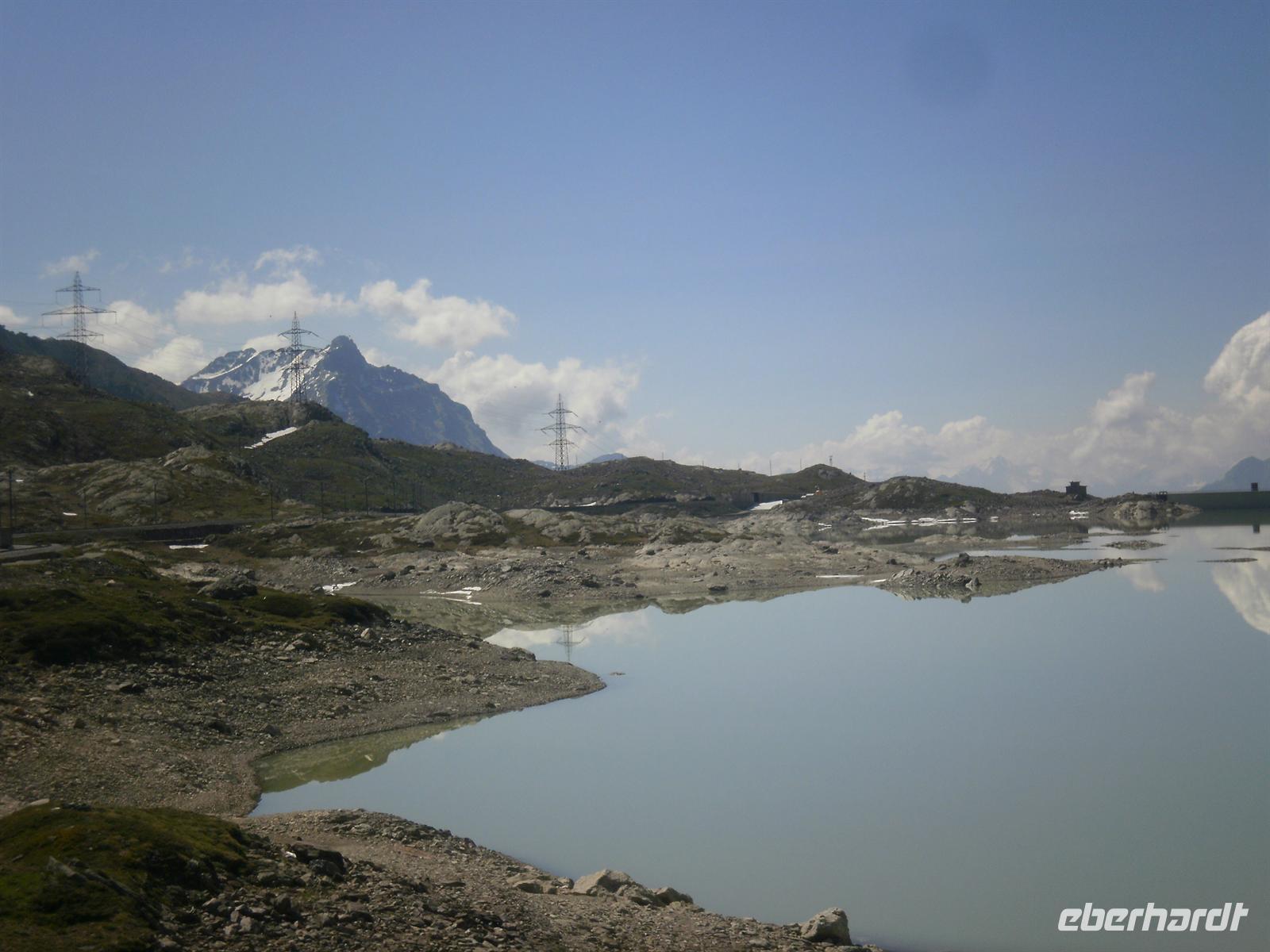 Brusio sollte unser erstes Ziel sein, denn dort erlebt man eine wahre Einzigartigkeit - der Bernina-Express beschreibt eine Schleife über einen Kreisviadukt. 107 Meter ist er lang, und er dürfte zu den meistfotografierten Bauwerken der Rhätischen Bahn zählen. Diese 360-Grad-Kehre bringt wertvolle Höhenmeter, ein Griff in die Trickkiste der Bahnbauer, der sonst nur bei Kehrtunnels angewendet wird. Wir warteten auf einen Bernina-Zug, damit unser Foto perfekt war. Weiter hinauf ging es zum Lago di Poschiavo, wo wir zum See spazieren konnten. Durch die Ortschaften des Val di Poschiavo, einem italienischsprachigen Südtal des Kantons Graubünden, erreichten wir die Bernina-Passstraße. Diese ist gewöhnlich ganzjährig geöffnet und stellt die Verbindung zwischen dem Puschlav im Süden und dem Engadin im Norden dar. Damit ist der Pass gleichzeitig eine Sprachgrenze. Eine gelbe Tafel auf dem Pass signalisiert die Europäische Wasserscheide, das Wasser in Richtung Süden gelangt über die Flüsse Poschiavino, Adda und Po ins Adriatische Meer und das Wasser in Richtung Norden wird über den Inn und die Donau ins Schwarze Meer geleitet. Nach einem Aufenthalt auf dem Bernina-Pass ging es mit einem kurzen Stopp mit Blick auf den Morteratsch-Gletscher zurück über den Flüela-Pass nach Davos. Nun ging ein langer und erlebnisreicher Tag zu Ende